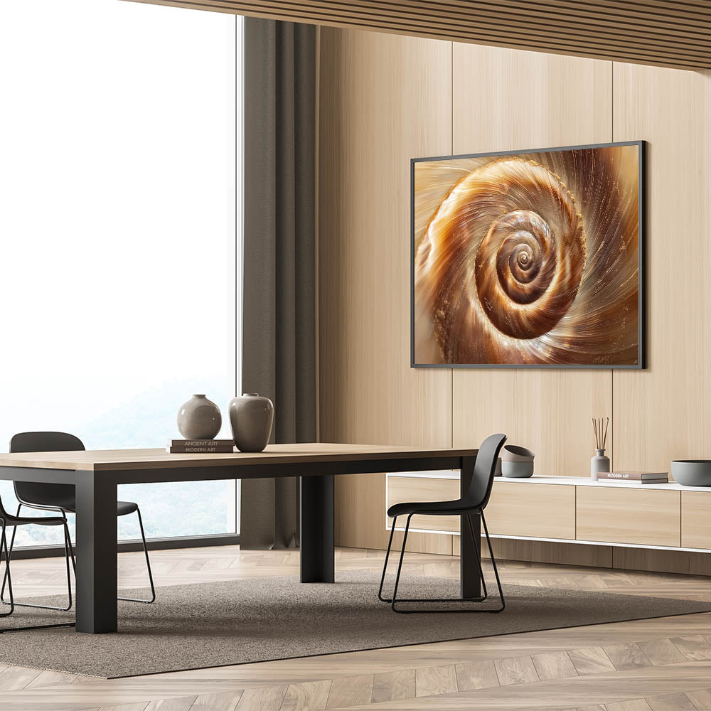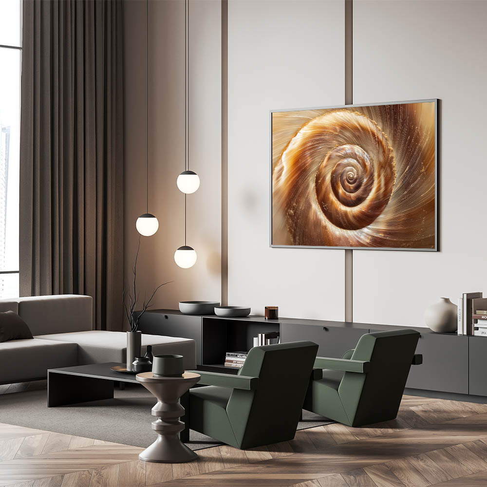 - Nature-Inspired Design: Highlights the natural patterns and warm tones of a spiral shell.