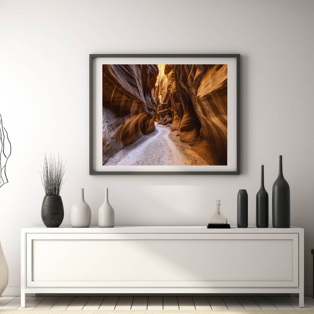 Step into nature's wonder with this golden canyon pathway wall art, featuring mesmerizing curves and textures illuminated by warm golden tones. This stunning design captures the serene beauty of winding canyon trails, making it a perfect addition to any home or office decor. Ideal for nature lovers and art enthusiasts, it offers a timeless and inviting focal point.