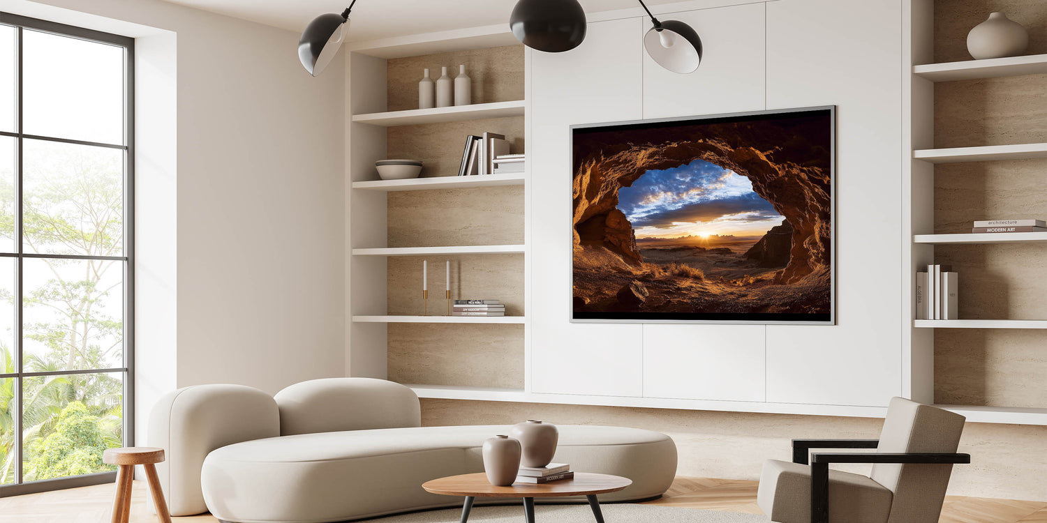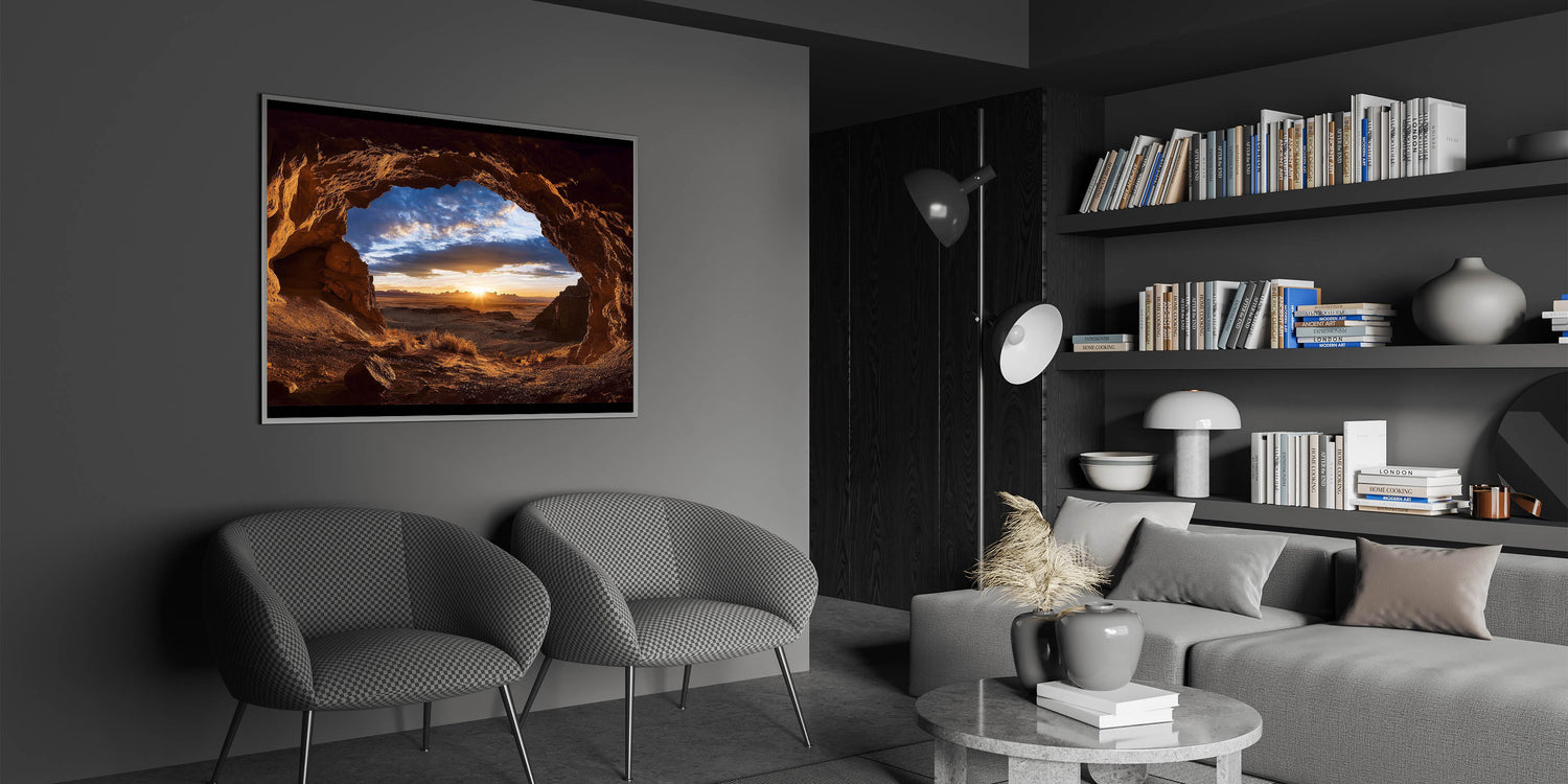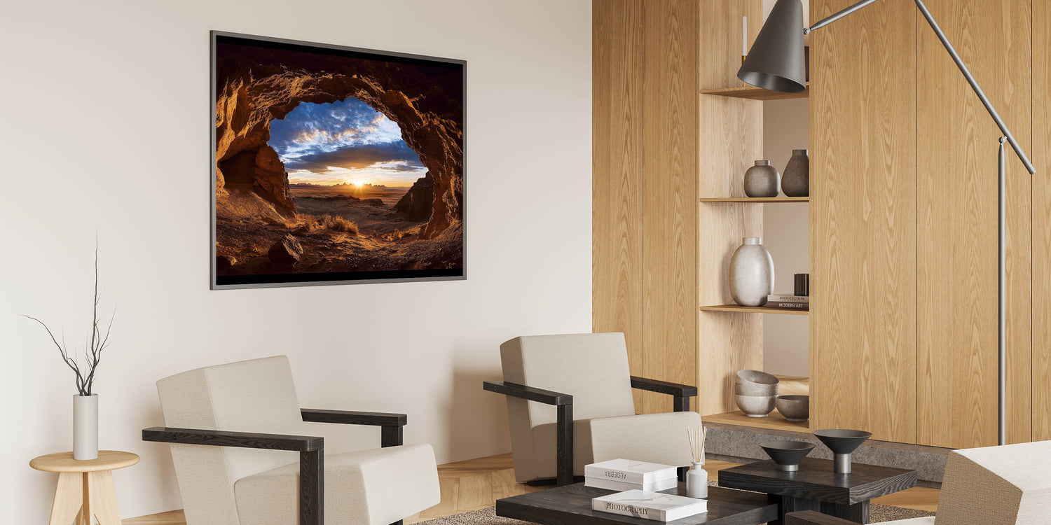 Bring the peaceful beauty of a desert sunrise into your home with this scenic cave photography. Whether displayed as a centerpiece or an accent, this artwork transforms your space into a tranquil retreat. Celebrate the wonders of nature with this radiant and captivating piece.