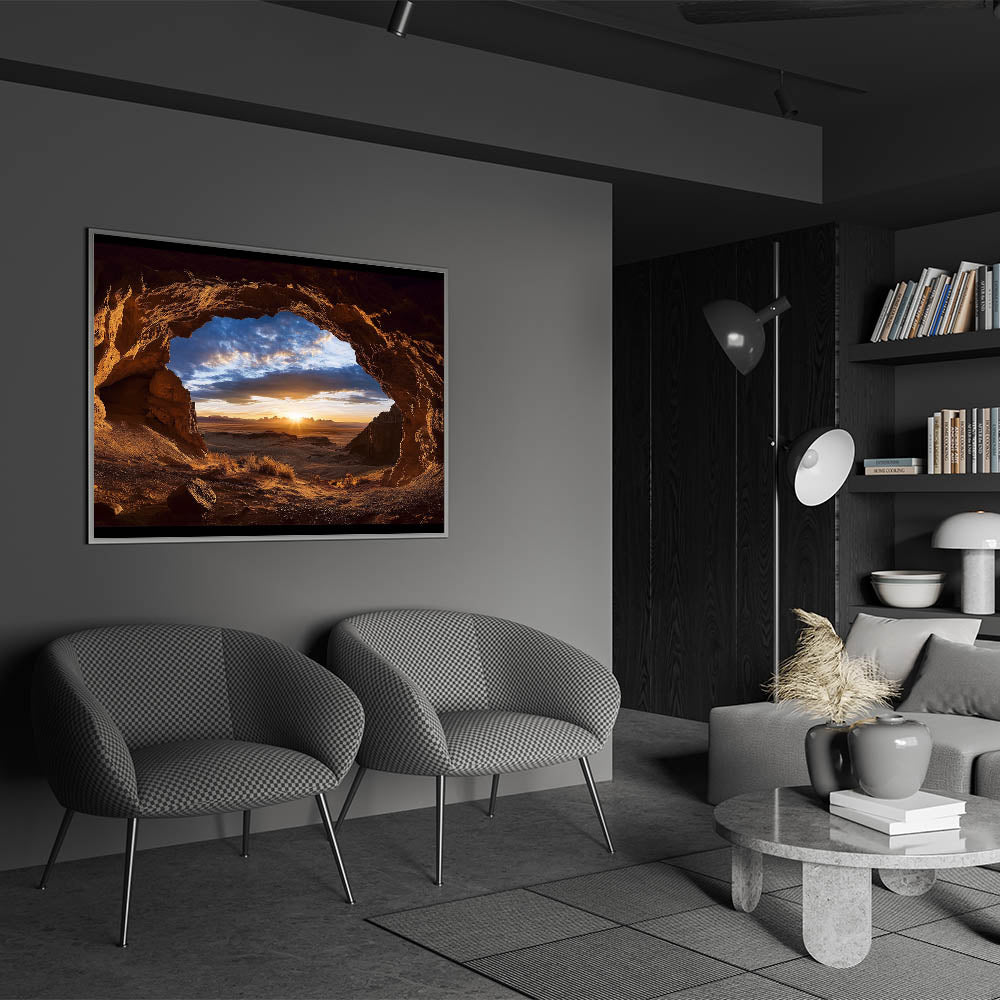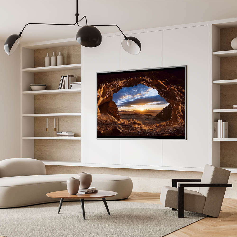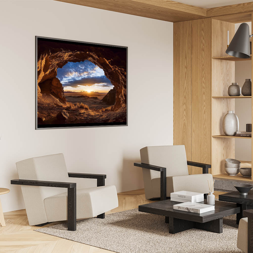 Elevate your decor with this stunning cave wall art, capturing a serene desert sunrise framed by the rugged beauty of a natural cave. The warm golden tones of the sunrise blend harmoniously with the textured cave walls, creating a breathtaking composition that celebrates the splendor of nature. This artwork offers a perfect balance of light, shadow, and color, making it ideal for modern, rustic, or nature-inspired interiors.