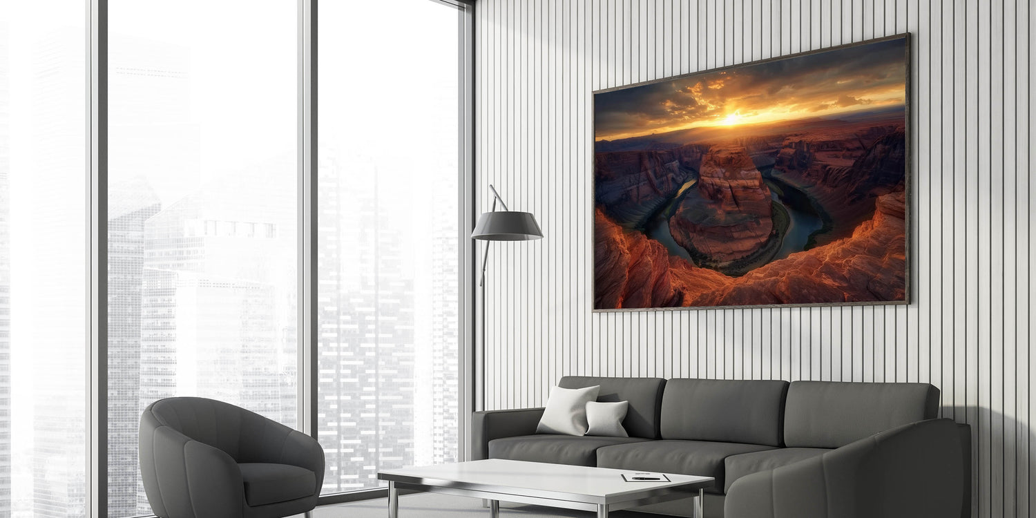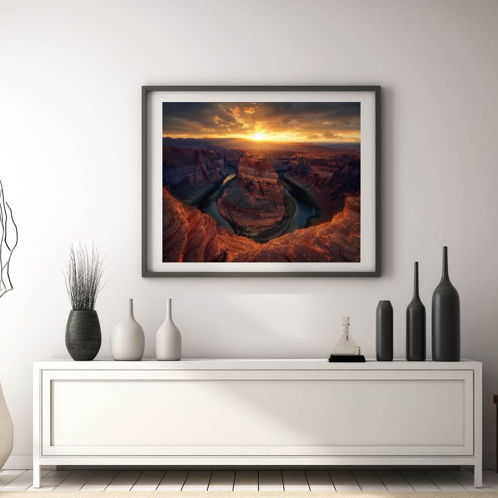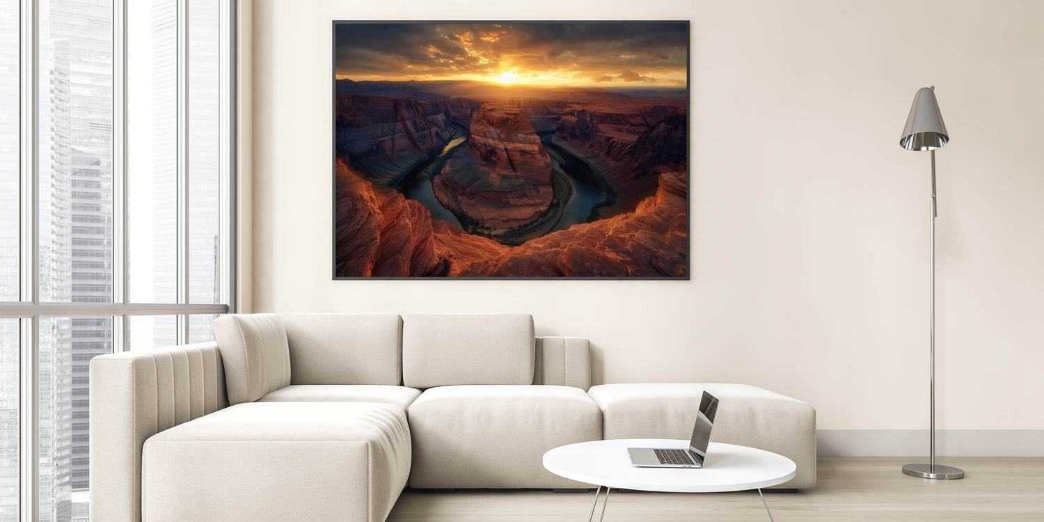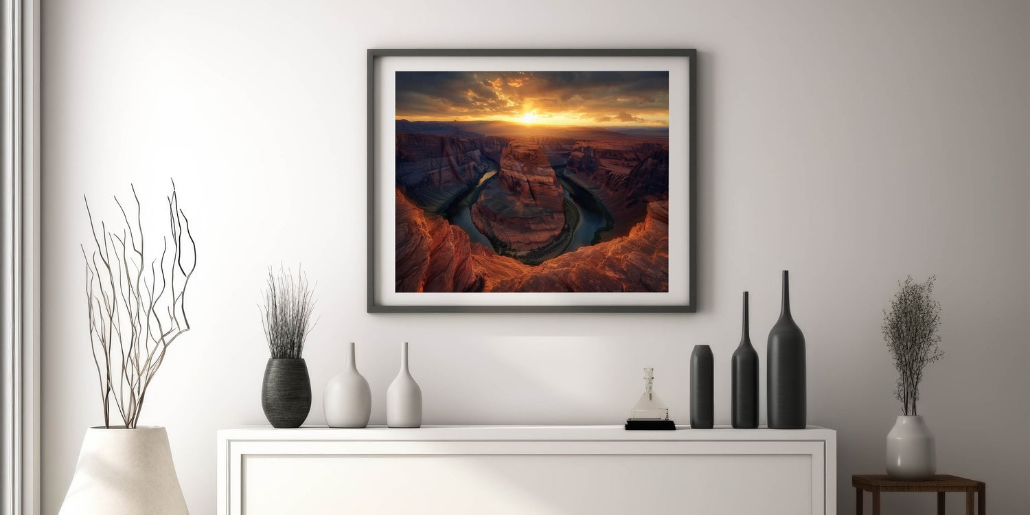 - Combines the warmth of golden hour tones with the grandeur of canyon landscapes for a timeless masterpiece.
