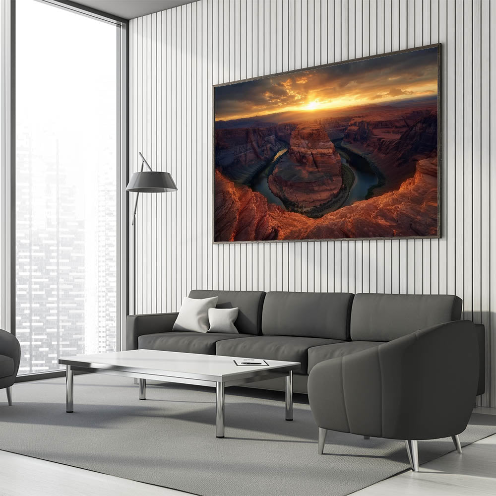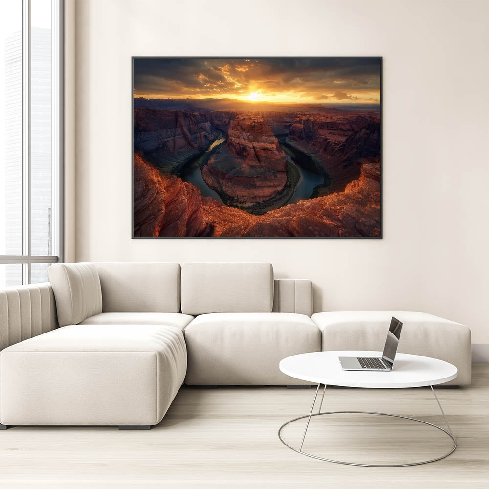 Capture the majestic beauty of this golden hour canyon wall art, featuring a stunning sunset illuminating the rugged canyon cliffs and a winding river below. The rich, warm tones and dramatic lighting bring this serene landscape to life, making it a perfect addition for nature enthusiasts and art lovers seeking to add depth and elegance to their space.