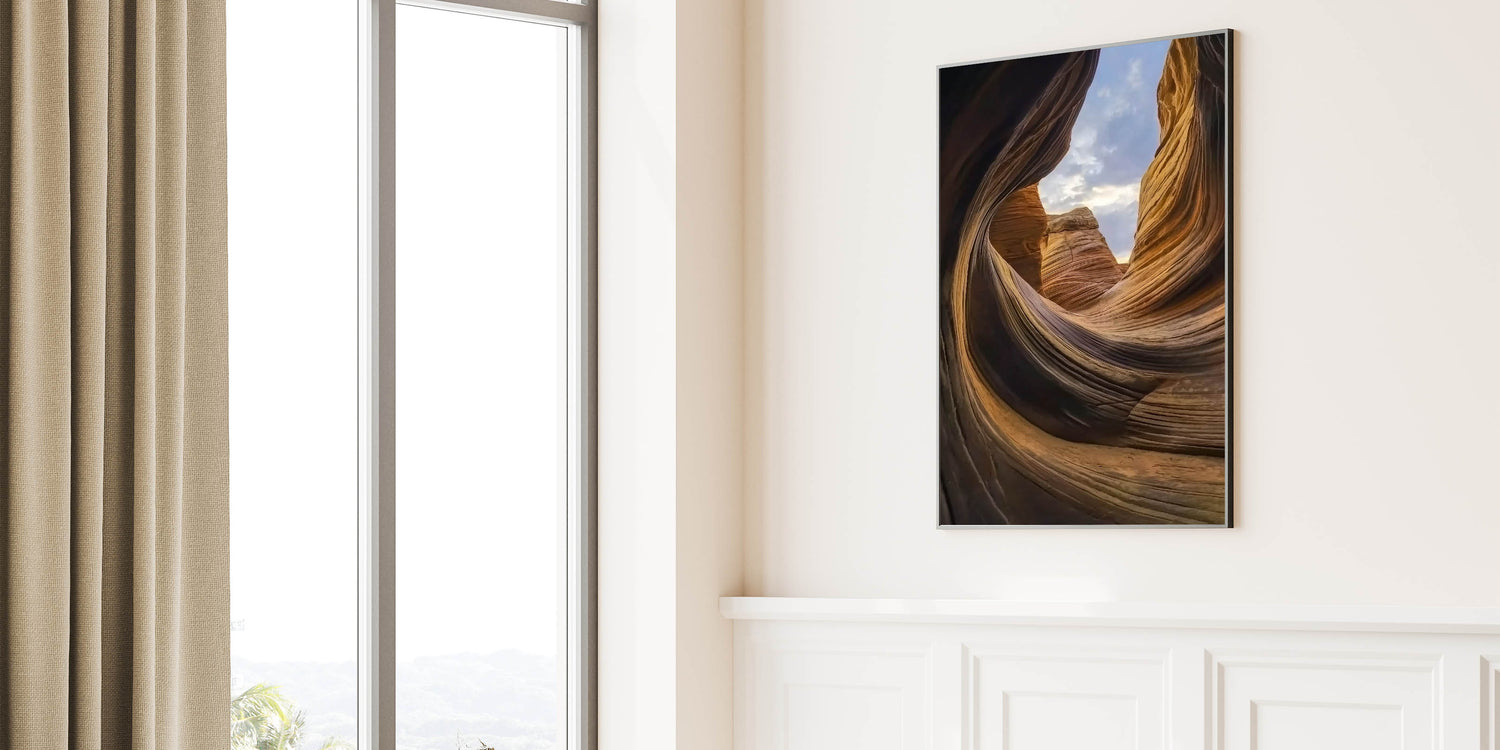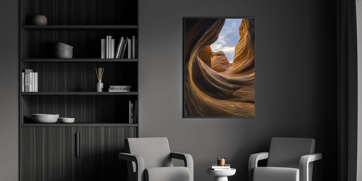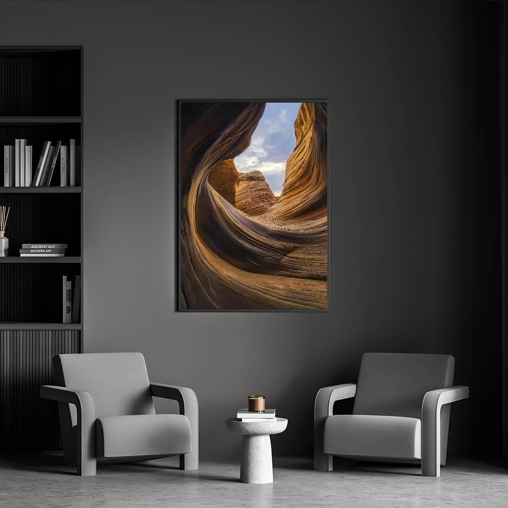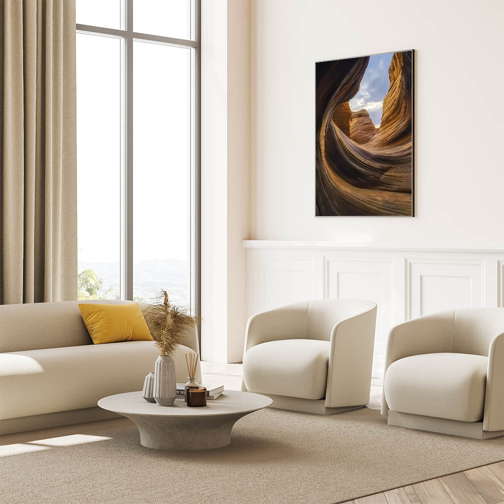 Step into the enchanting beauty of a canyon bathed in golden hour light with this abstract nature wall art. The smooth, flowing curves of the canyon walls are beautifully illuminated, creating a mesmerizing interplay of warm tones and natural textures. Framed by an open sky, this piece captures the perfect balance of elegance and raw natural beauty, making it a standout addition to your decor.