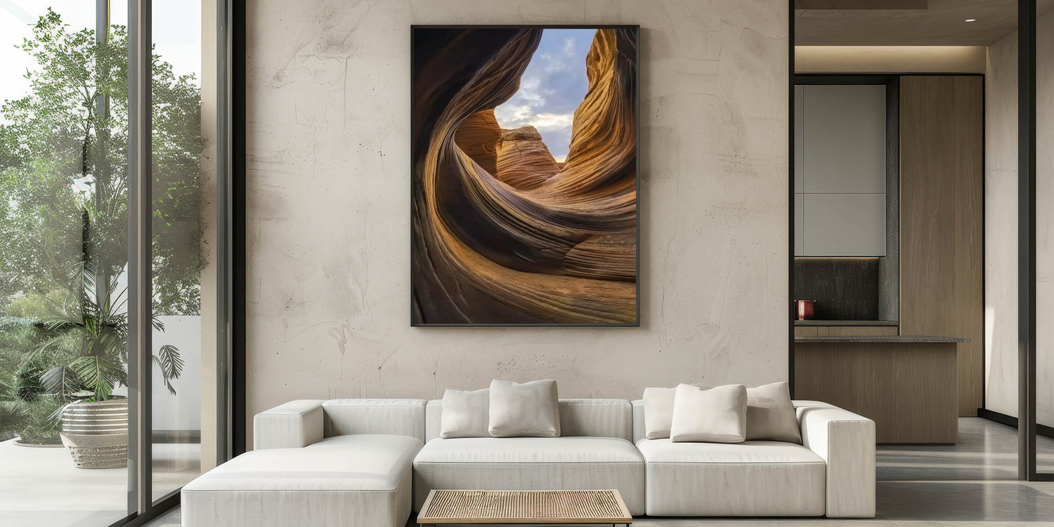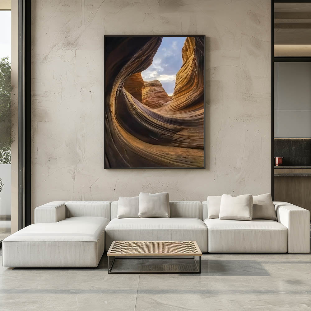 Elevate your living or office space with this high-quality canyon artwork. Its warm tones and captivating textures make it a versatile piece that adds charm and tranquility to any room.