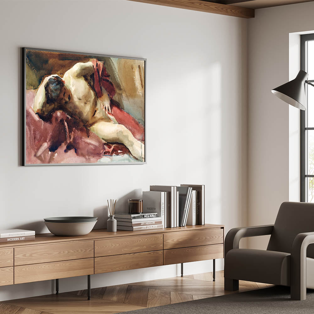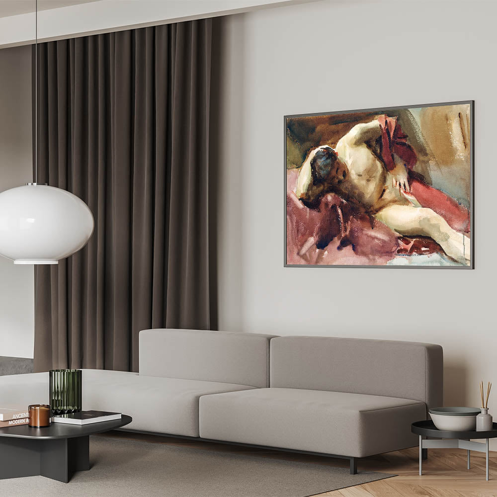 Embrace the expressive beauty of John Singer Sargent’s "Italian Model." This Impressionist figure study, painted in Sargent's masterful watercolor technique, captures the reclining form of a model draped in rich, earthy tones. The loose, expressive brushstrokes create a sense of warmth and intimacy, drawing viewers into the serene, contemplative mood of the painting. Ideal for art lovers who appreciate the elegance and subtlety of figure studies, this piece brings a touch of classic sophistication to any room.