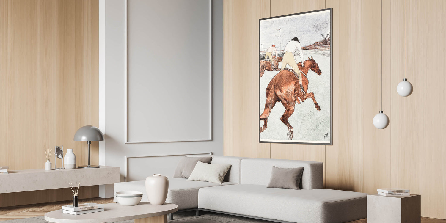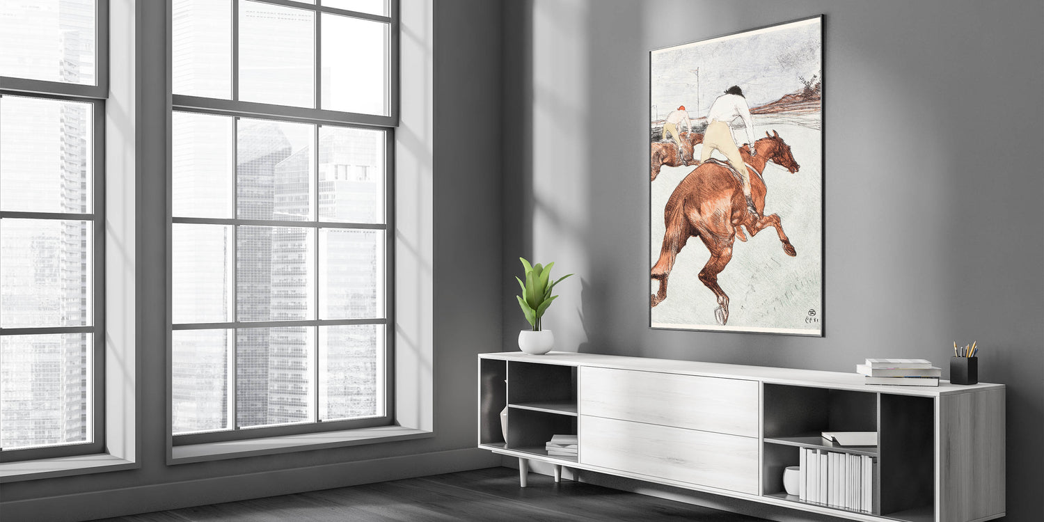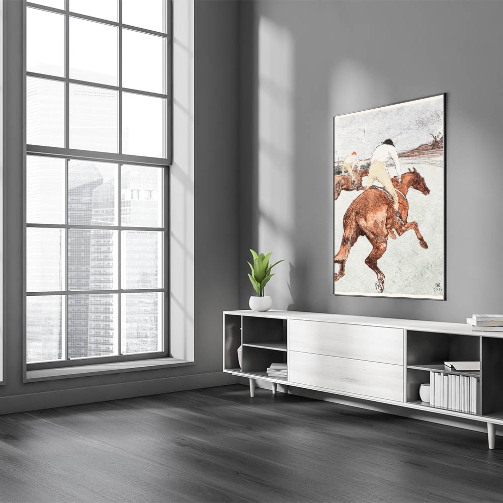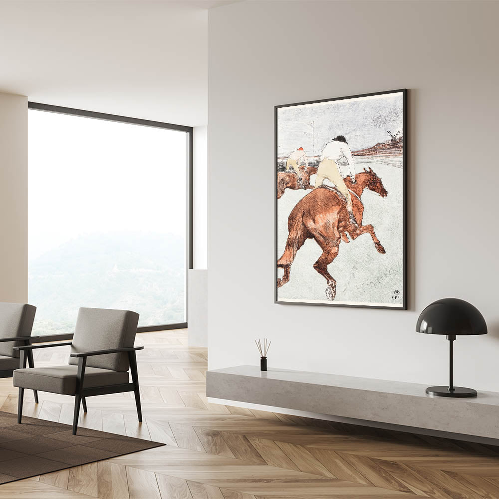 Bring the thrill of the racetrack into your space with "The Jockey" by Henri de Toulouse-Lautrec. This striking Impressionist artwork captures the energy and motion of horse racing with dynamic lines and rich, earthy tones. The carefully crafted details of the jockeys and horses create a sense of movement, while the soft background evokes a serene yet lively atmosphere.