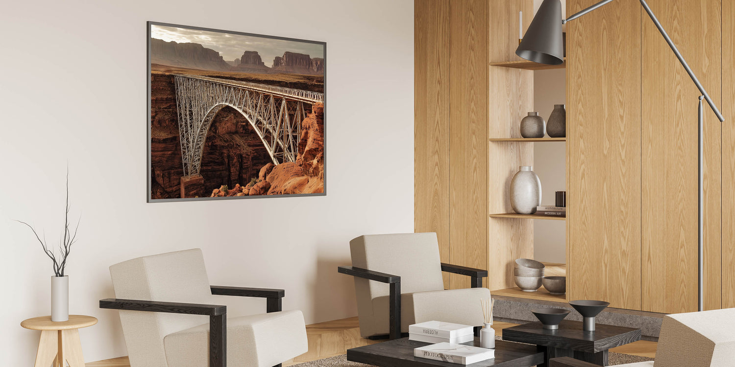 - High-quality bridge canvas prints available in multiple formats, including Stretched Canvas, Framed Canvas, Acrylic Glass, and Framed Acrylic Glass.