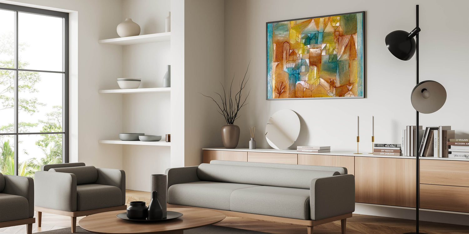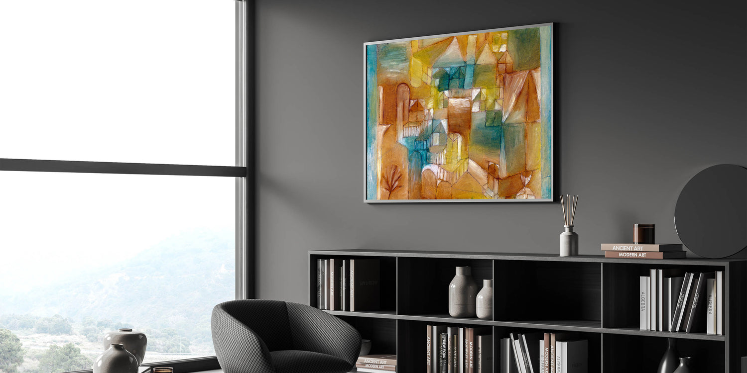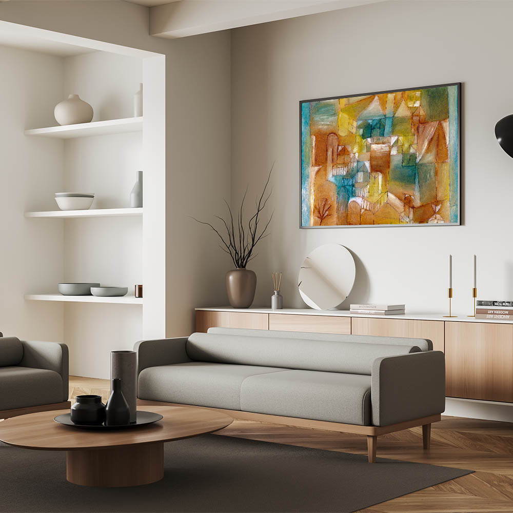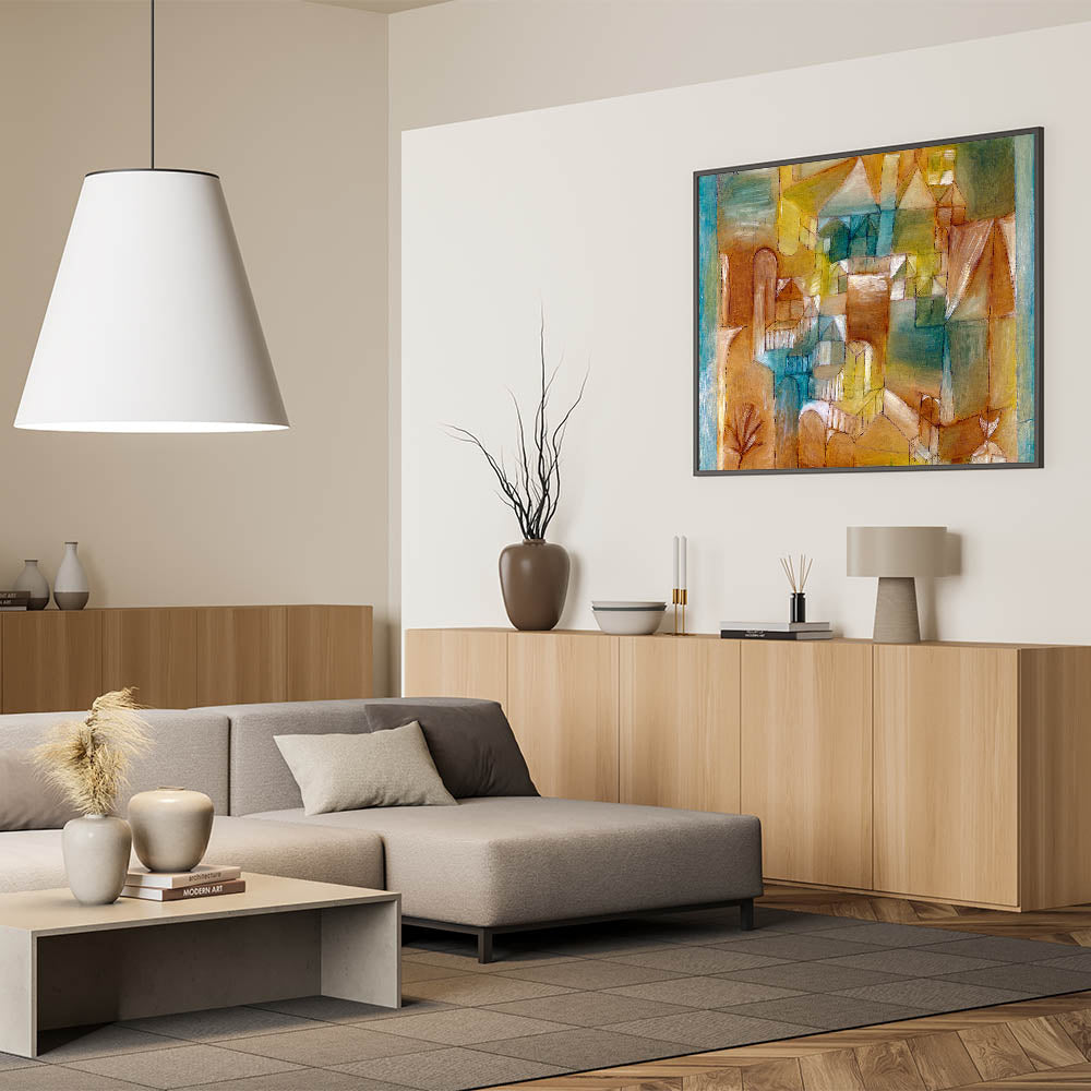 Transform your space with this captivating Modern Wall Art, featuring an abstract architectural composition inspired by Paul Klee's unique artistry. The piece showcases a blend of geometric forms and earthy tones, including warm browns, greens, and soft blues. Perfect for Trendy Home Decor, this artwork combines structure and creativity, making it a sophisticated addition to any room.