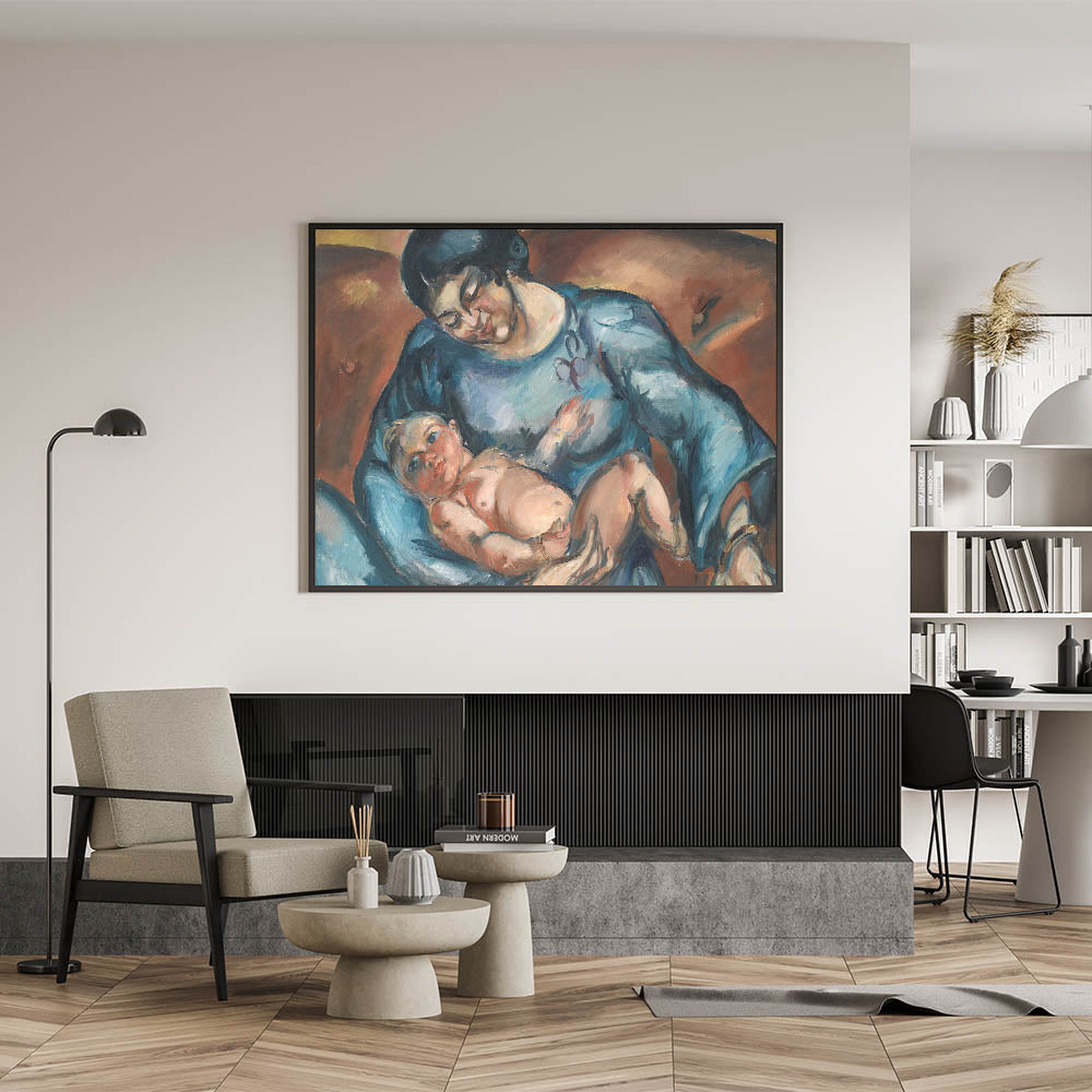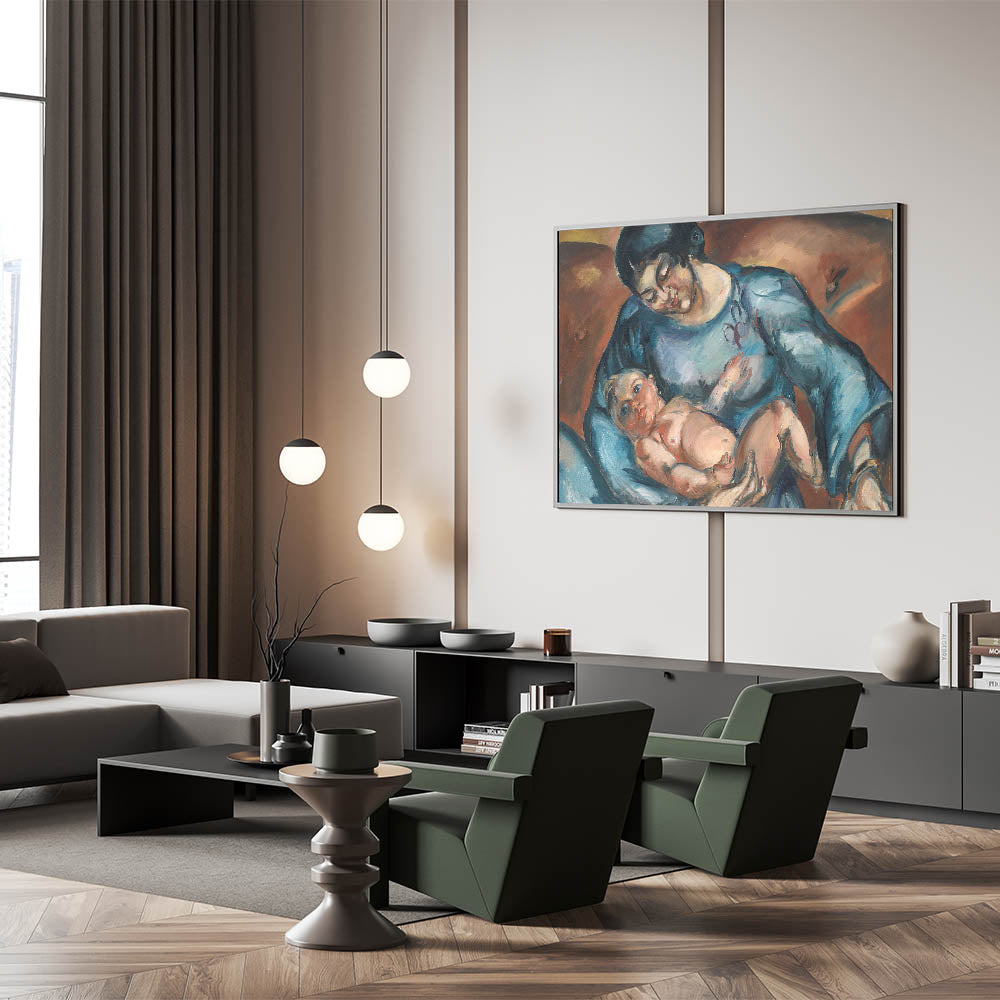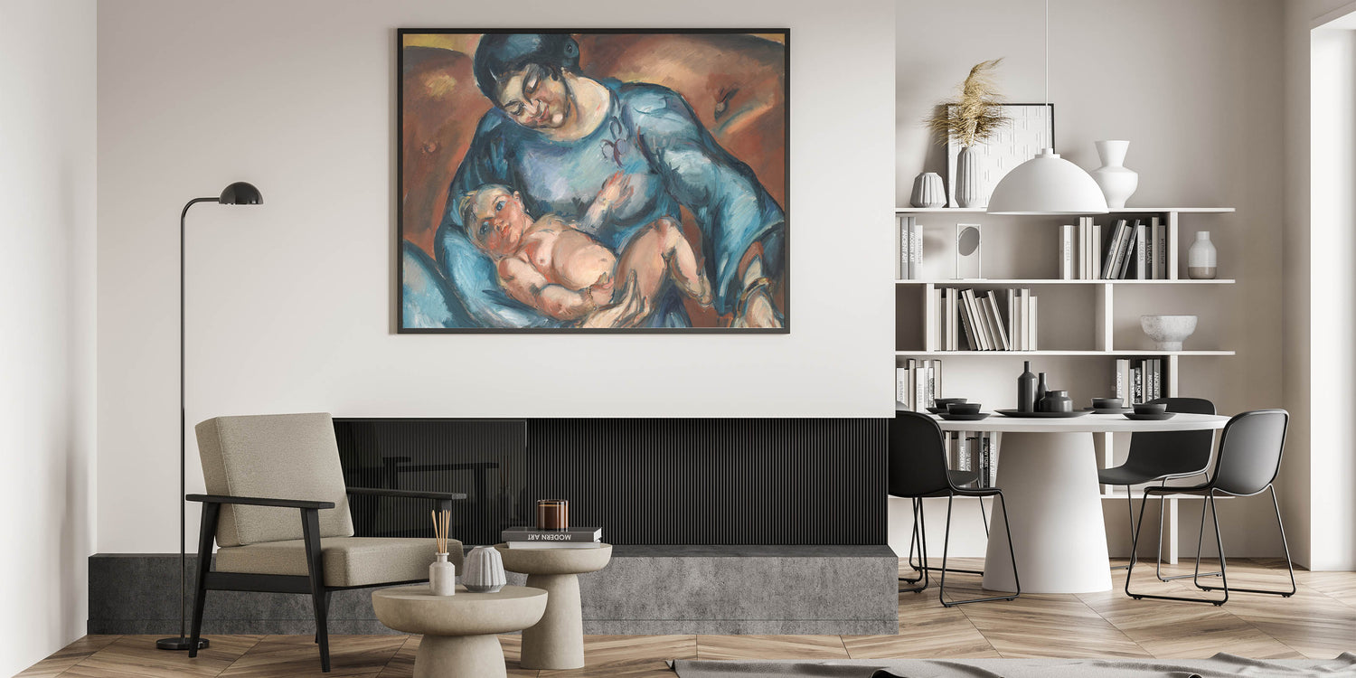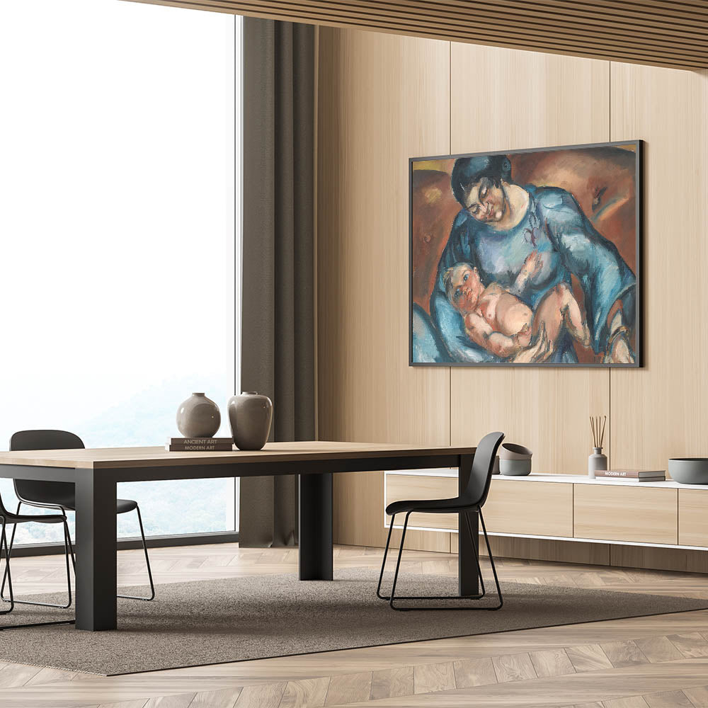 Celebrate the timeless bond between mother and child with this captivating piece of modern wall art. The artwork, titled "Mother's Love," portrays an intimate moment of tenderness and care, rendered in rich hues of blue and warm earthy tones. This abstract modern art design adds emotional depth to any living space while embodying minimalist modern decor.