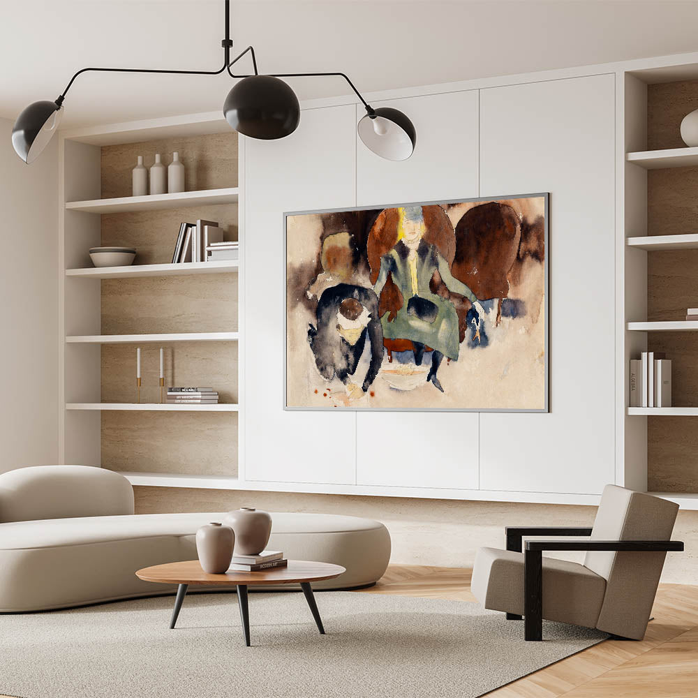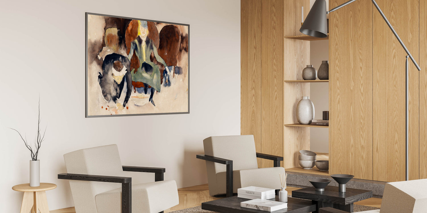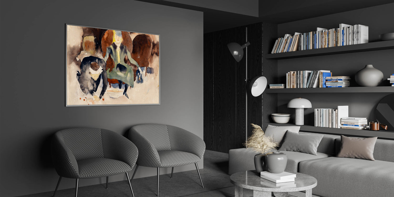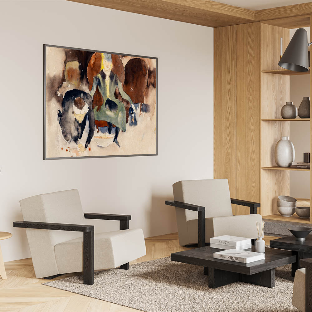 Add a touch of emotional depth to your decor with this modern wall art, inspired by Charles Demuth’s Scene after Georges Stabs Himself with the Scissors (1916). This evocative watercolor captures an intimate, dramatic moment with muted tones of beige, brown, and green, accented by subtle splashes of blue and yellow. The soft, fluid brushstrokes create an atmosphere of raw emotion and vulnerability, perfect for lovers of contemporary art with narrative intensity.