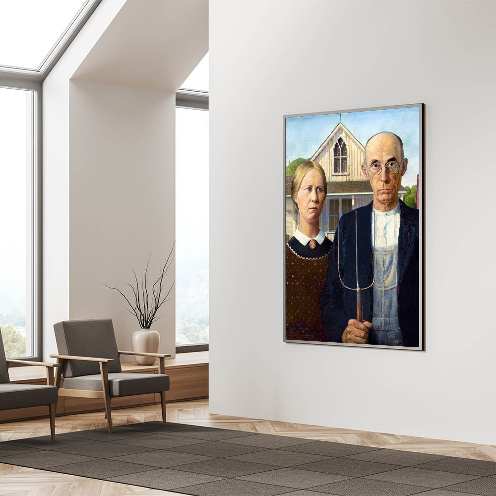 Celebrate an American classic with Modern Wall Art, "American Gothic" by Grant Wood (1930). This iconic painting captures the essence of rural life through its detailed portrayal of a farmer and his daughter standing in front of a Gothic-style house. The stern expressions, symbolic pitchfork, and meticulous composition reflect the resilience and simplicity of the Midwest.