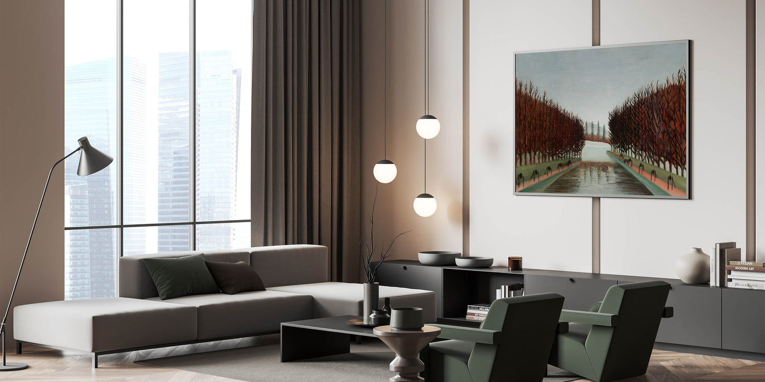 Bring a touch of peaceful beauty to your space with this Modern Wall Art, inspired by Henri Rousseau's "Le Canal." This artwork captures a quiet, symmetrical landscape with barren trees lining a reflective canal, evoking a calm and introspective mood. With its earthy tones and timeless composition, this piece is perfect for adding a serene and sophisticated touch to contemporary decor.
