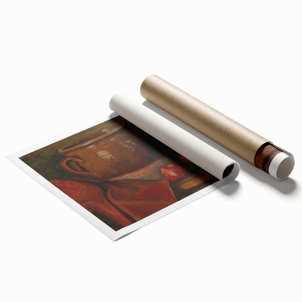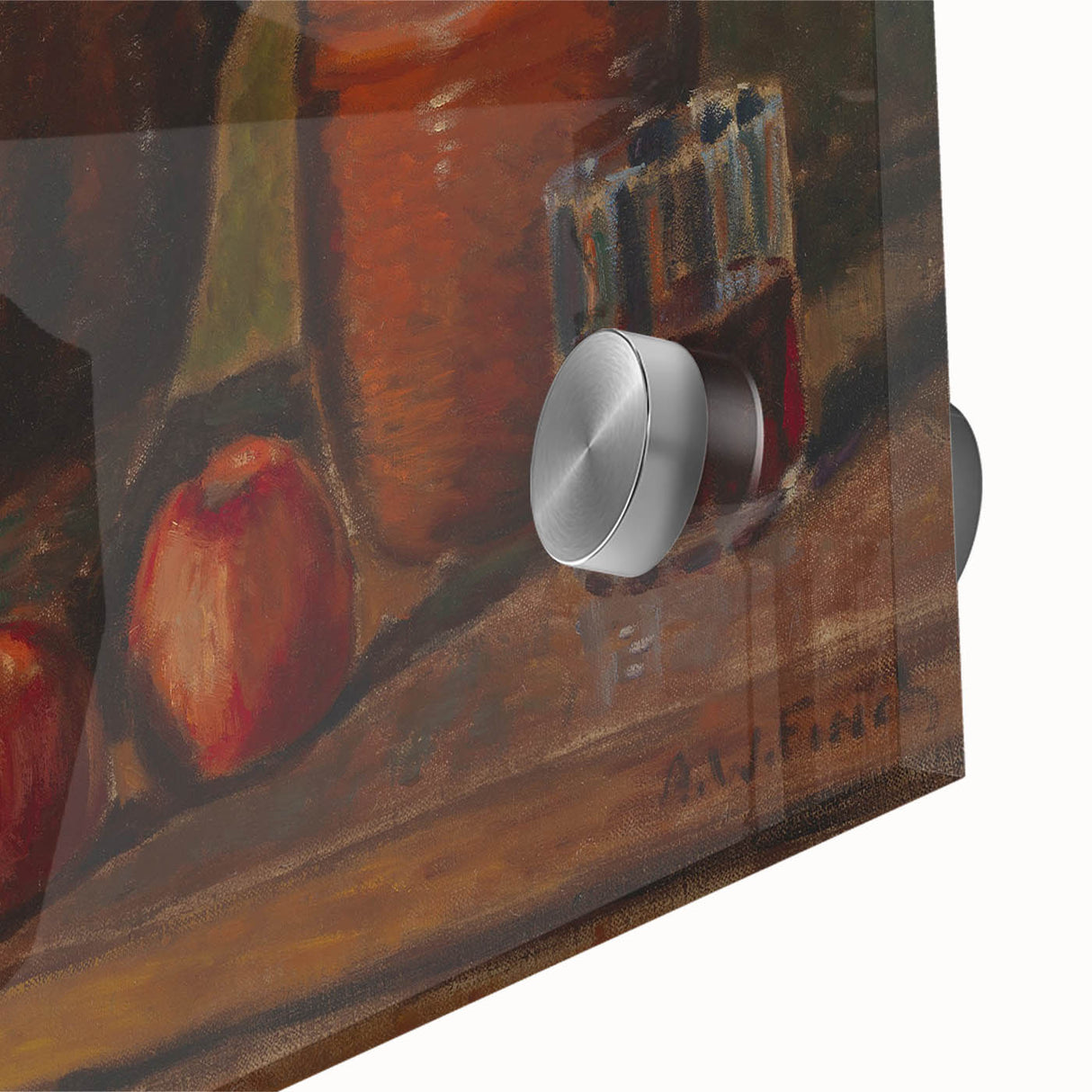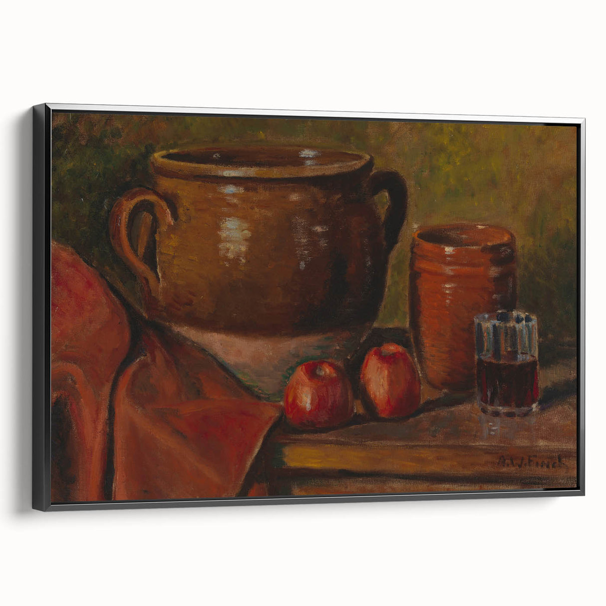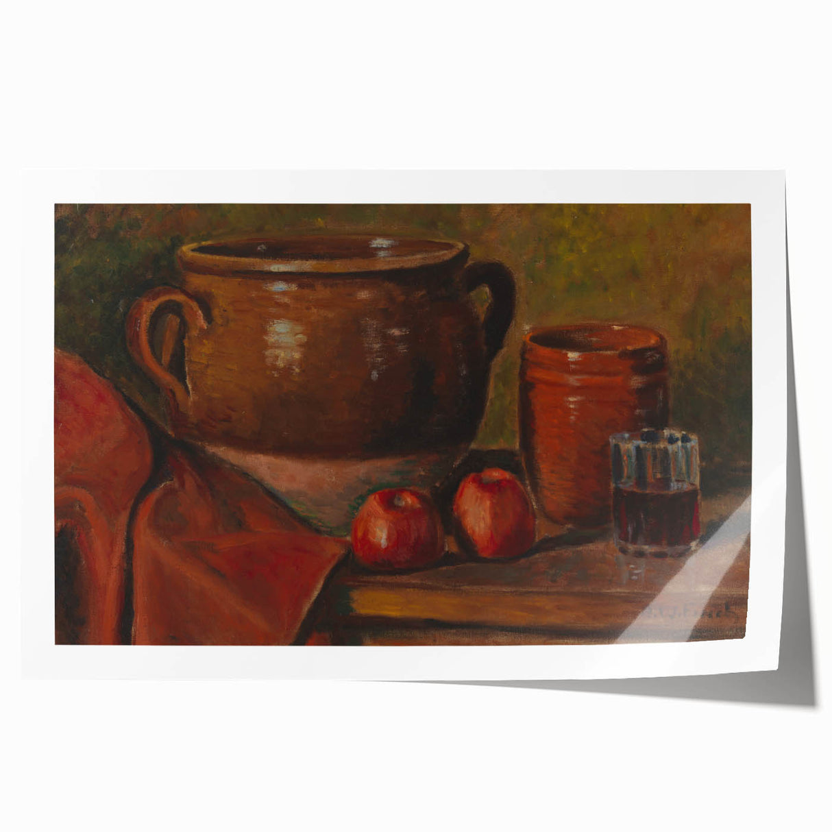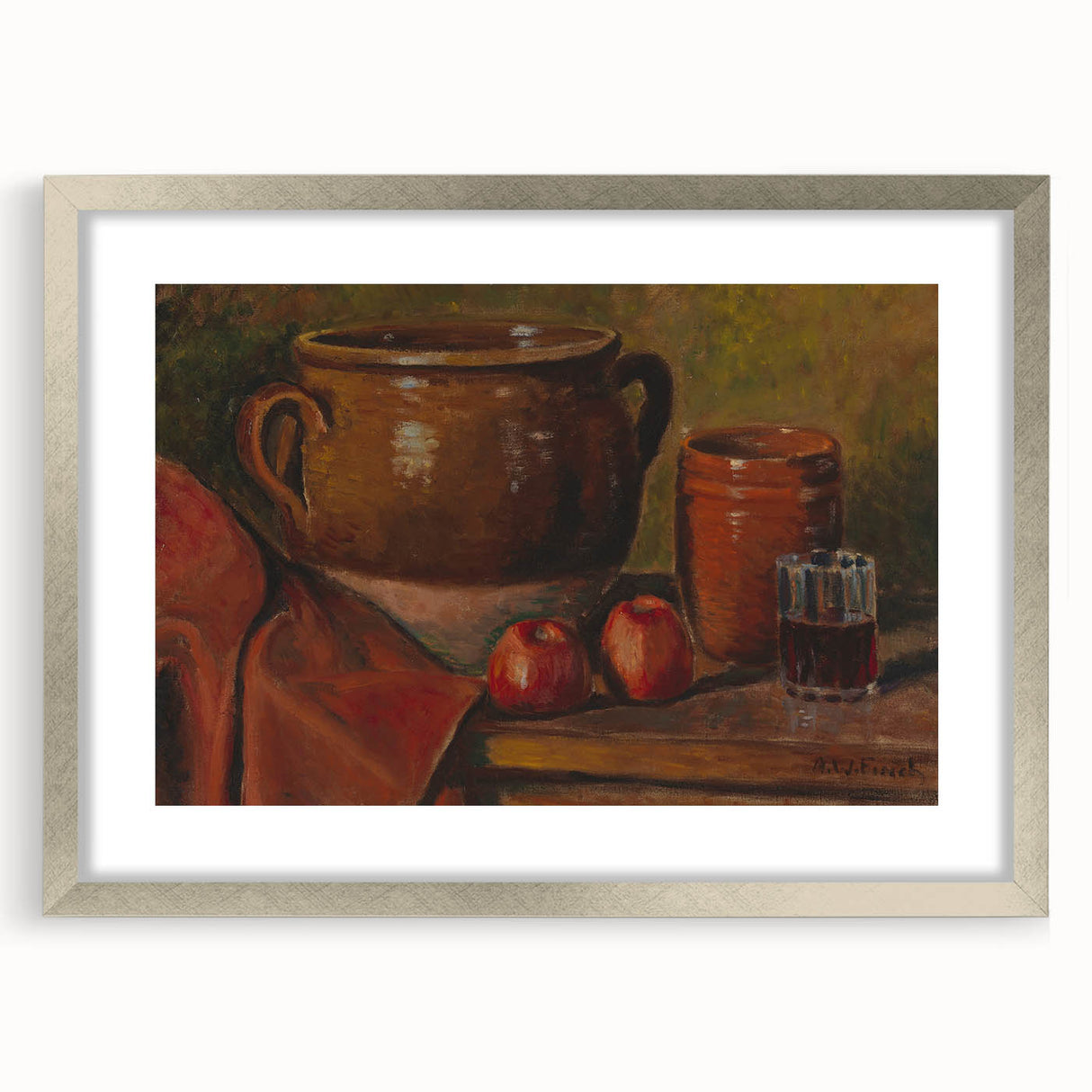 Infuse your home with timeless charm through this stunning modern wall art inspired by Alfred William Finch's "Still Life, 1923." This captivating piece showcases a warm, rustic arrangement of pottery, a glass of wine, and vibrant red apples set against a textured backdrop. The earthy tones and realistic detailing evoke a sense of coziness and sophistication, making it a perfect addition to modern and traditional decor alike.