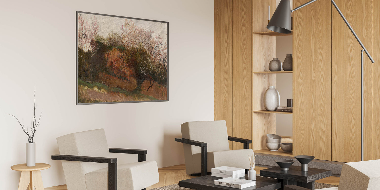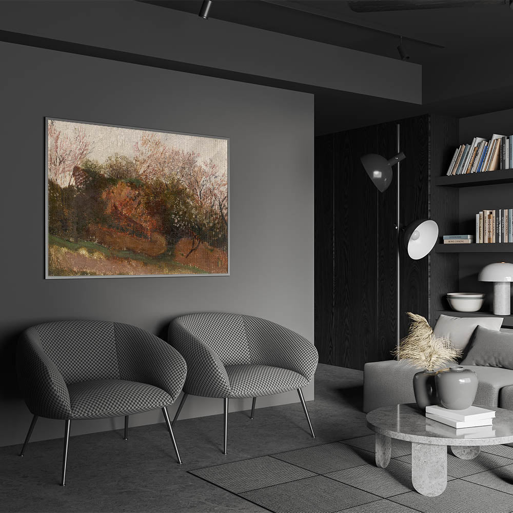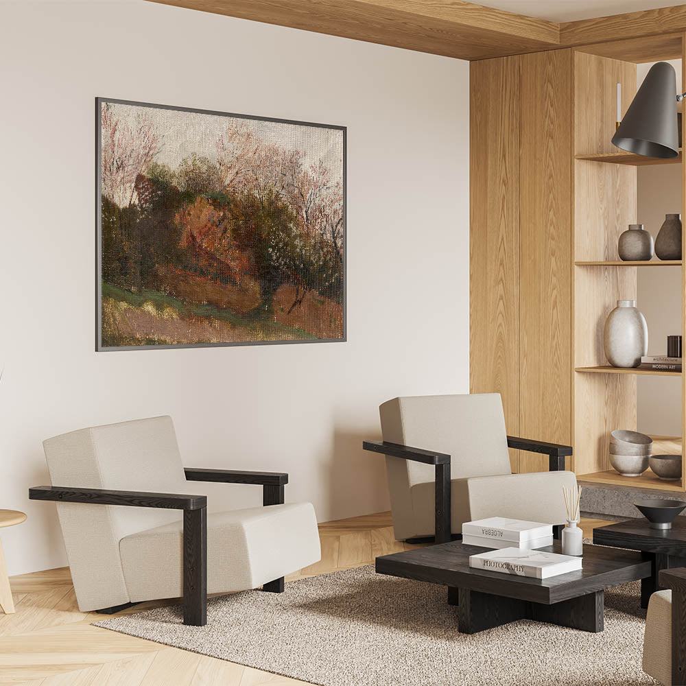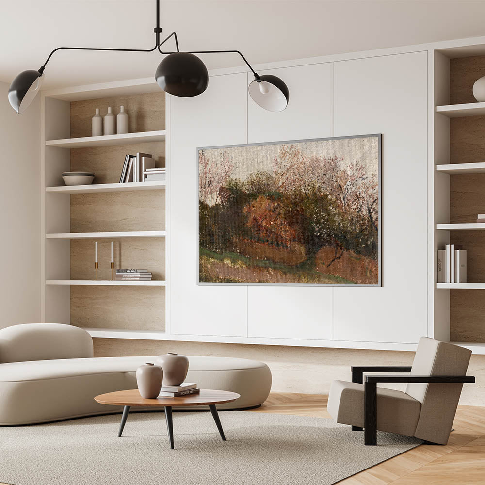 Embrace the tranquility of spring with this serene piece of modern wall art, showcasing a delicate natural landscape. This artwork captures the beauty of blooming trees and lush greenery with soft, earthy tones of brown, green, and pastel pink. Its impressionistic style and subtle texture bring a peaceful charm to any space, making it a timeless addition to contemporary interiors.