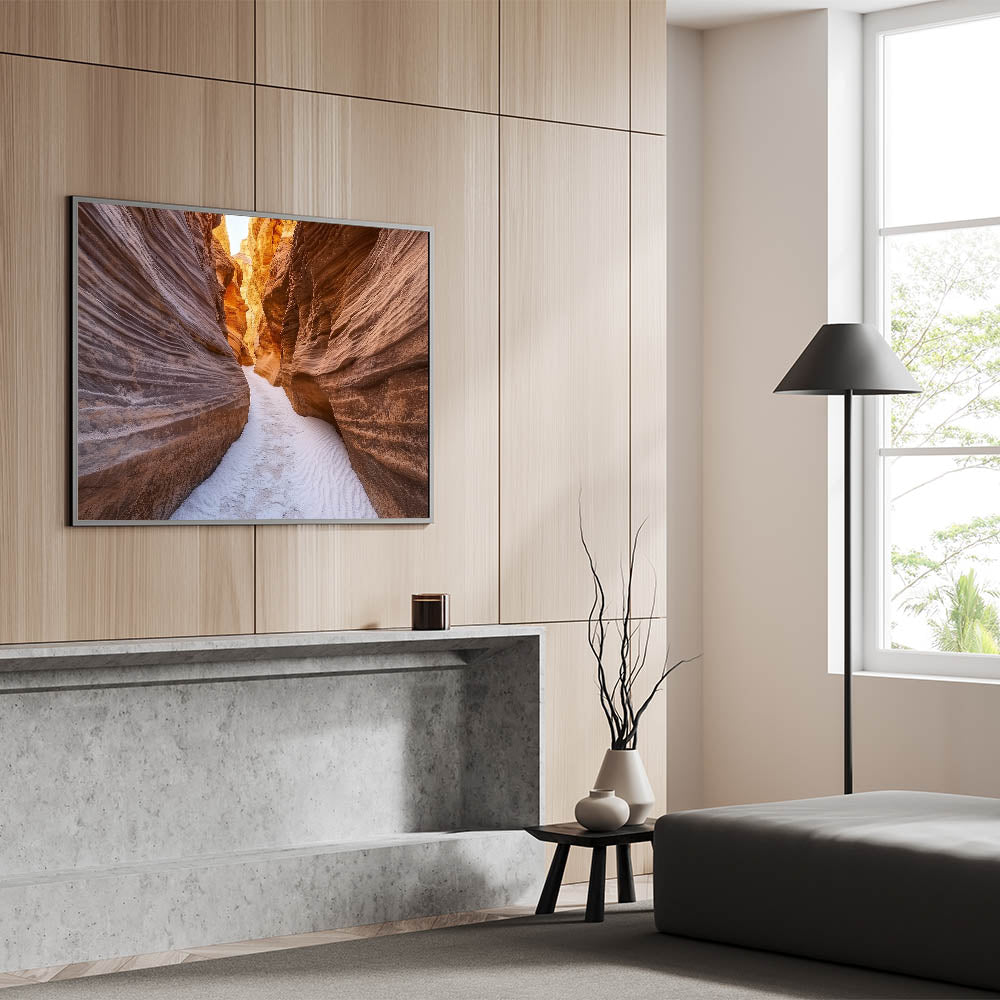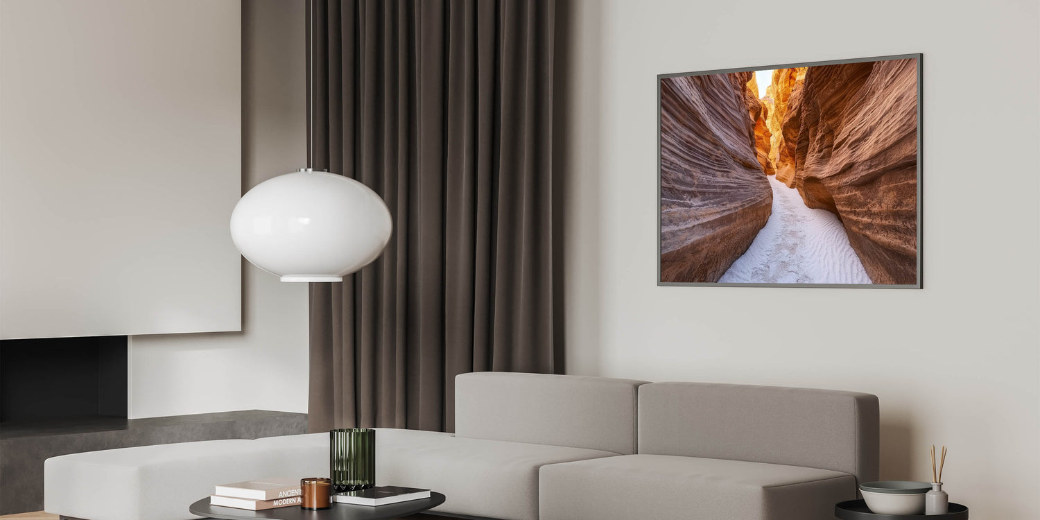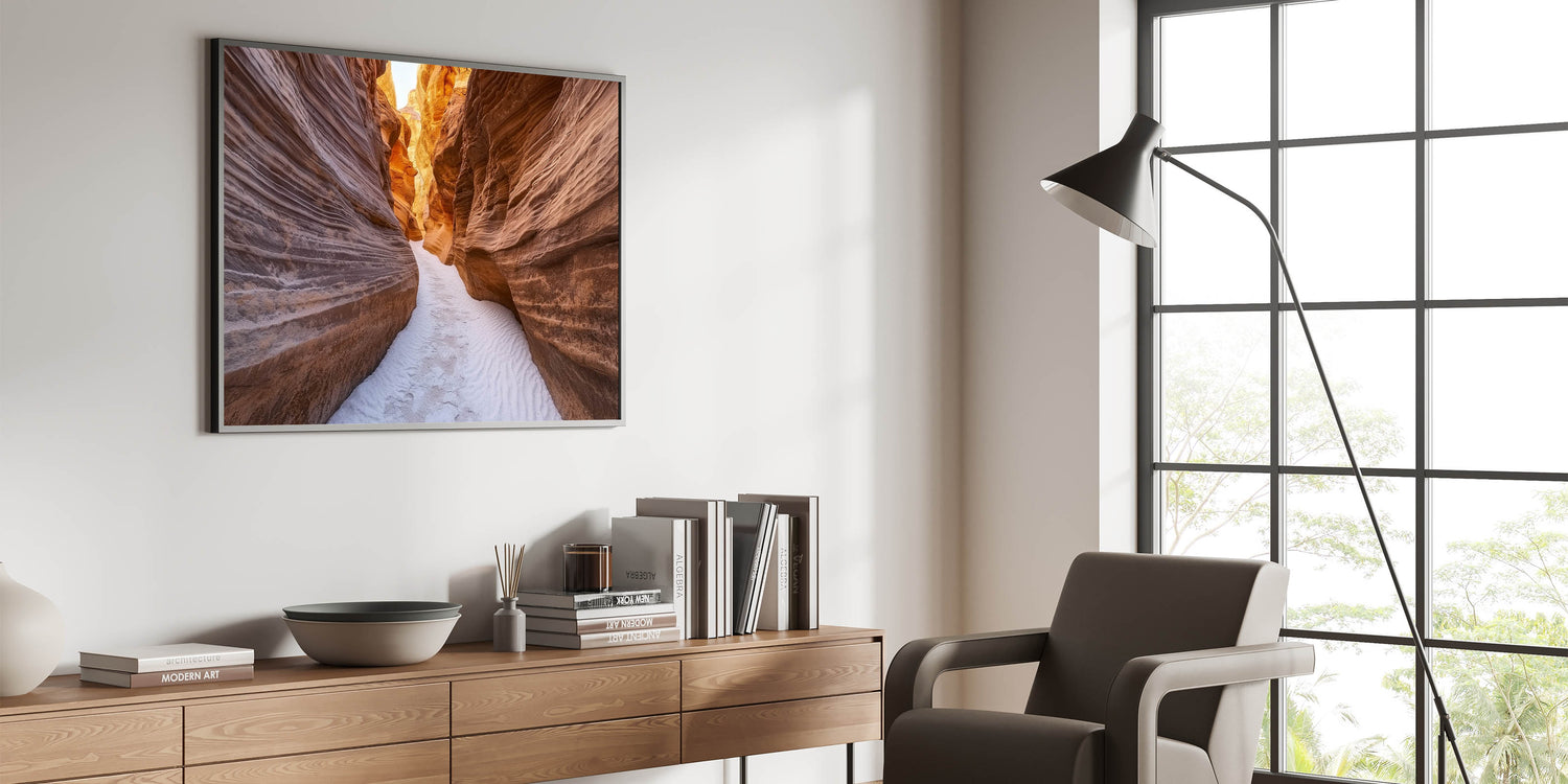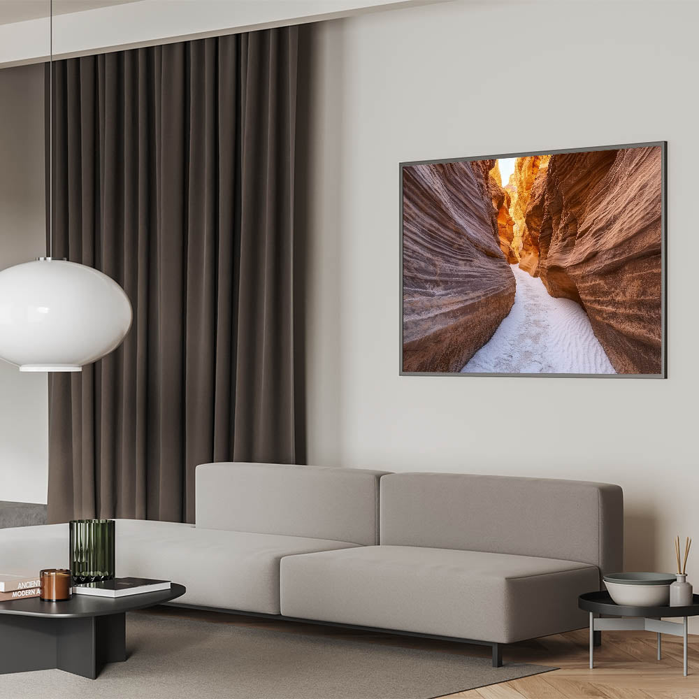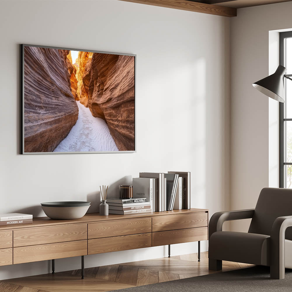 Step into nature’s artistry with this Narrow Canyon Path Art. This captivating artwork showcases a serene sandstone canyon with intricate striations and warm earthy tones, illuminated by golden sunlight filtering through the walls. The soft sandy floor leads your eyes through the winding path, evoking a sense of adventure and tranquility. Perfect for living rooms, offices, or hallways, this piece adds warmth and elegance to any decor.