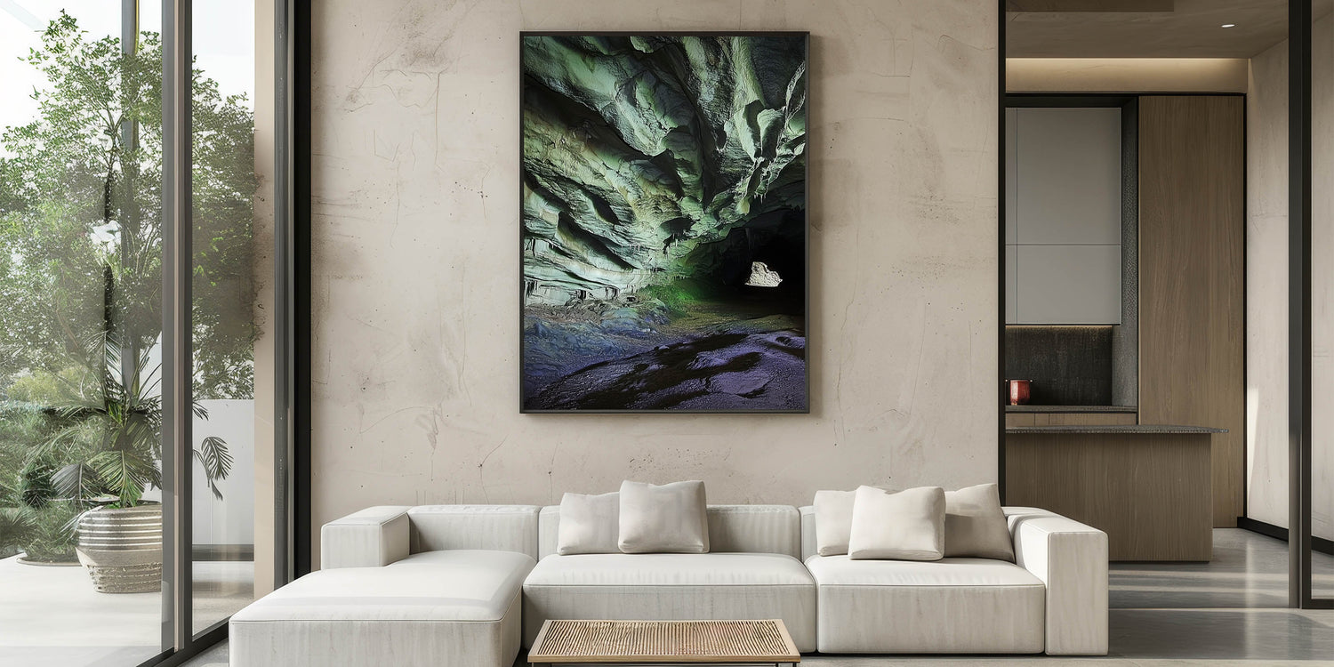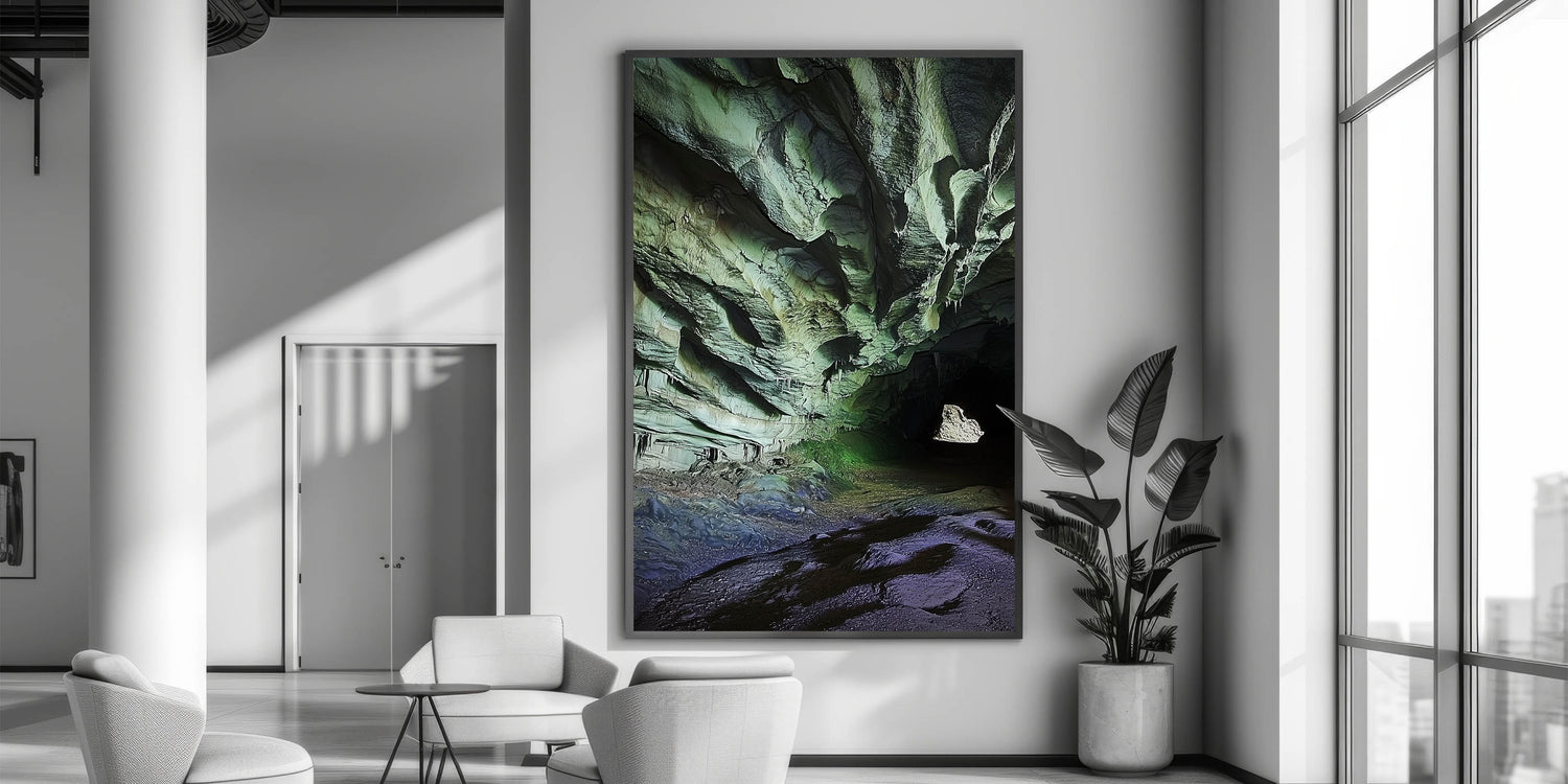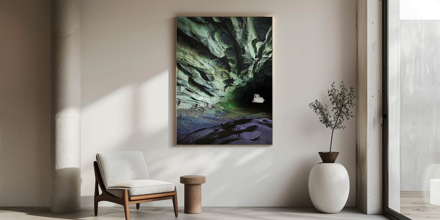 - High-quality prints of natural cave landscapes available on canvas, acrylic glass, framed, and rolled formats.