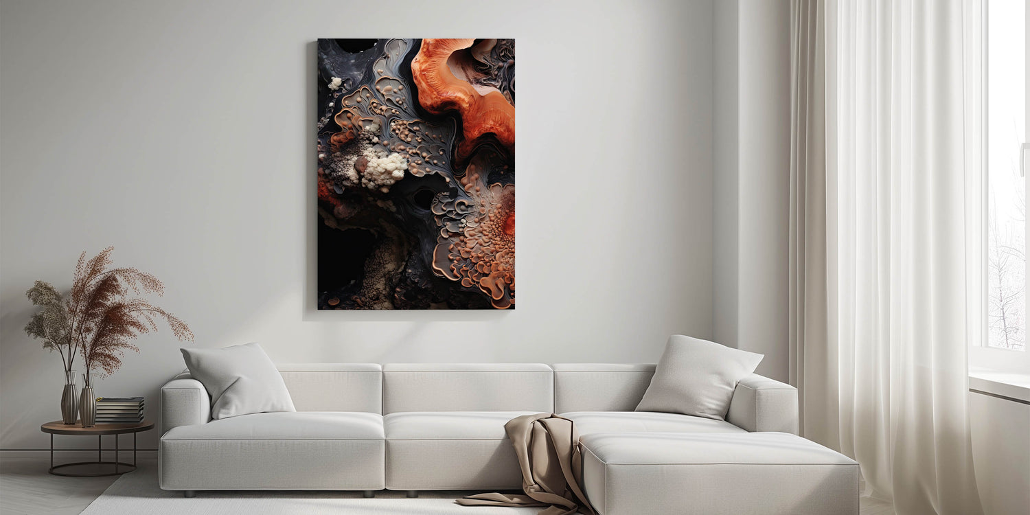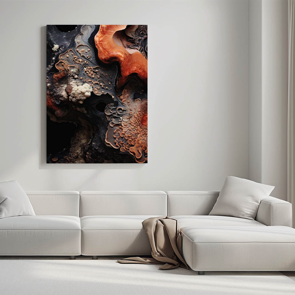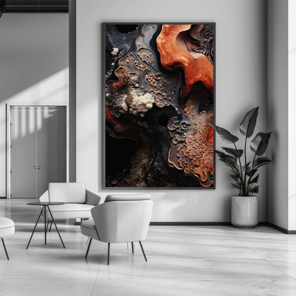Bring the raw beauty of nature into your space with this nature closeup wall art, showcasing an abstract macro photograph of earthy, textured formations. The intricate patterns in shades of warm orange, deep brown, and creamy beige evoke the look of natural rock and geological layers, creating a visually striking and organic piece.