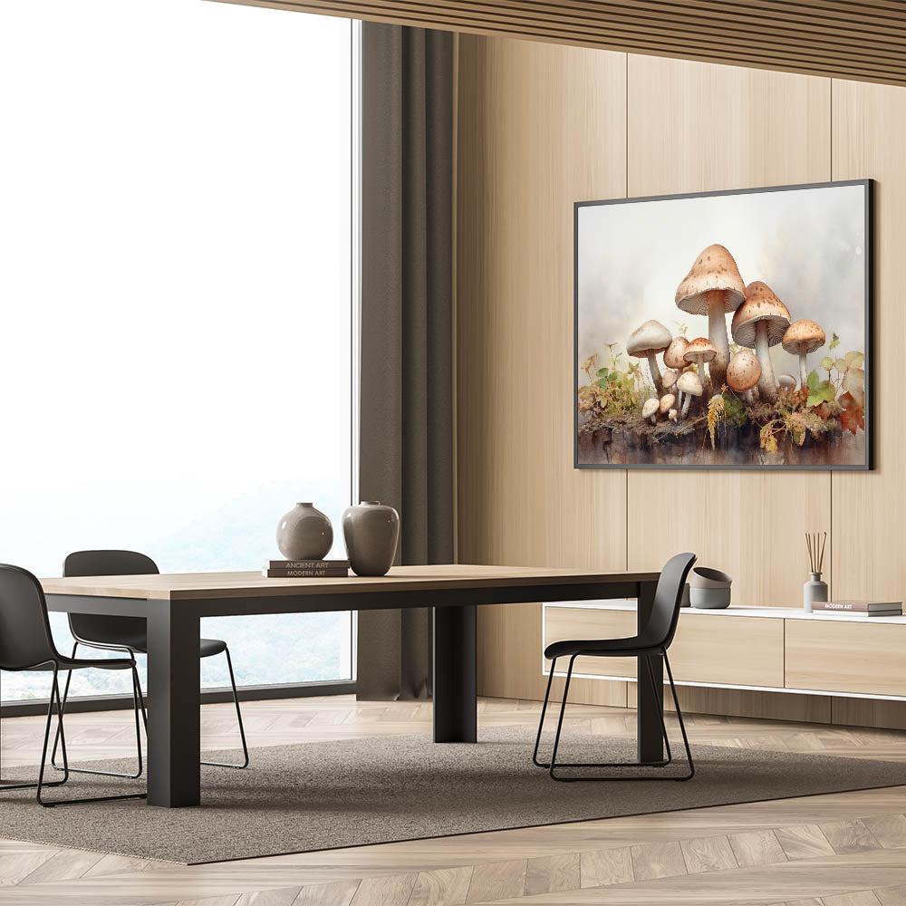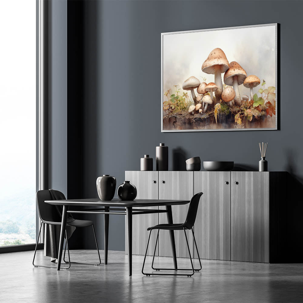 Enhance your living space with this captivating mushroom wall art, a stunning blend of nature-inspired design and botanical elegance. Featuring a cluster of beautifully detailed mushrooms surrounded by delicate foliage, this illustration brings the enchanting charm of woodland scenes into your home decor. Perfect for nature lovers and those seeking unique botanical prints.