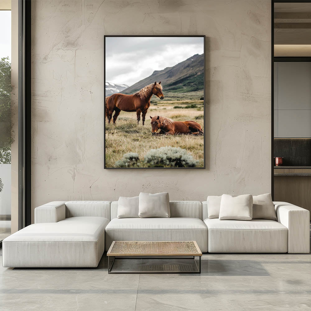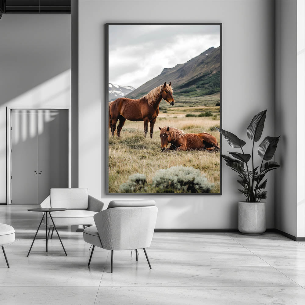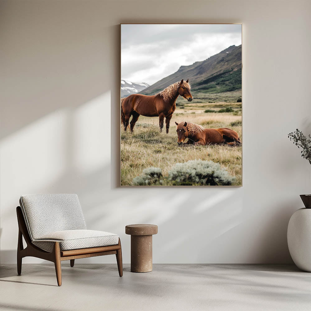 Bring the tranquil beauty of the countryside into your home with this stunning wall art. Featuring two majestic horses resting in a serene valley surrounded by rolling green hills and a dramatic mountain backdrop, this artwork captures the essence of rural life. Perfect for rustic farmhouse decor or anyone who loves countryside-inspired interiors, this piece radiates peace and natural charm.