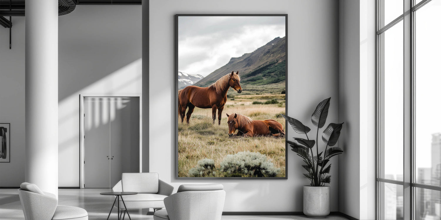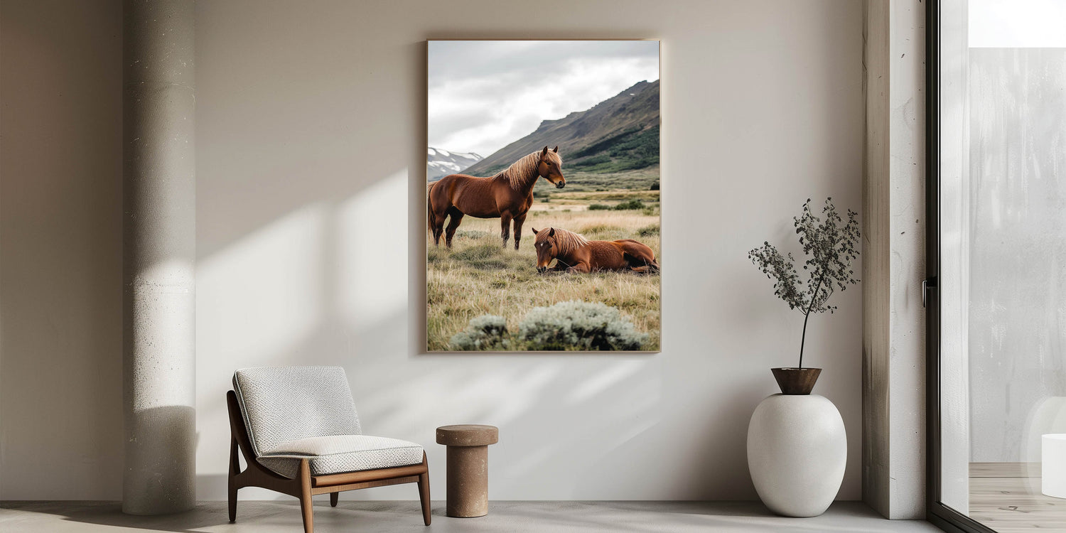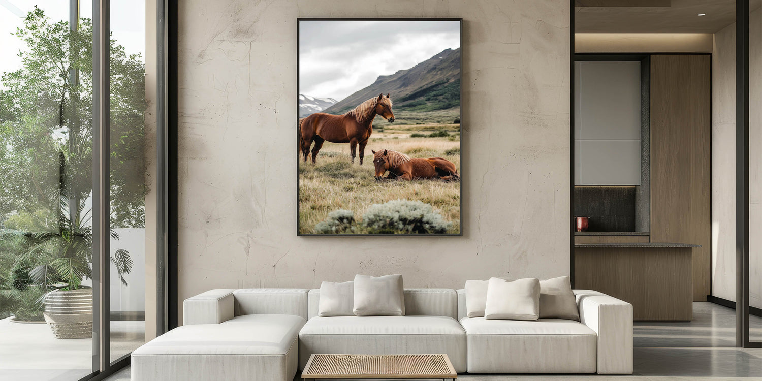 Bring the tranquil beauty of the countryside into your home with this stunning wall art. Featuring two majestic horses resting in a serene valley surrounded by rolling green hills and a dramatic mountain backdrop, this artwork captures the essence of rural life. Perfect for rustic farmhouse decor or anyone who loves countryside-inspired interiors, this piece radiates peace and natural charm.