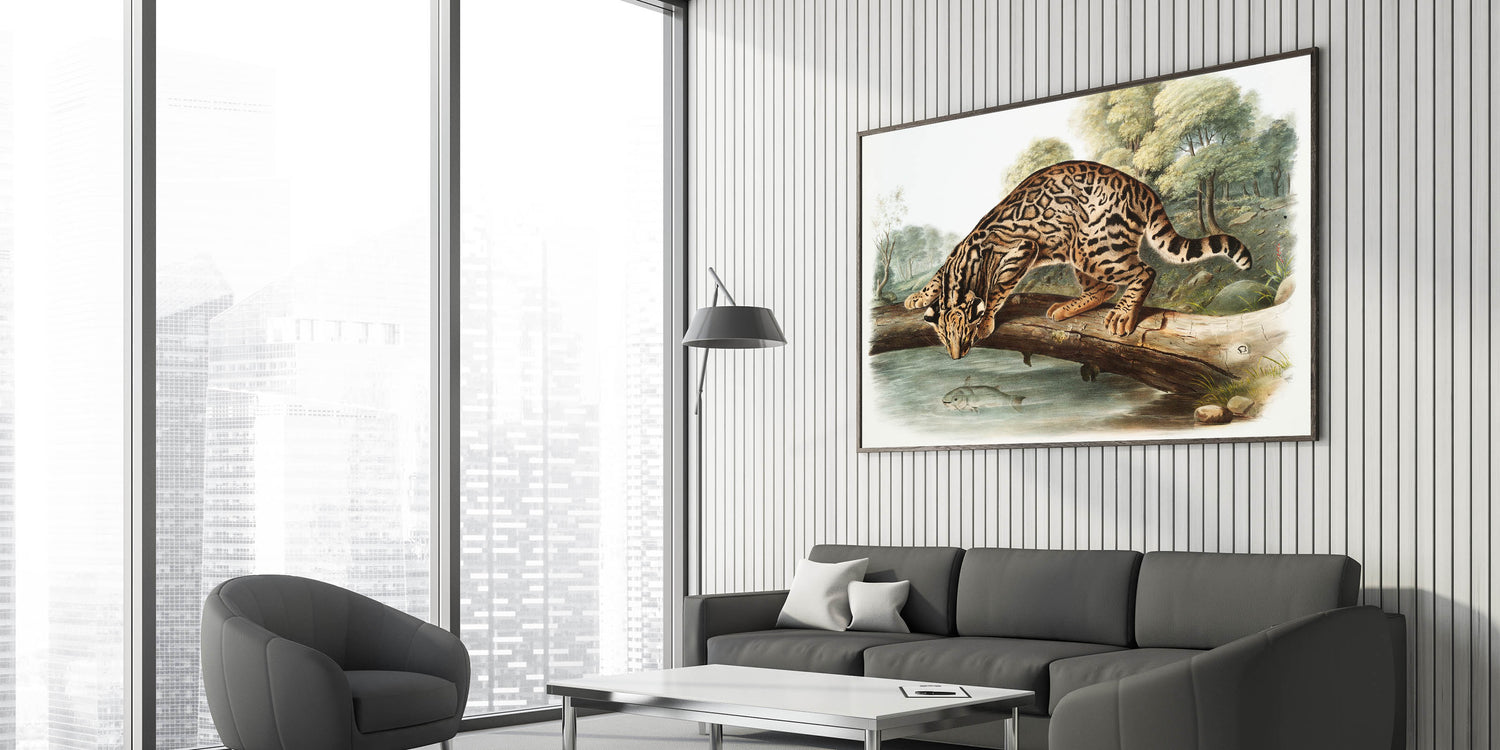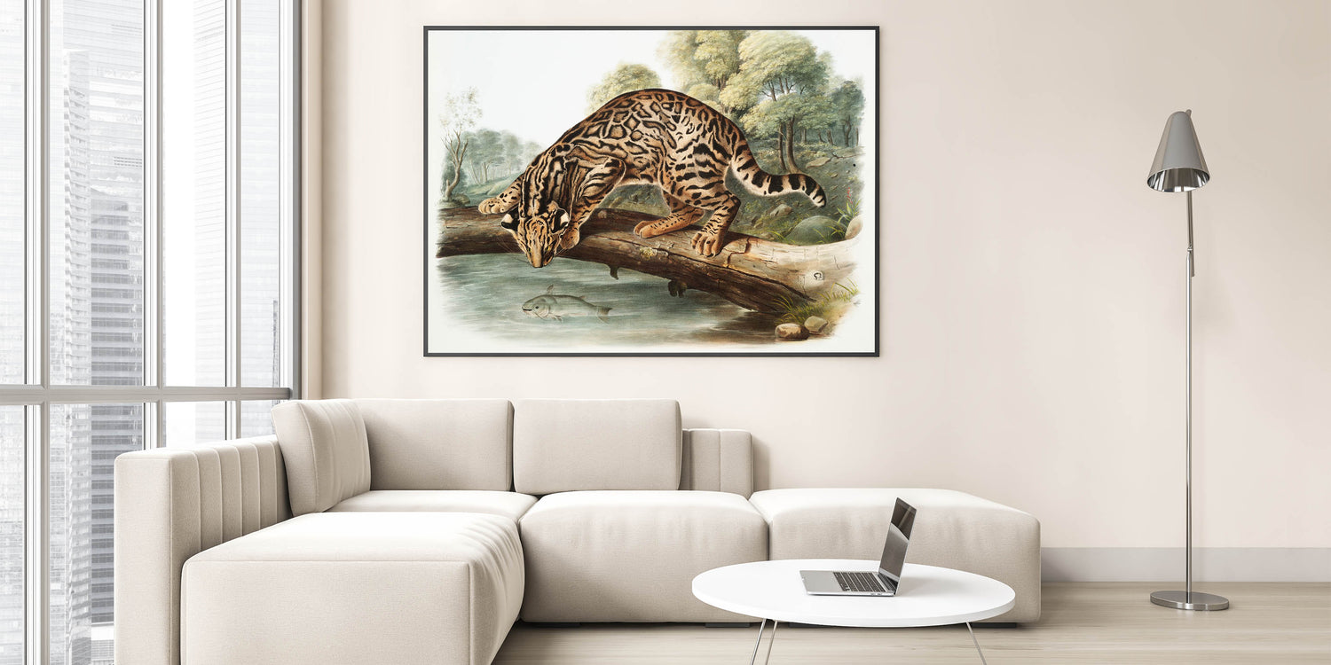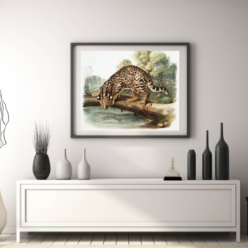 Explore the wild beauty of nature with "Ocelot or Leopard Cat" by John Woodhouse Audubon, an exquisite example of Romanticism style wall art. This captivating illustration features a meticulously detailed ocelot perched on a fallen tree, peering into the water below where a fish swims. The lush forest backdrop and lifelike representation of the ocelot’s fur patterns embody the classic art of the Romantic era, celebrating the untamed majesty of the natural world.