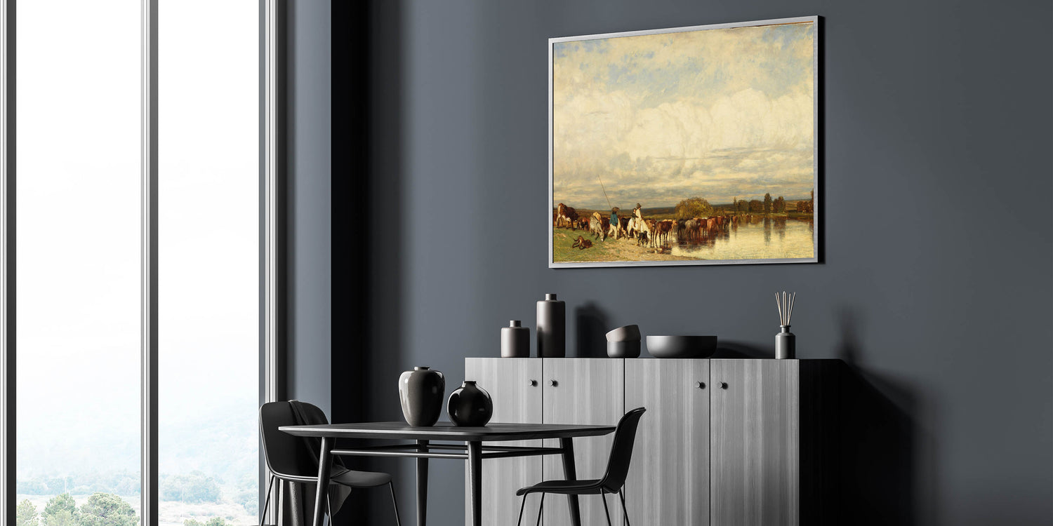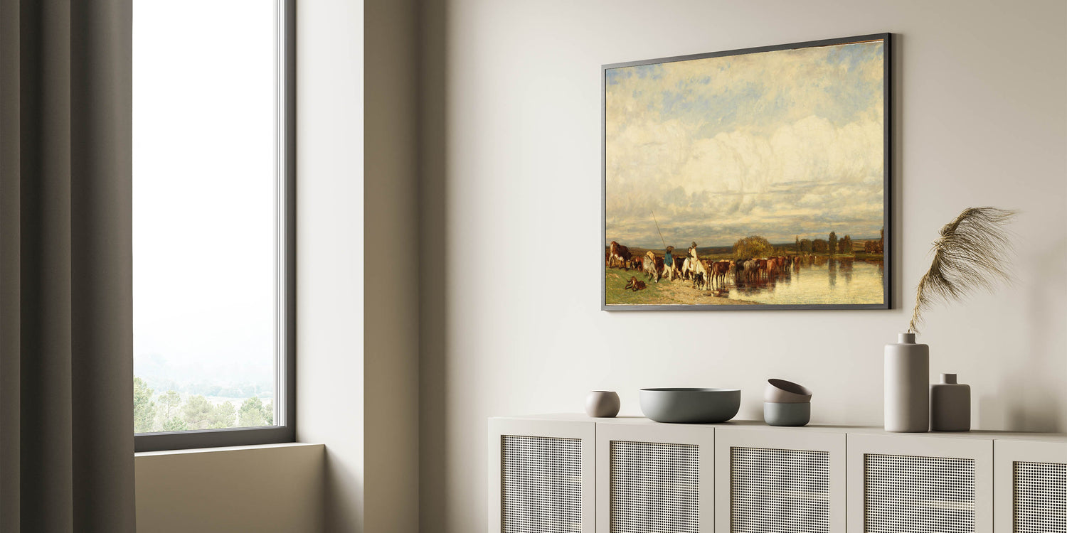 Experience the serene beauty of Romanticism with Cows Crossing a Ford by Jules Dupré, a masterful depiction of nature and rural life. This artwork showcases a tranquil scene of cattle wading through a river, accompanied by herders on horseback under a vast, soft-lit sky. The piece reflects the Romanticism style wall art with its emphasis on the emotional connection between humans, animals, and nature's grandeur.