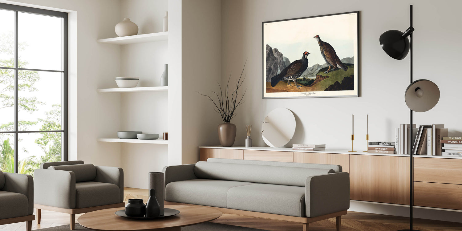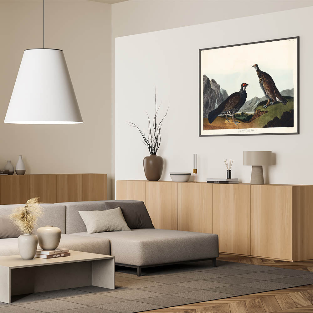 Immerse yourself in the beauty of Romanticism with Long-tailed or Dusky Grouse from Birds of America (1827) by John James Audubon. This exquisite artwork captures the grandeur of nature, showcasing two dusky grouse against a serene mountainous backdrop. Audubon’s attention to detail and emotional landscapes make this piece a hallmark of Romanticism style wall art.