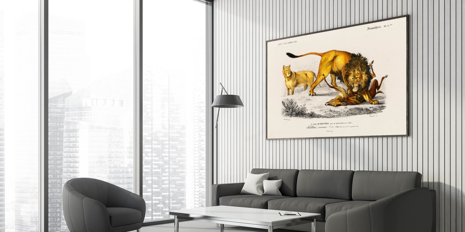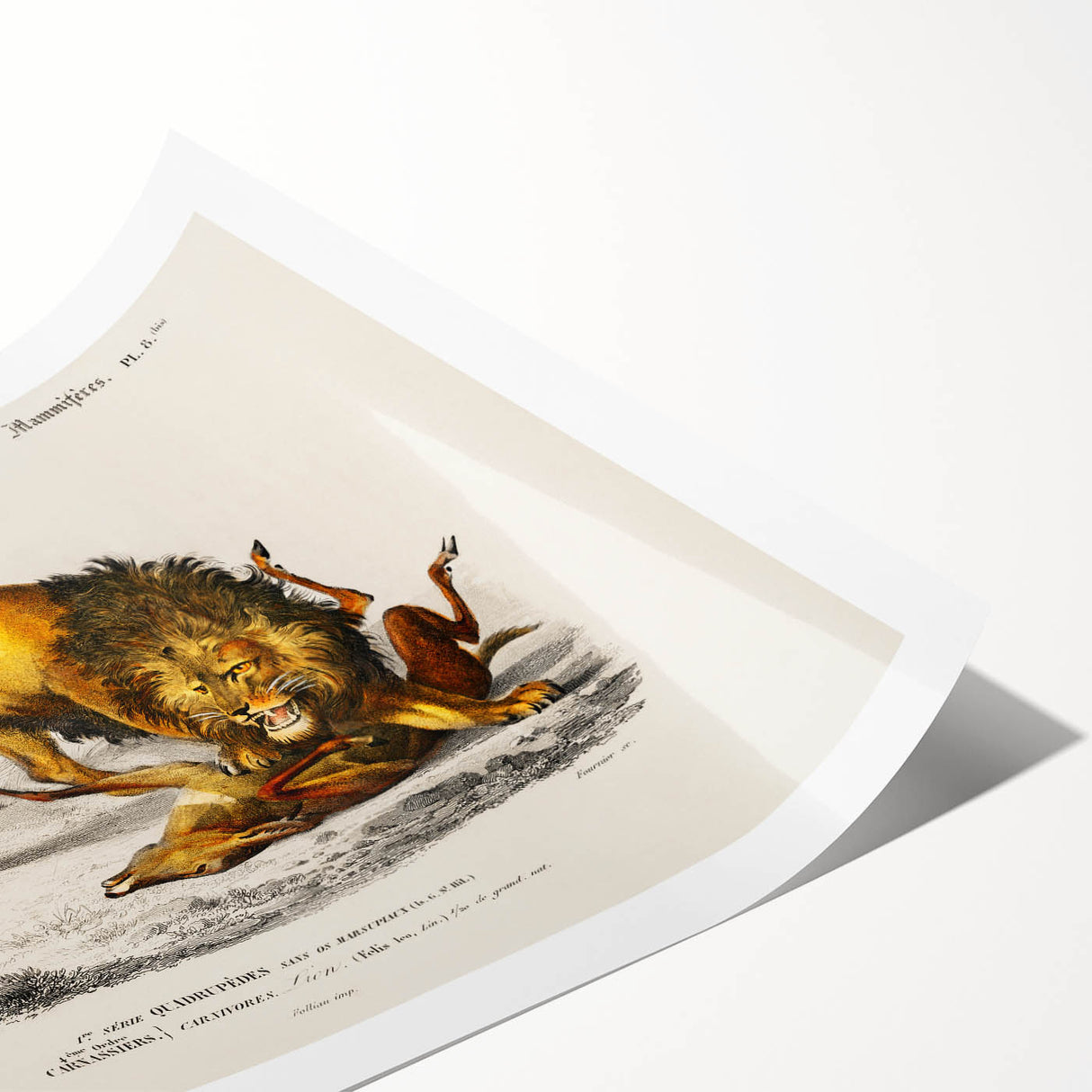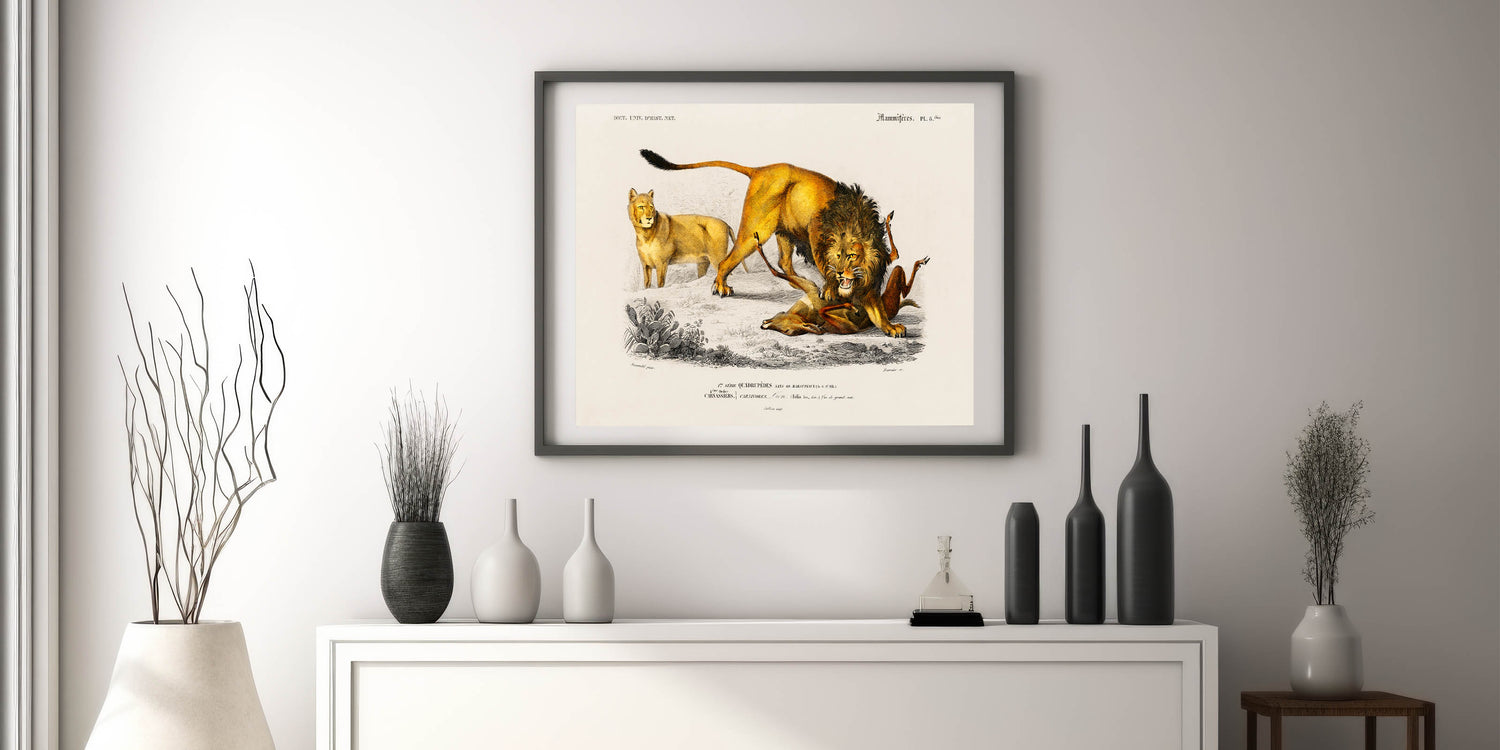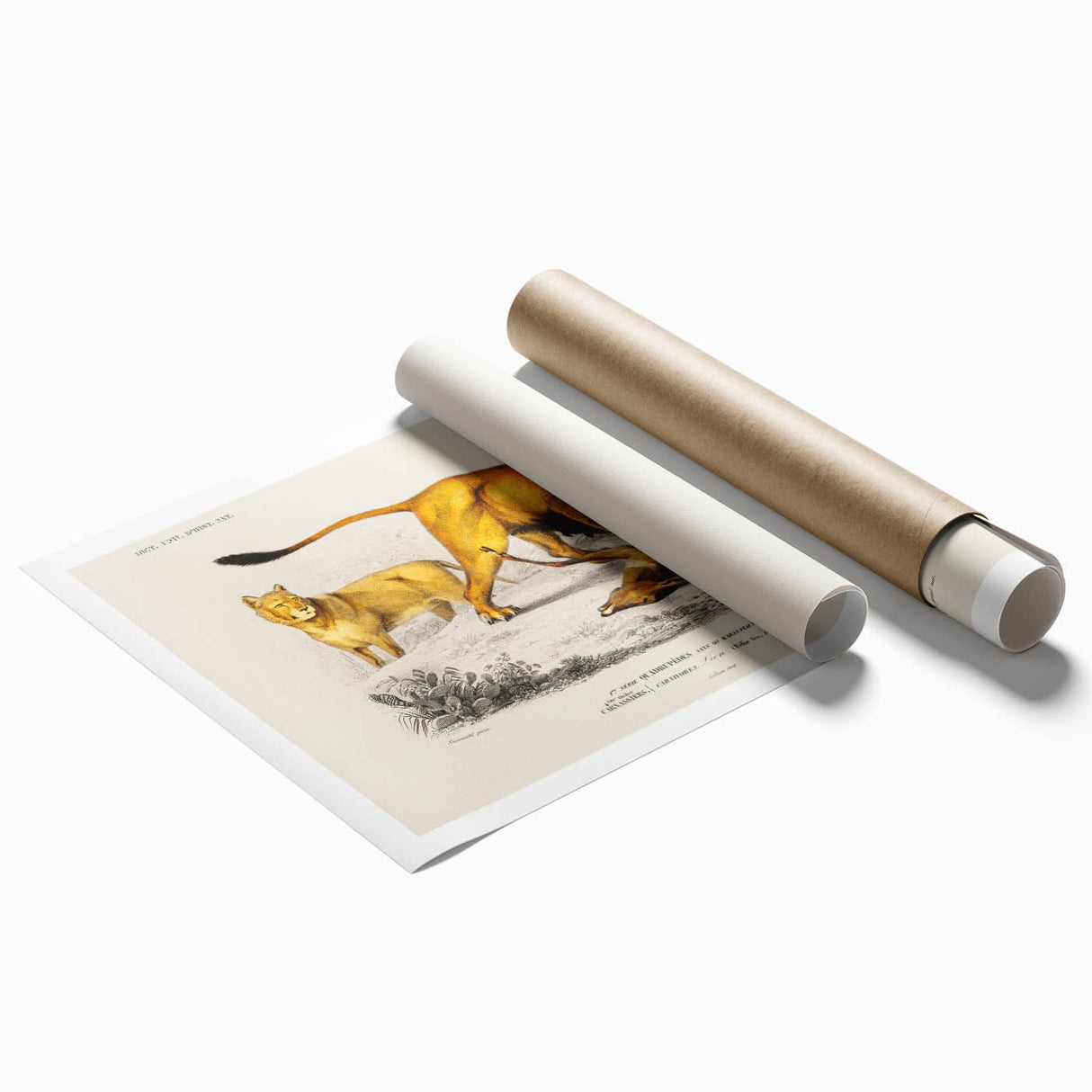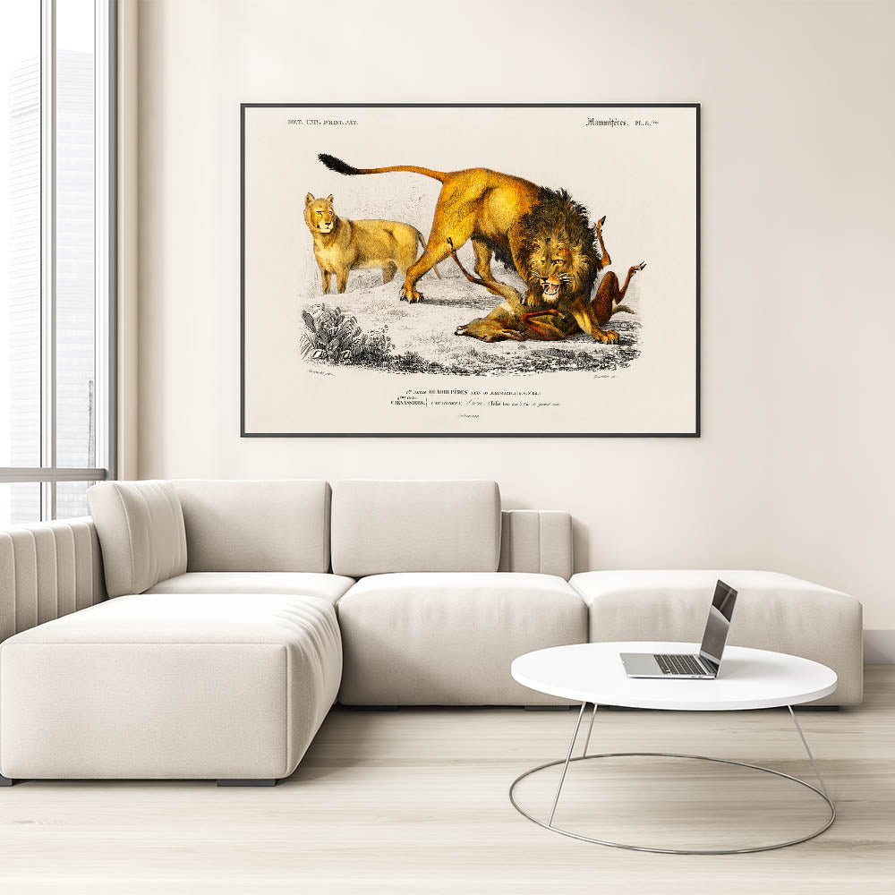 Bring the untamed beauty of the wild into your home with this striking Romanticism-style wall art featuring an intricate lion illustration by Charles Dessalines D'Orbigny. This historical Romanticism canvas highlights the majestic power of nature through detailed depictions of a lion and lioness in a dramatic scene. Perfect for lovers of both classic art and wildlife, this piece blends emotional landscapes and cultural significance.