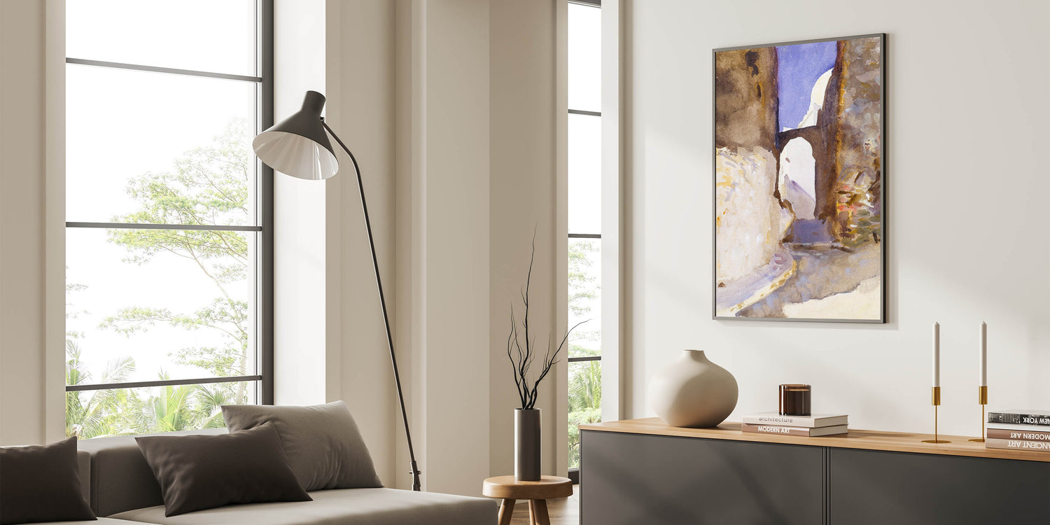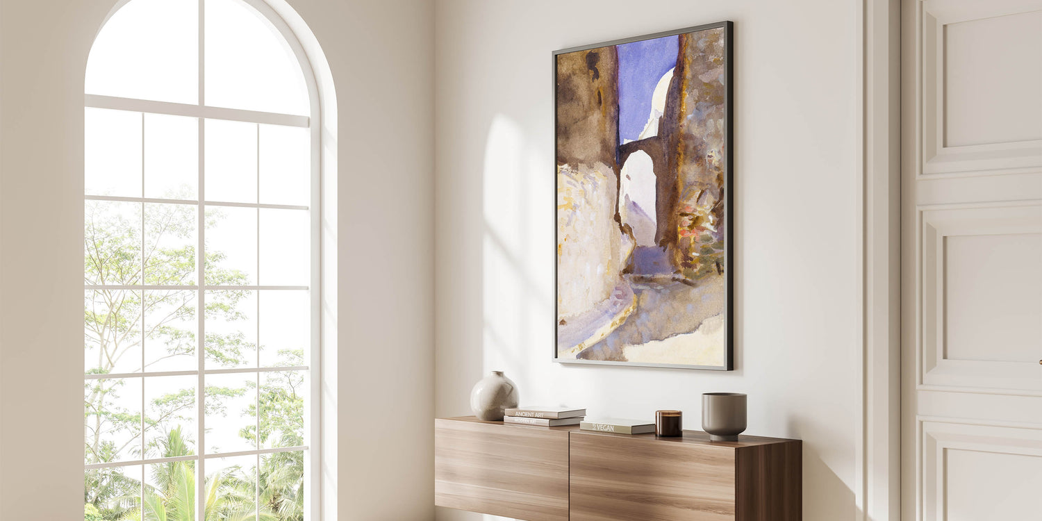 Experience the beauty of Romanticism with Street, Tangier (1895) by John Singer Sargent. This atmospheric watercolor captures a narrow street bathed in soft light, with its weathered walls and an arched gateway leading to an inviting expanse of sky. Sargent’s masterful use of color and texture evokes the vibrant yet tranquil essence of Moroccan architecture and landscapes, a hallmark of Romanticism style wall art.