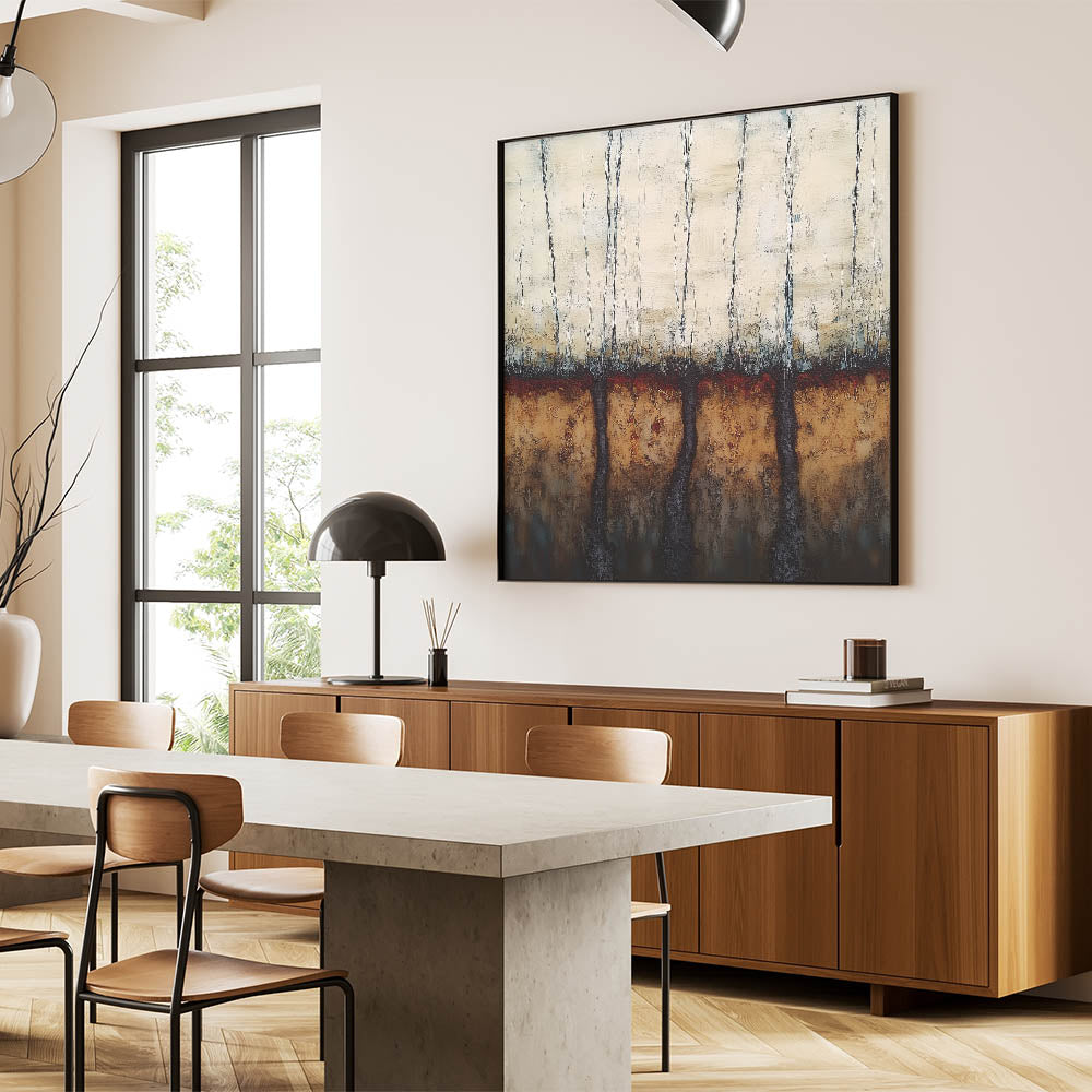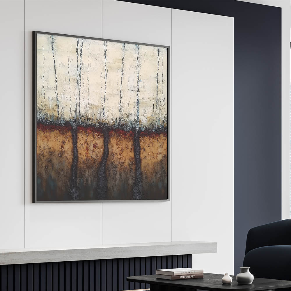 Add a touch of rustic elegance to your home with this Rustic Abstract Tree Canvas Art. This striking design showcases vertical tree-like forms, set against a textured background of earthy brown and rust tones that transition into soft beige and cream hues. The bold contrast and layered textures bring depth and character to the artwork, making it perfect for any modern or rustic-inspired interior.