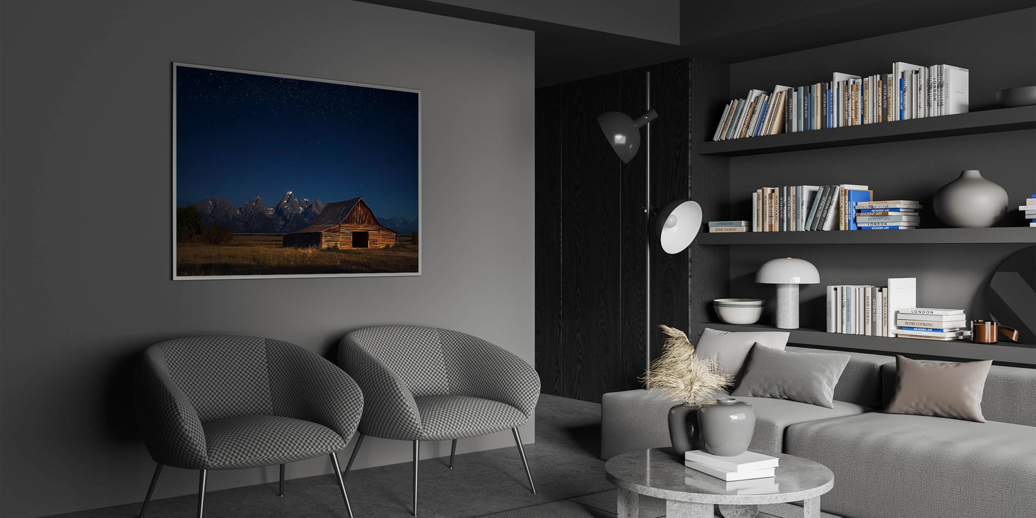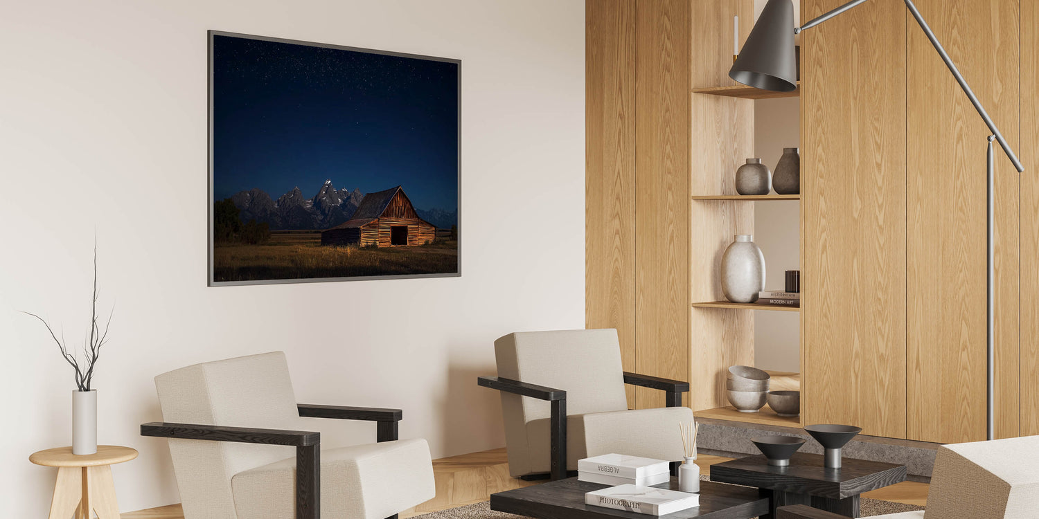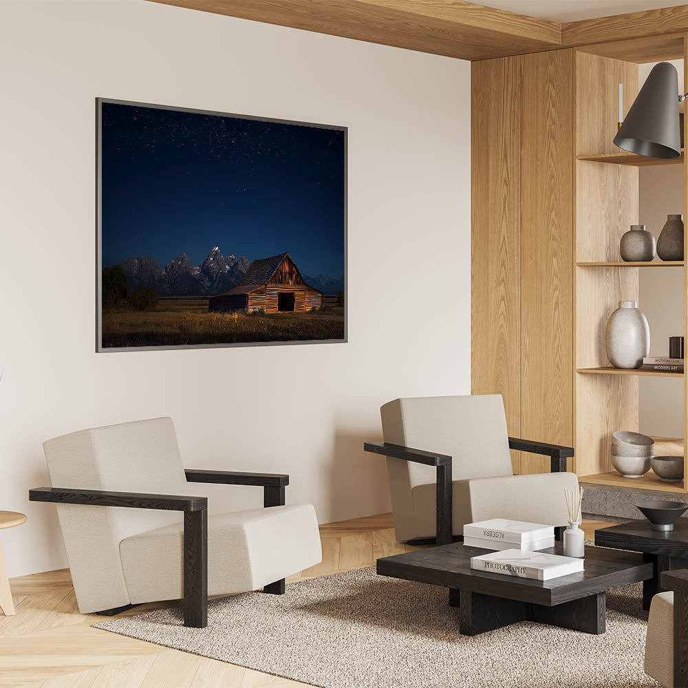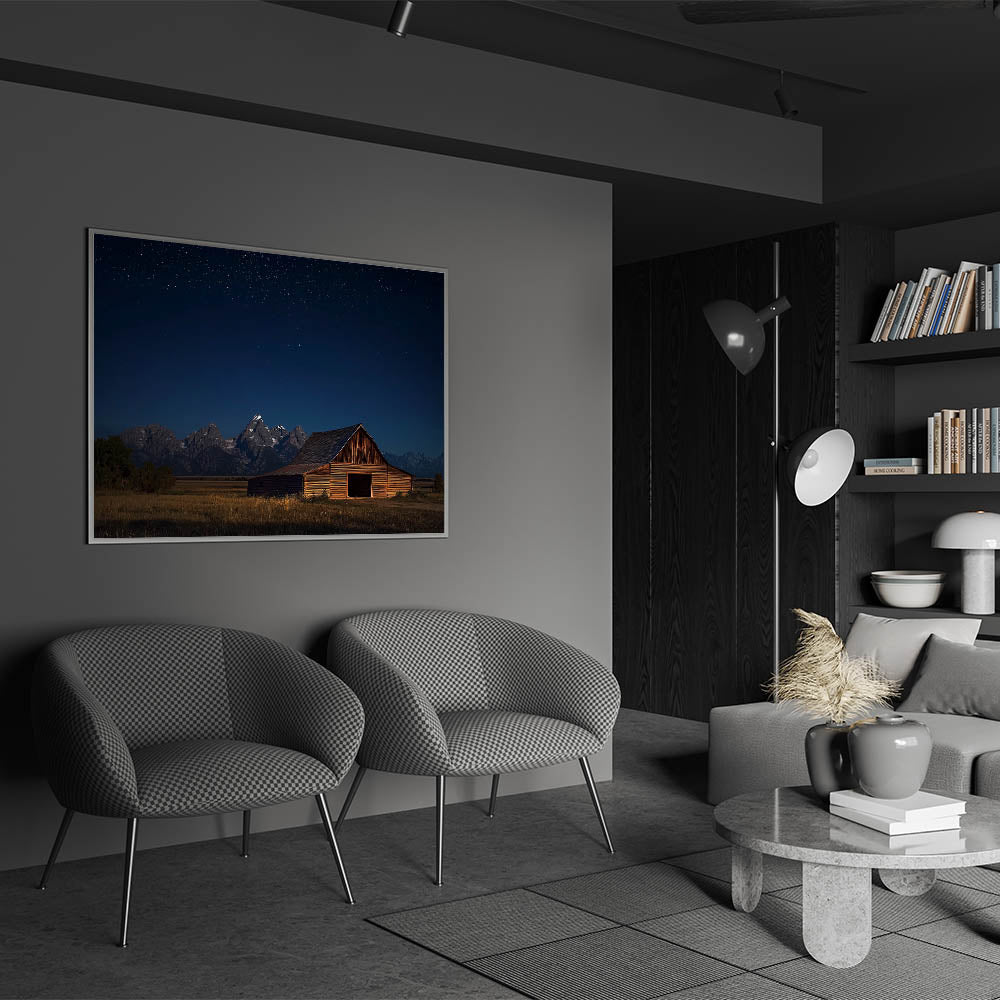 Embrace the tranquil beauty of the countryside at night with this breathtaking barn wall art. This photograph captures a rustic wooden barn illuminated under a starry sky, with towering mountain peaks in the distance. The deep blues of the night sky and the warm glow of the barn create a dramatic yet peaceful composition, making it a perfect addition to farmhouse or rustic-inspired interiors. This artwork evokes a sense of calm and wonder, ideal for enhancing your space.