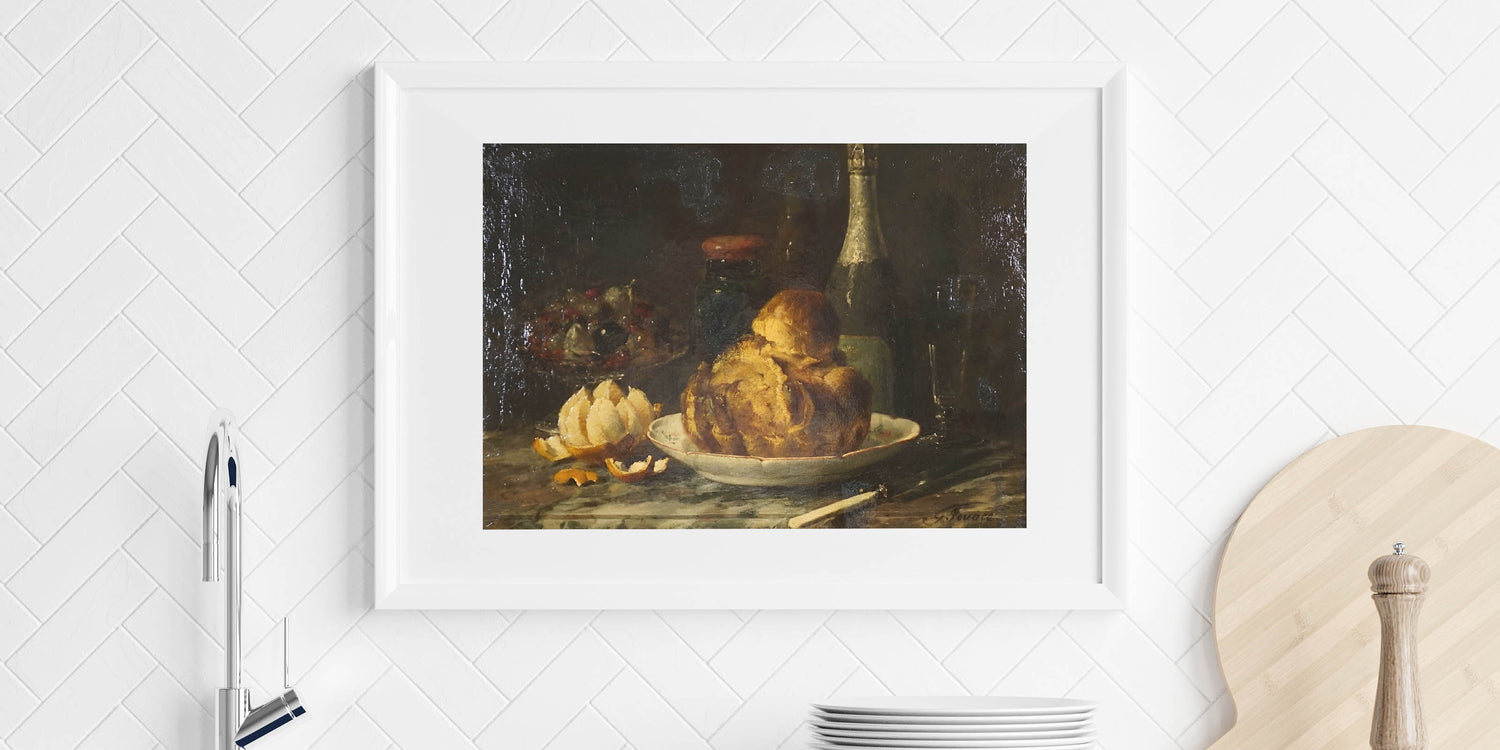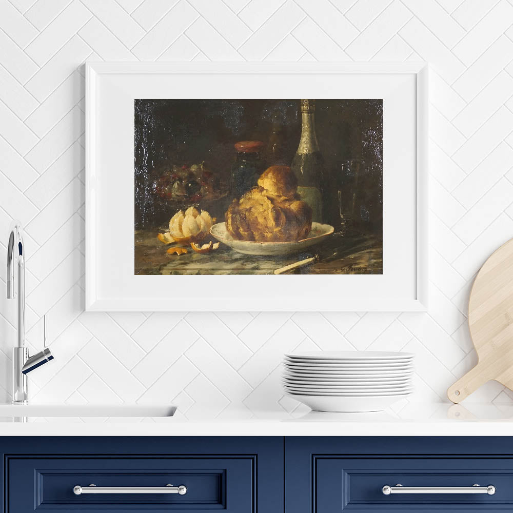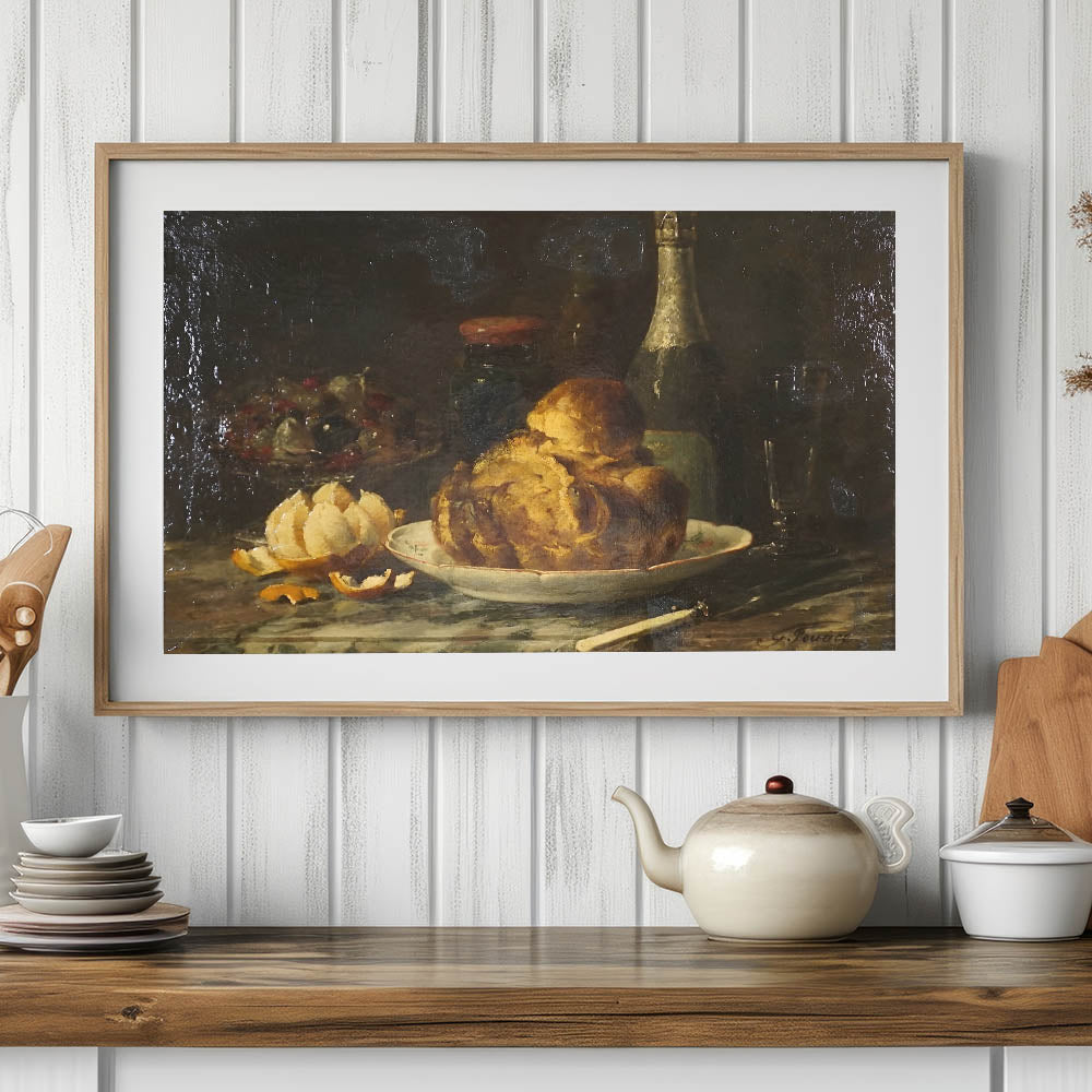 - Rustic Culinary Appeal: A rich portrayal of artisanal bread, fruits, and bottles—ideal for Dining Room Aesthetics.