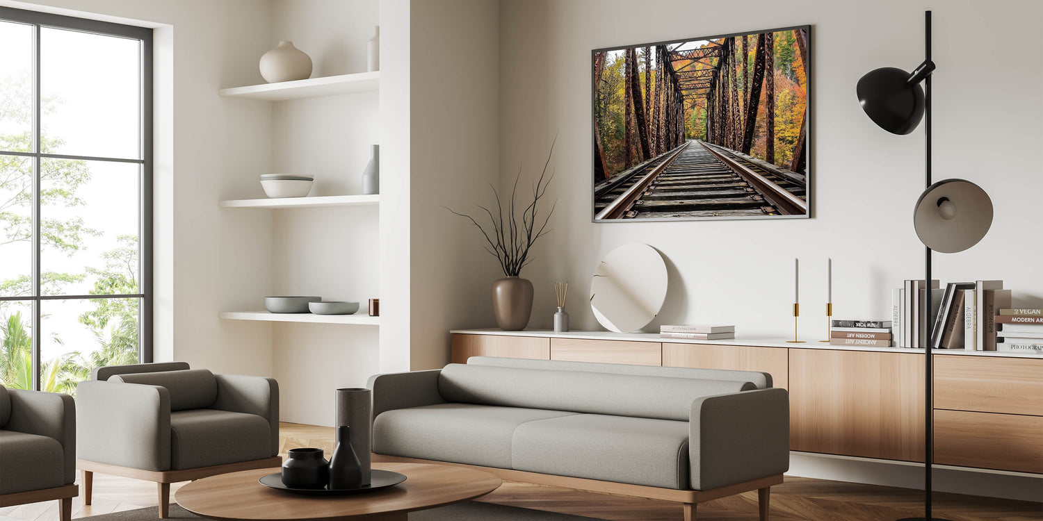 Bring the warmth of autumn into your home with this rustic-inspired bridge painting. Whether displayed in a living room, office, or bedroom, its rich colors and timeless design make it a versatile piece. Perfect for art and nature lovers, this unique bridge art print celebrates the beauty of fall and industrial craftsmanship.