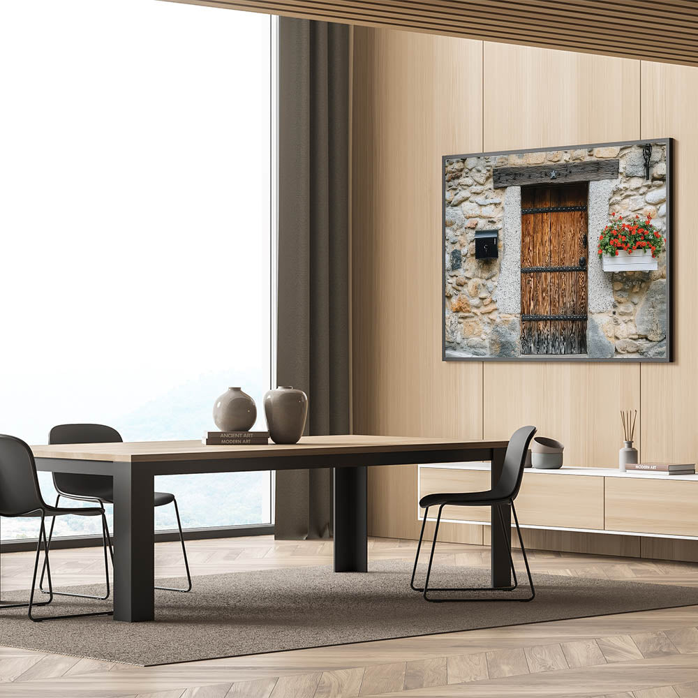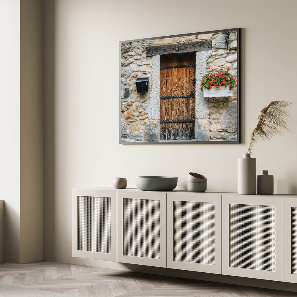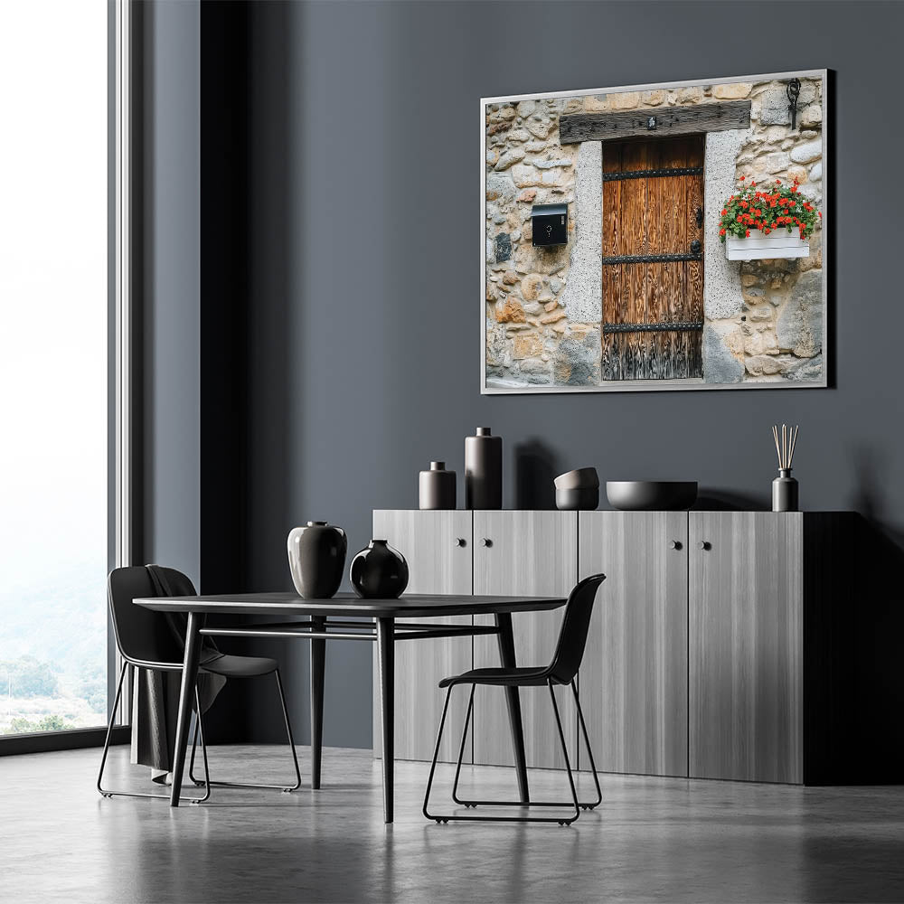 Elevate your farmhouse decor with this charming rustic wall art featuring a beautifully crafted wooden door surrounded by natural stone. The warm wood tones of the door contrast elegantly with the textured stone wall, while a vibrant flower box with red blooms adds a touch of lively color. This artwork captures the essence of countryside living, making it a perfect addition to rustic or farmhouse-inspired interiors.