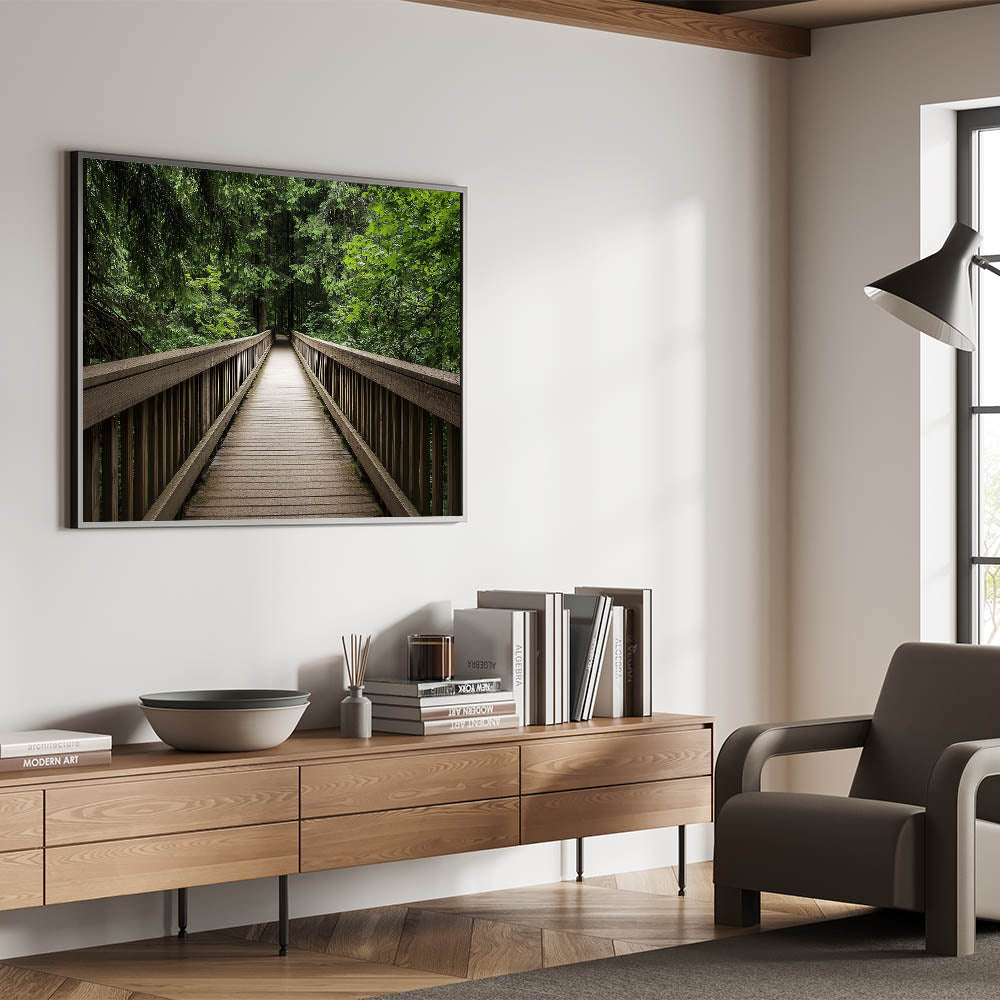 - Unique bridge art prints capturing the harmony of architecture and the forest's lush beauty.