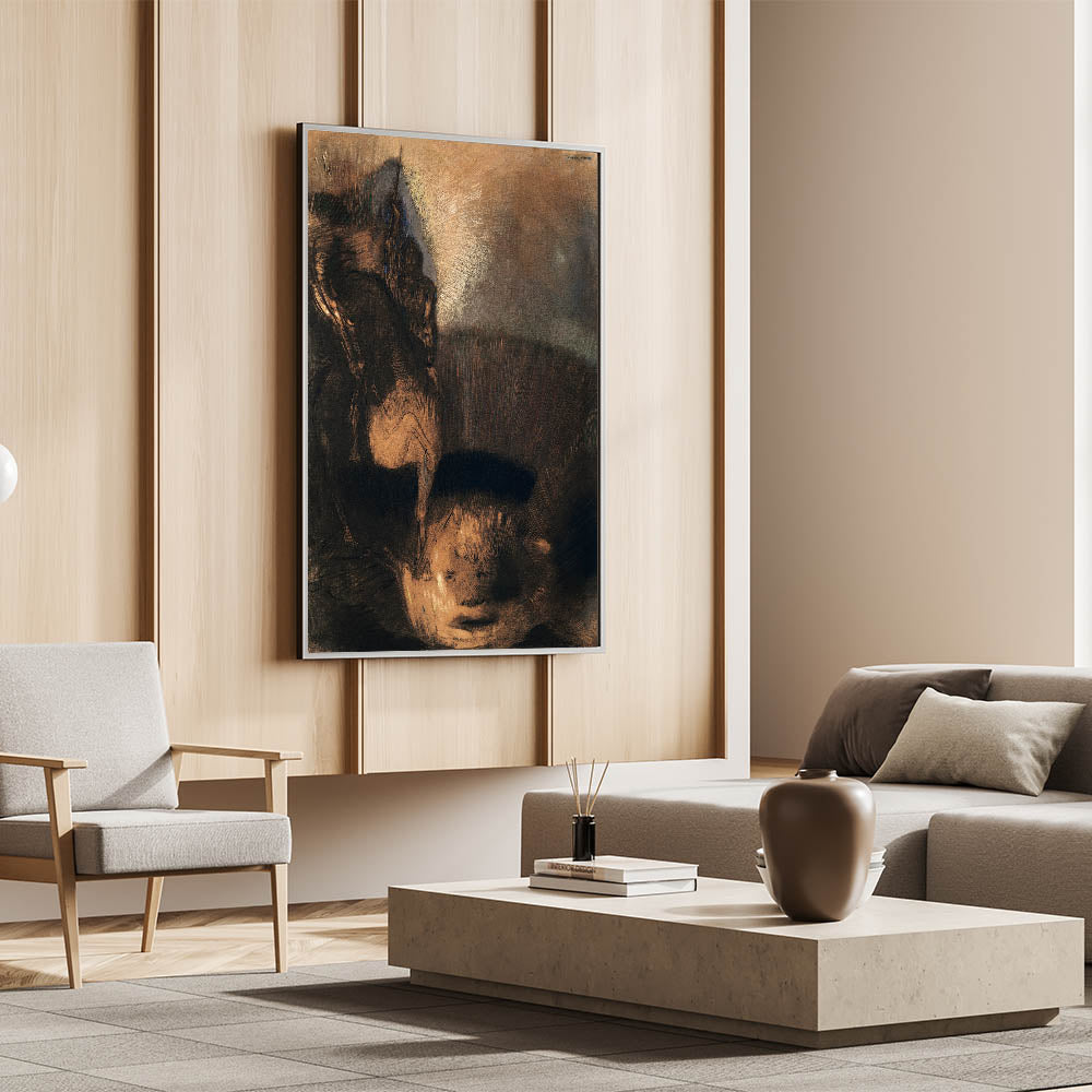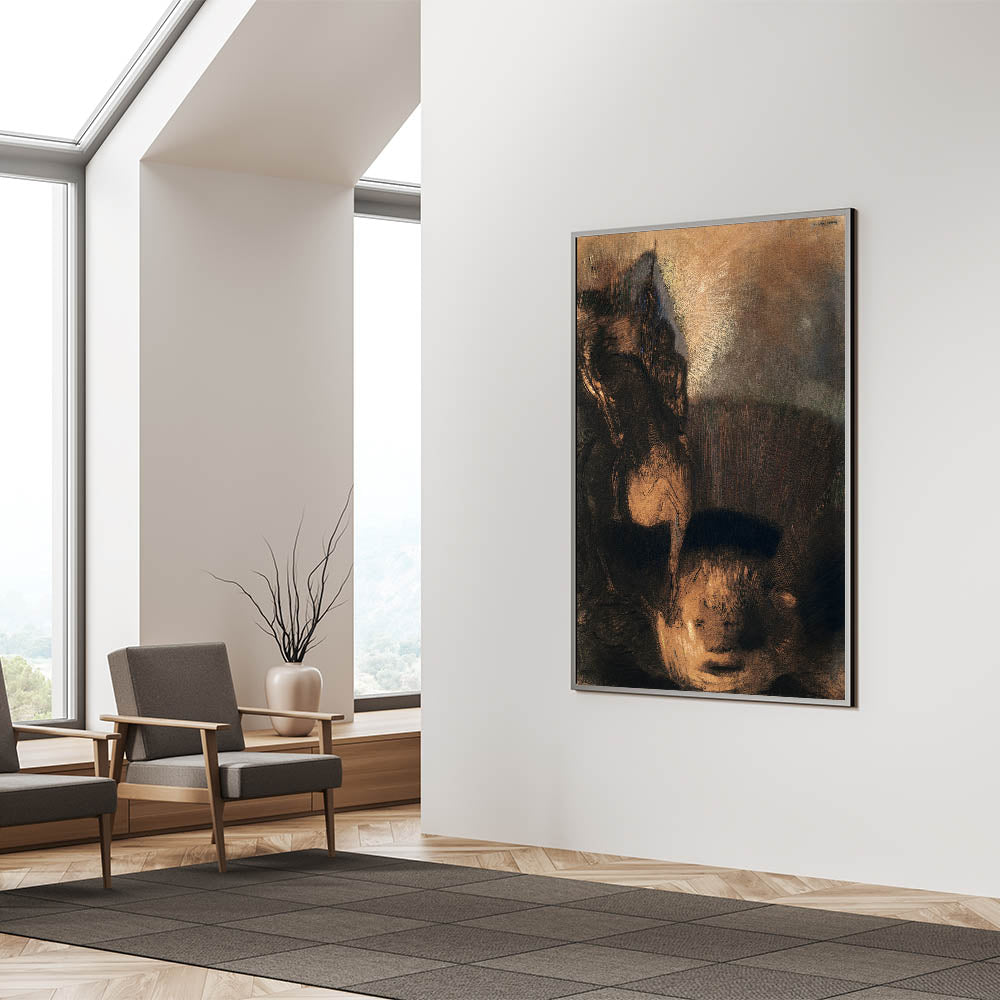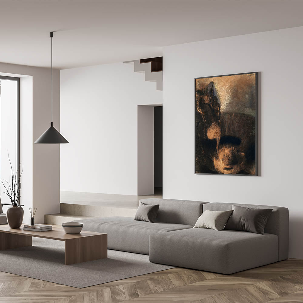 Add an air of mystery and heroism to your walls with the "Saint George and the Dragon Modern Wall Art." This evocative piece by Odilon Redon features a dreamlike interpretation of the legendary tale, rendered in rich shades of brown, black, and gold. Its soft, ethereal textures and abstract detailing make it a unique addition to minimalist modern decor, ideal for creating a dramatic focal point.