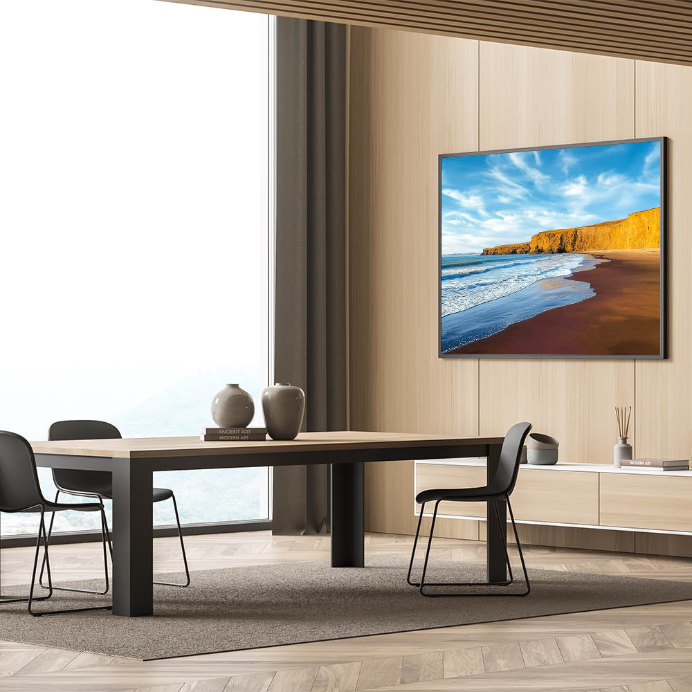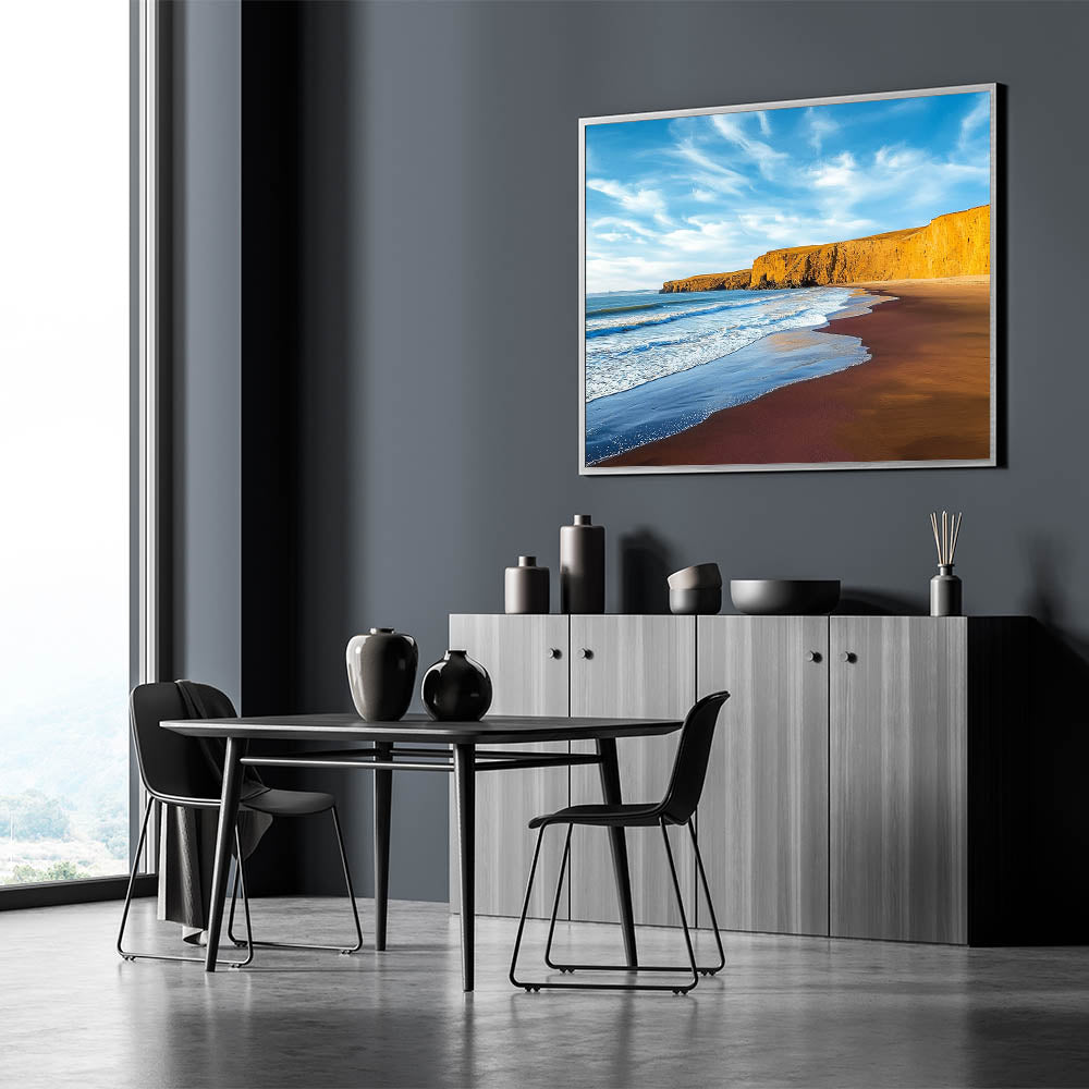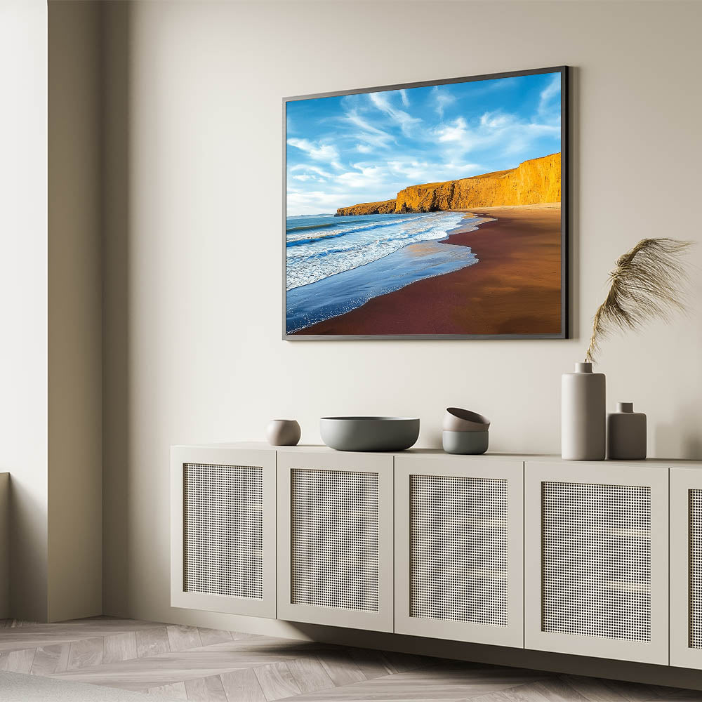 Transform your space with this stunning cliffs wall art featuring a breathtaking beachside landscape. The vibrant hues of golden cliffs, tranquil waves, and a deep blue sky bring nature's beauty into your home, creating a serene ambiance.