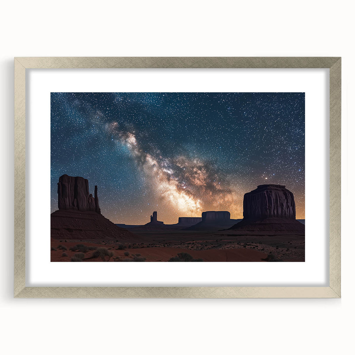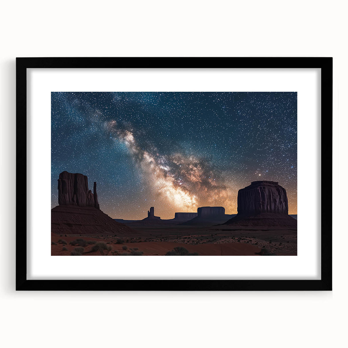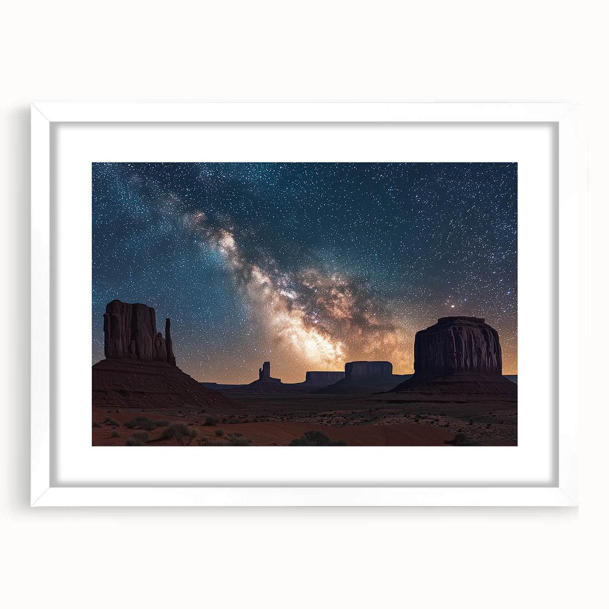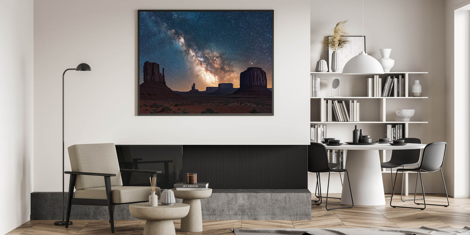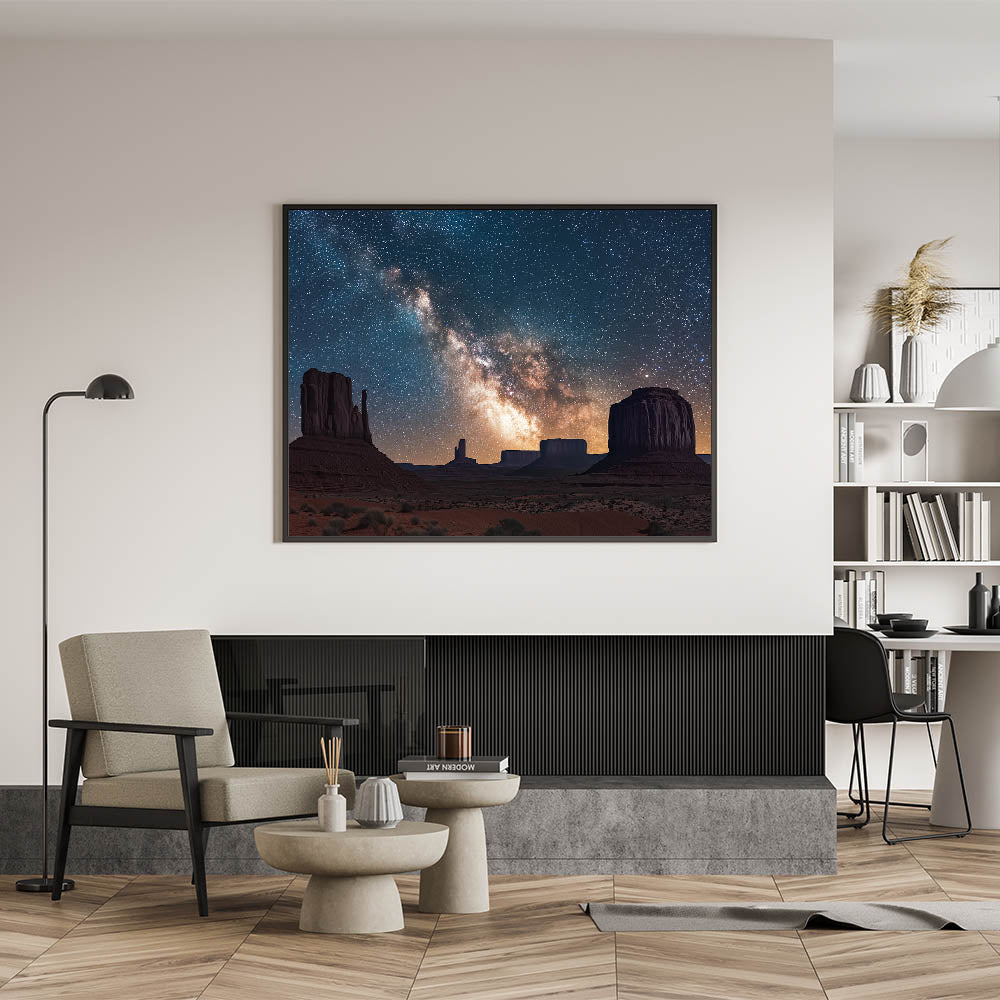 Step into the mesmerizing beauty of the night with this breathtaking wall art featuring Monument Valley’s iconic cliffs under a star-filled sky. The Milky Way arcs magnificently across the heavens, casting subtle light over the desert landscape. This artwork captures the serene beauty of nature’s vastness and is perfect for stargazers and adventurers alike.