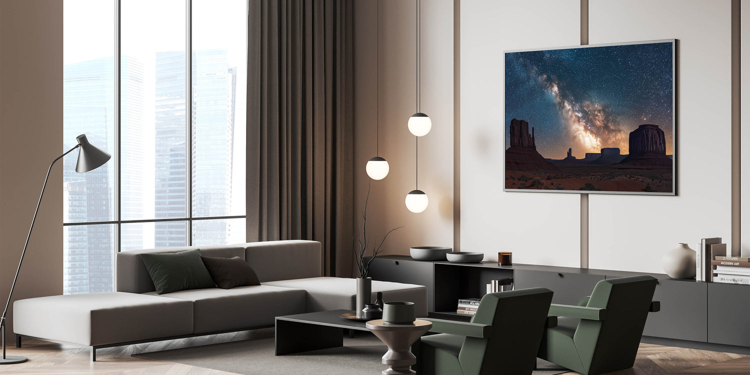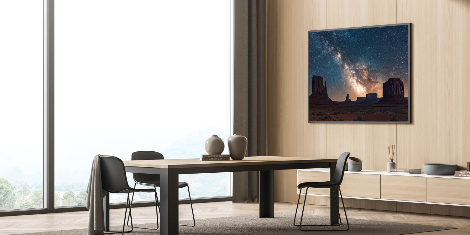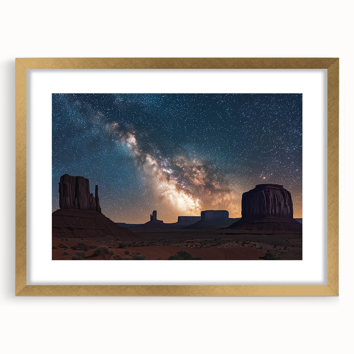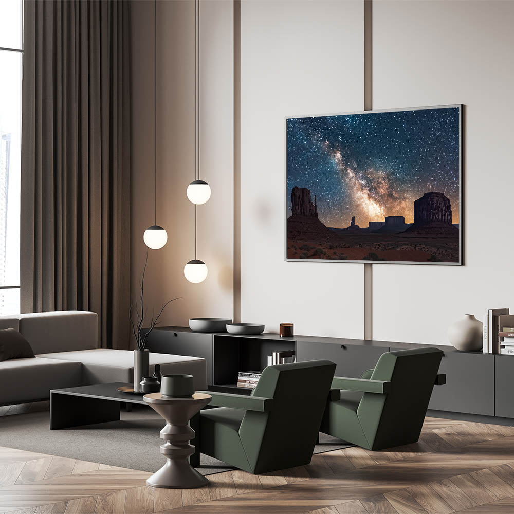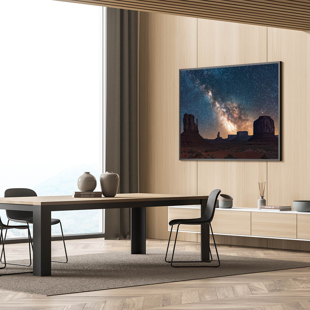 Step into the mesmerizing beauty of the night with this breathtaking wall art featuring Monument Valley’s iconic cliffs under a star-filled sky. The Milky Way arcs magnificently across the heavens, casting subtle light over the desert landscape. This artwork captures the serene beauty of nature’s vastness and is perfect for stargazers and adventurers alike.