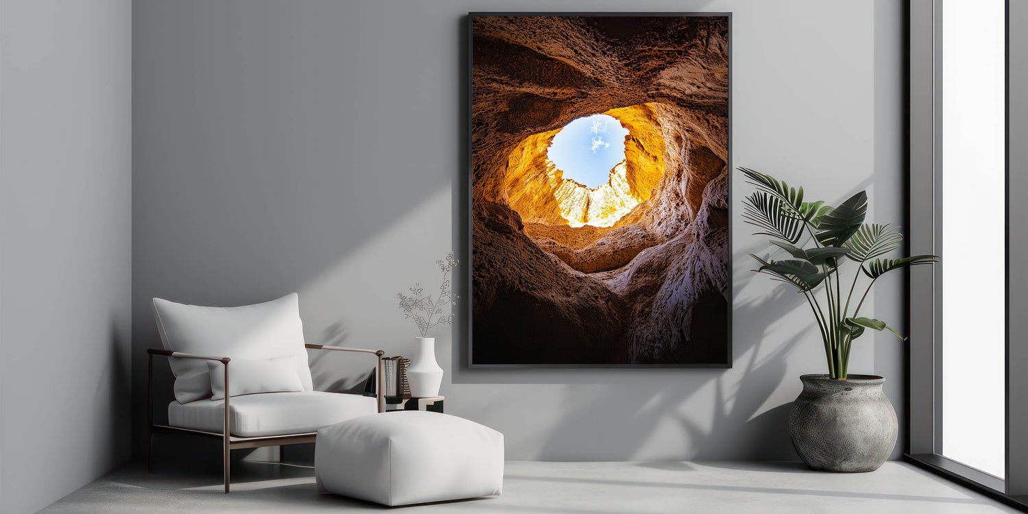 Transform your home or office with this unique piece of cave wall art. Its captivating natural beauty adds a sense of depth and serenity to any room, whether displayed in a living area, office, or study. Available in various formats, including rolled canvas and framed acrylic glass, this versatile artwork enhances any decor style.