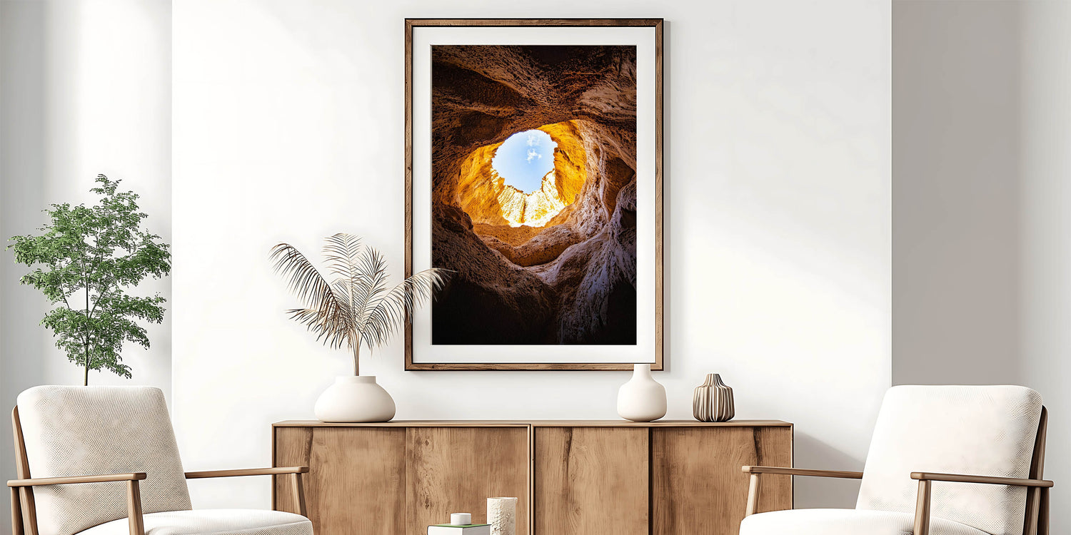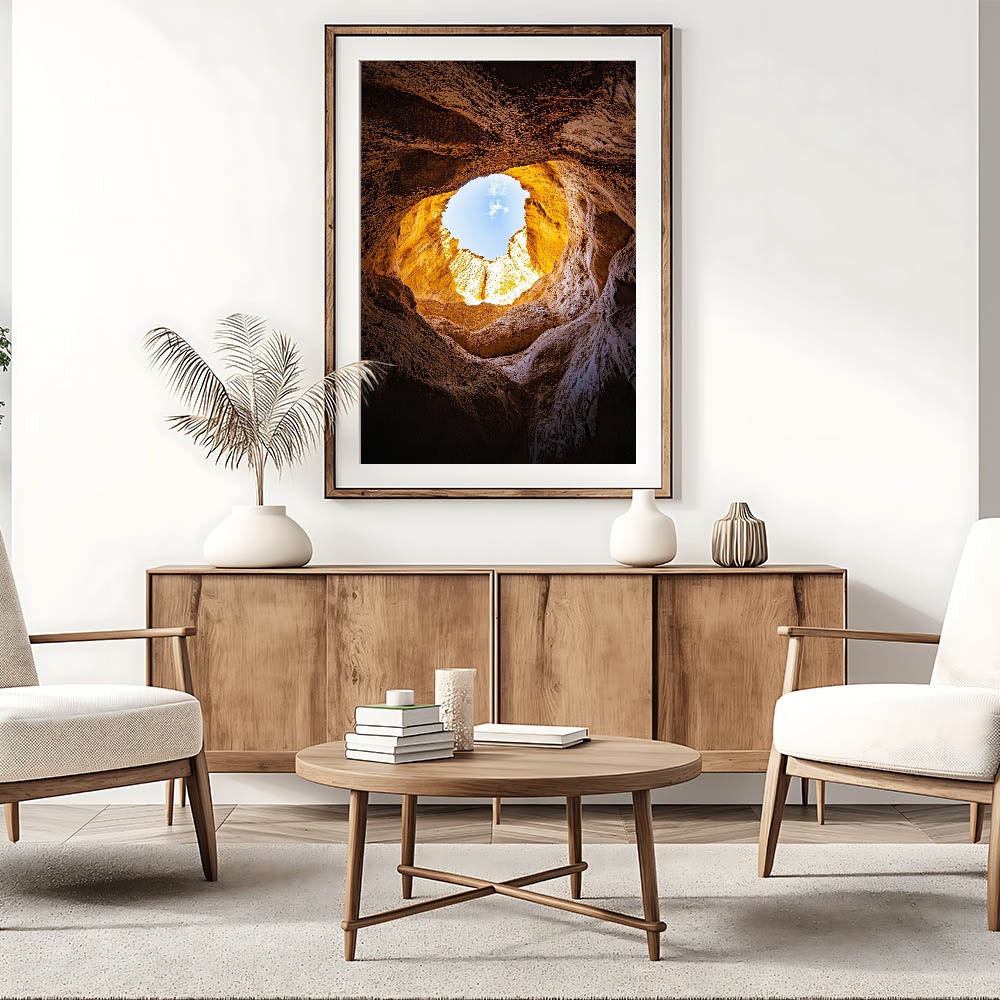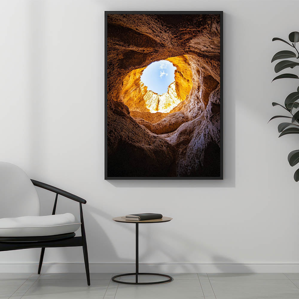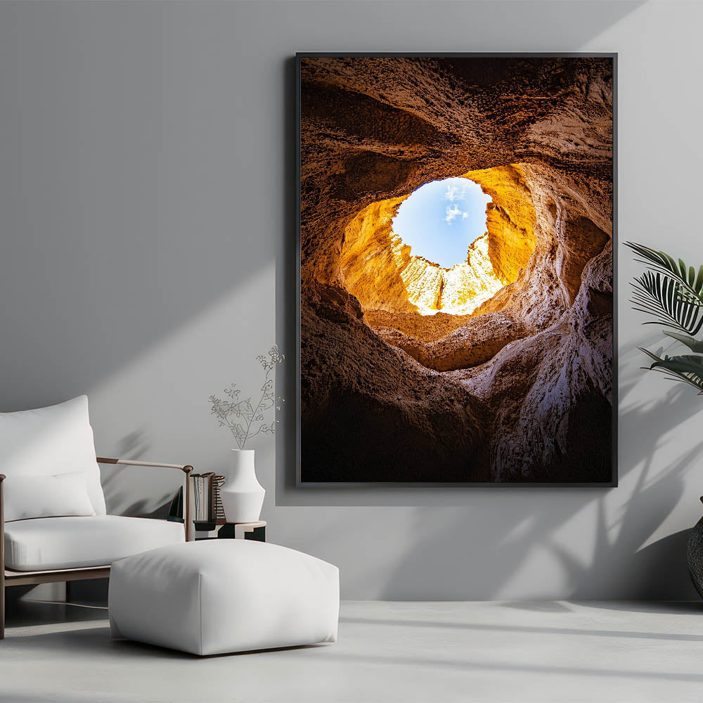 Step into the wonder of nature with this breathtaking cave art print. Featuring a dramatic upward view of a cave opening, this stunning photograph highlights the rugged textures of the cave walls and the brilliant blue sky above. The warm golden tones of the cave contrast beautifully with the crisp light streaming in, creating a harmonious blend of earth and sky. This wall art is an excellent choice for nature lovers and those looking to add a unique focal point to their decor.