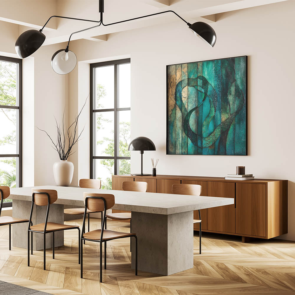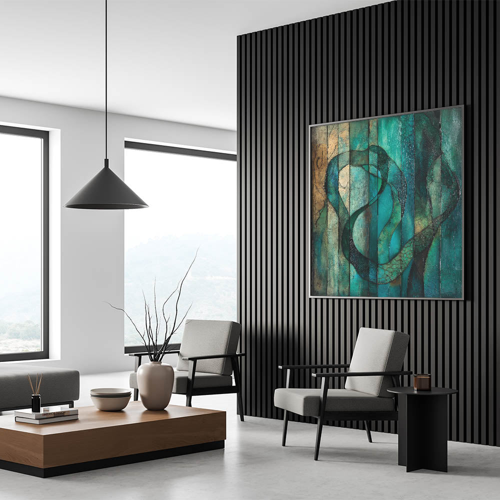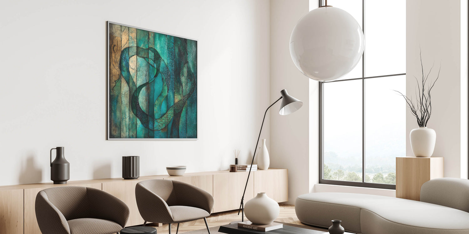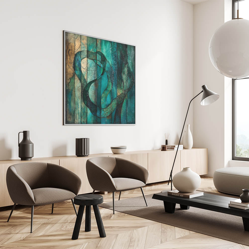 Add depth and elegance to your interior with this Teal Abstract Figurative Art, a stunning visual exploration of flowing shapes and earthy tones. Featuring deep teal, black, and rustic brown hues intertwined with organic patterns, this artwork combines modern abstraction with a touch of rustic charm.
