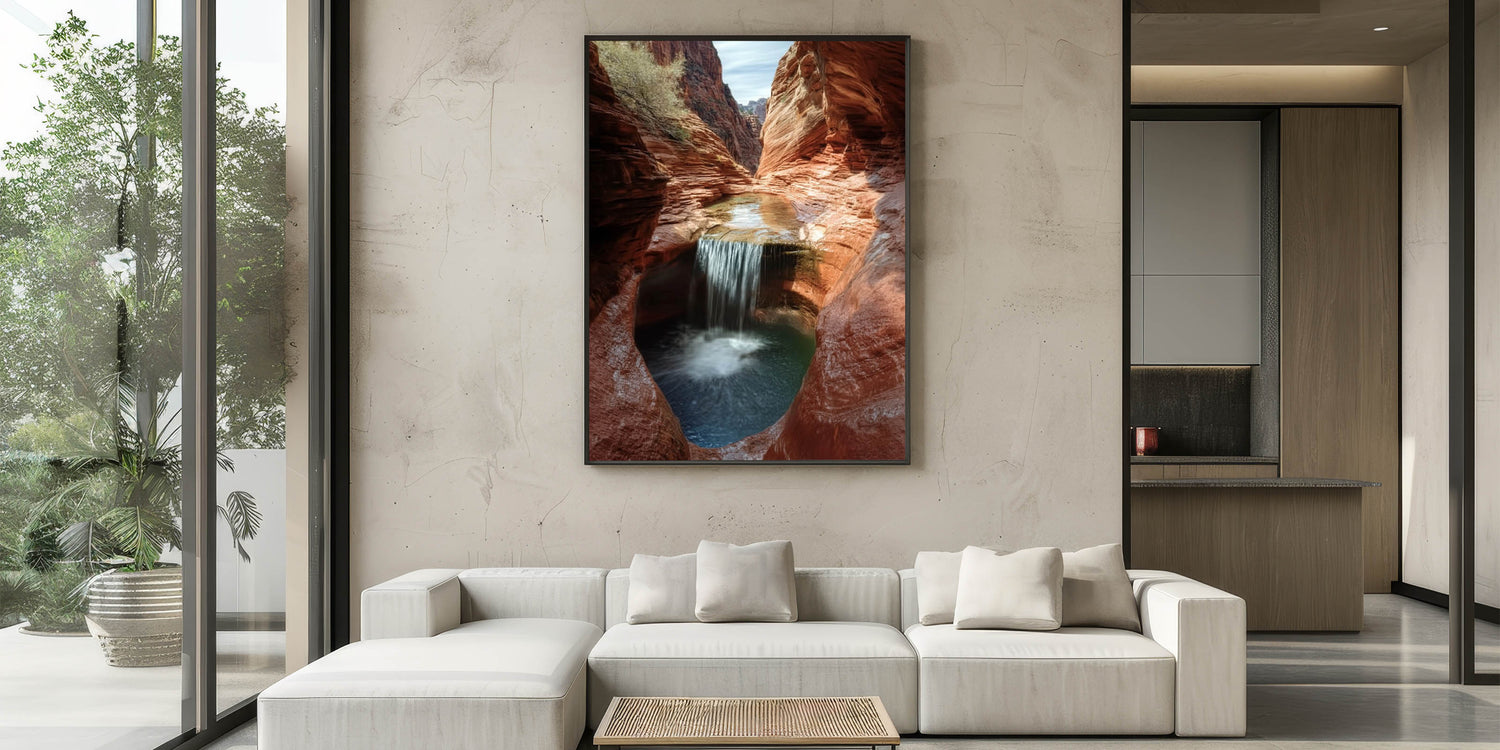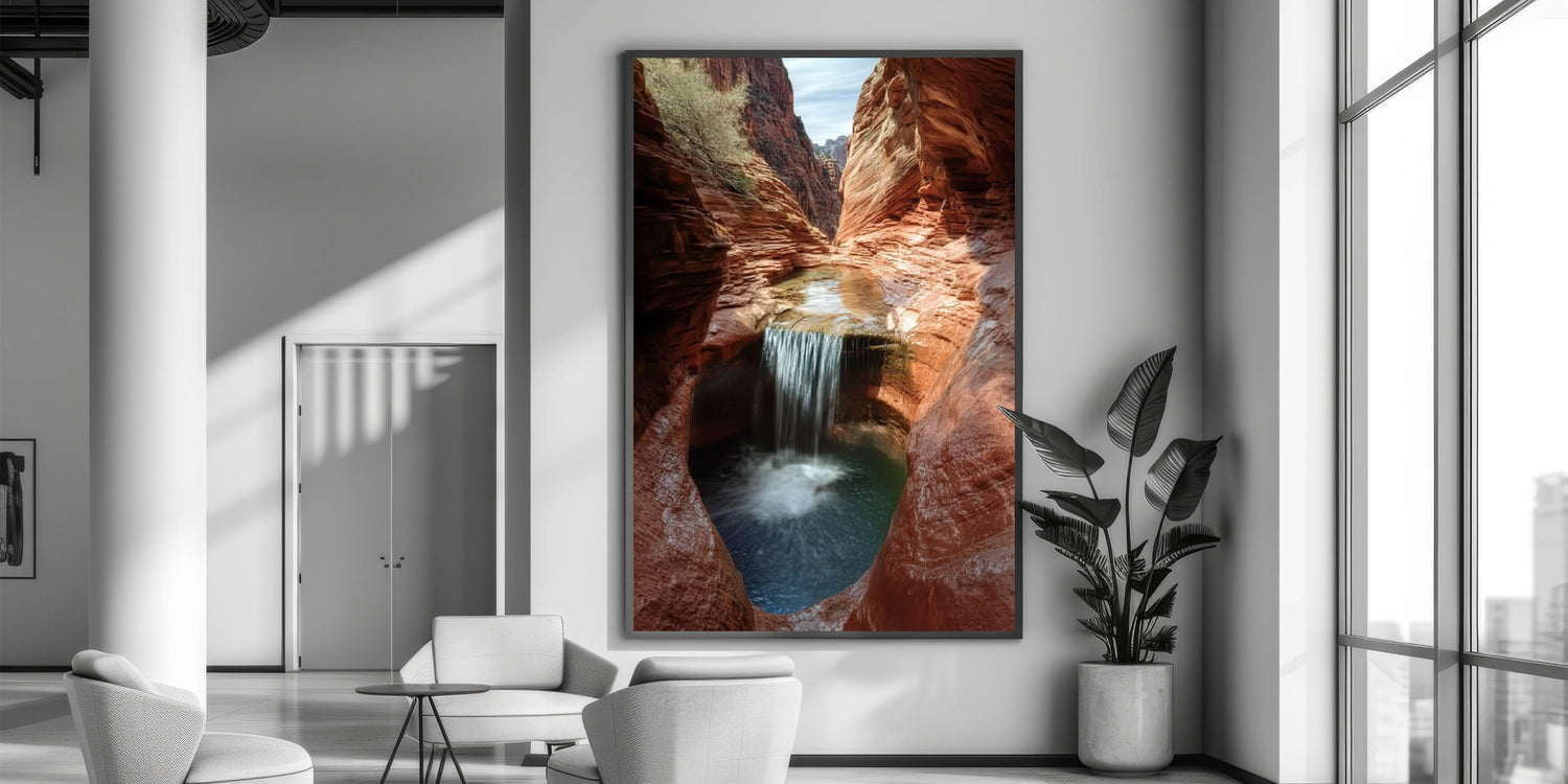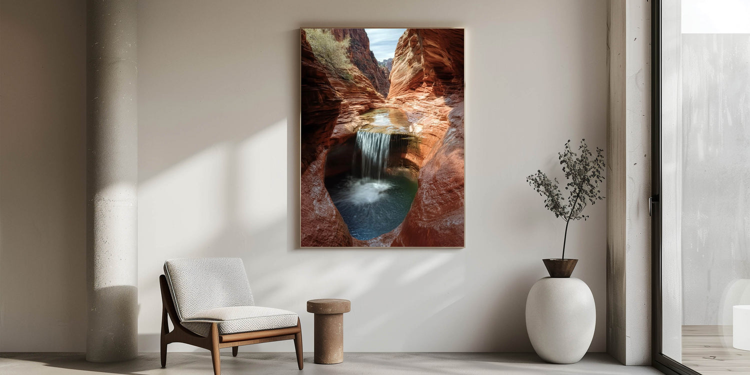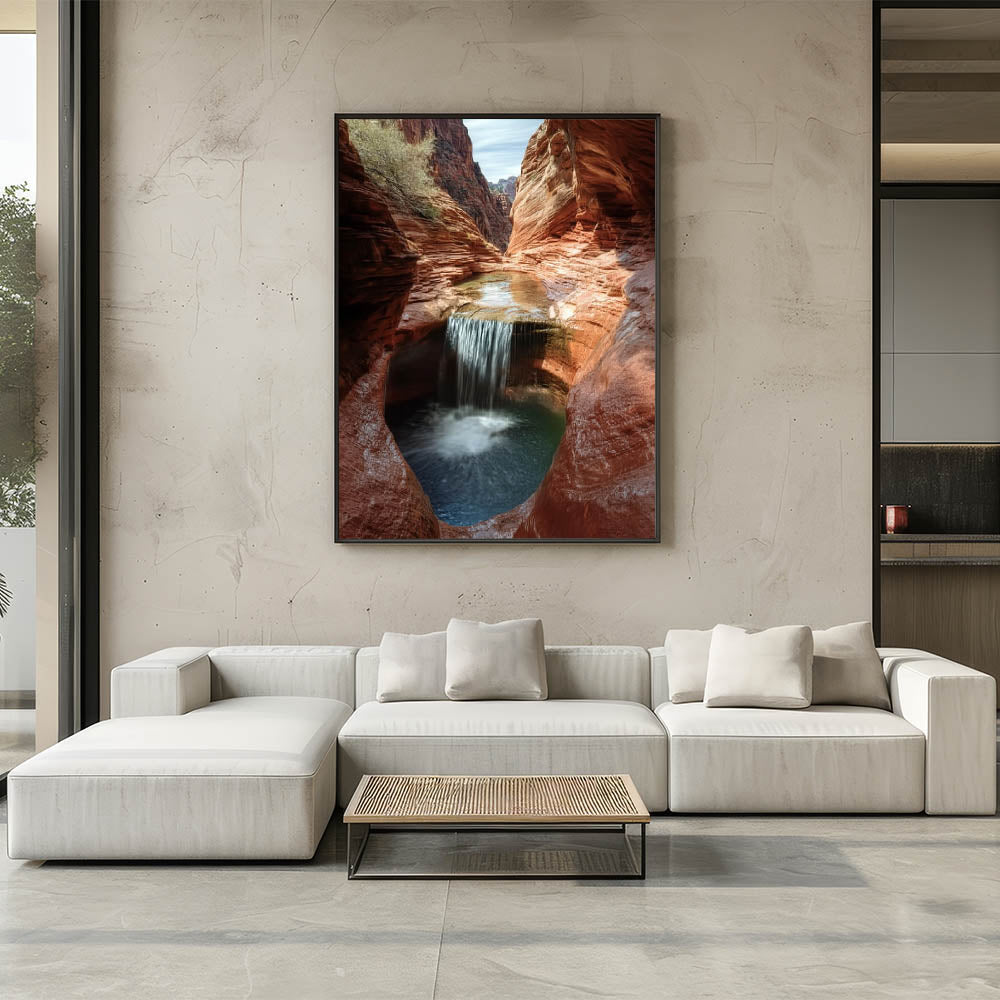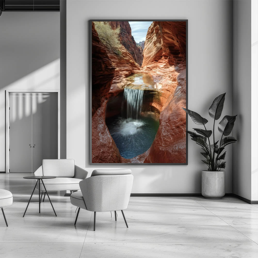 Transform your decor with the timeless elegance of this canyon waterfall artwork. Perfect for nature enthusiasts and art lovers, it enhances any space with its tranquil and scenic beauty. Explore our collection today to bring this captivating masterpiece to your home or office.