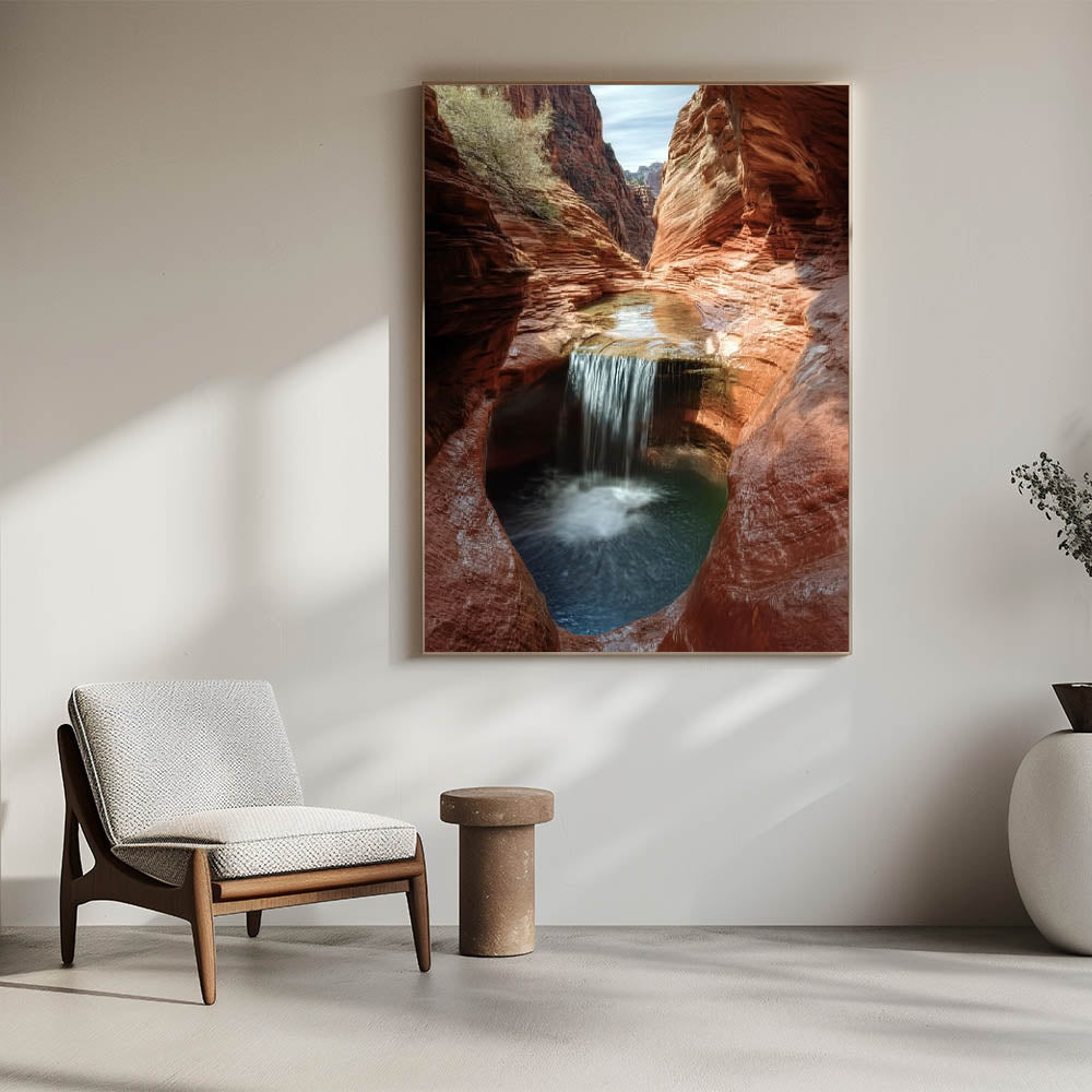 Immerse yourself in nature's serenity with this Tranquil Canyon Waterfall Art. This stunning artwork captures the cascading beauty of a pristine waterfall nestled within vibrant sandstone canyon walls. The natural interplay of flowing water, textured rock formations, and soft sunlight creates a calming and rejuvenating atmosphere. Perfect for living rooms, offices, or bedrooms, this piece brings the soothing essence of nature into your space.