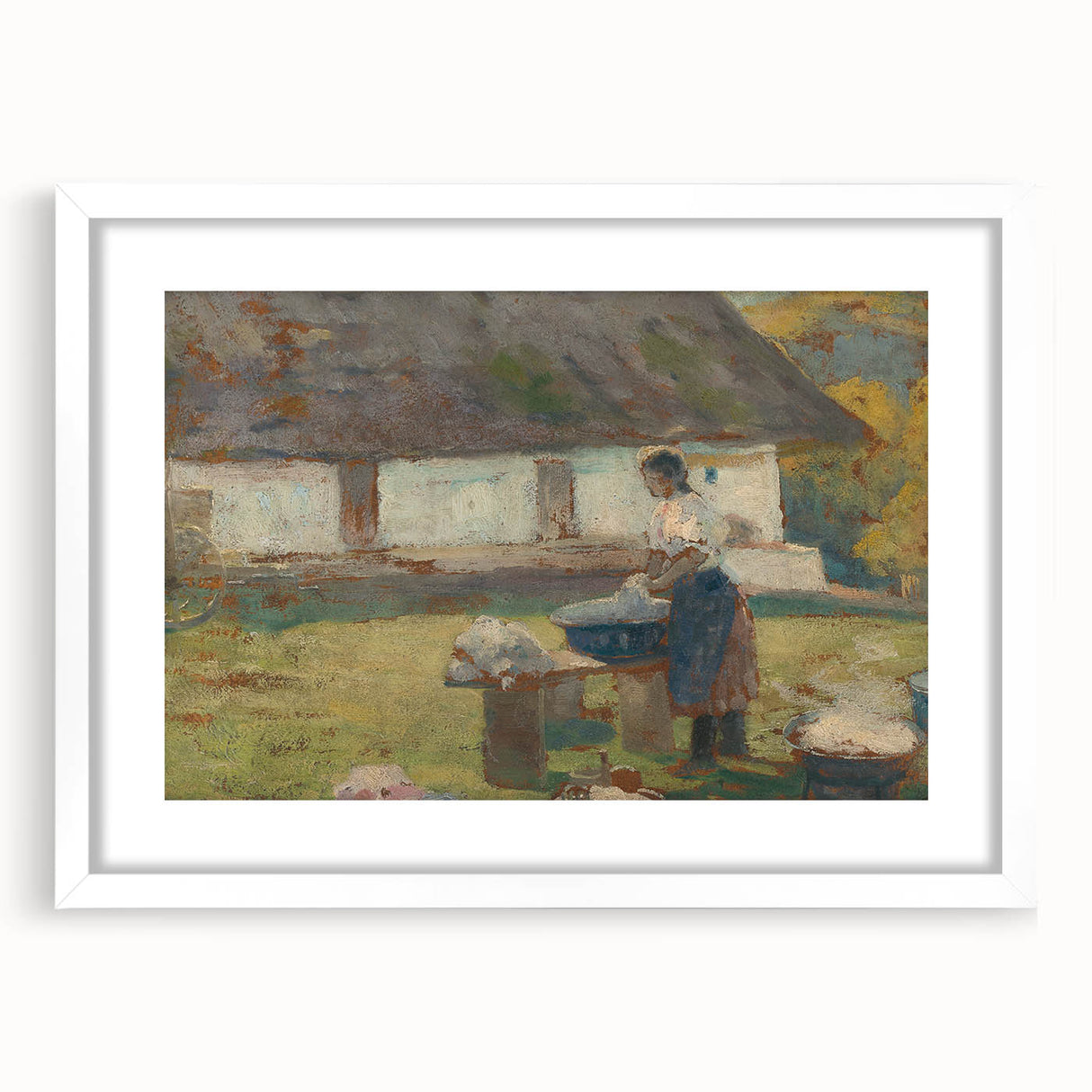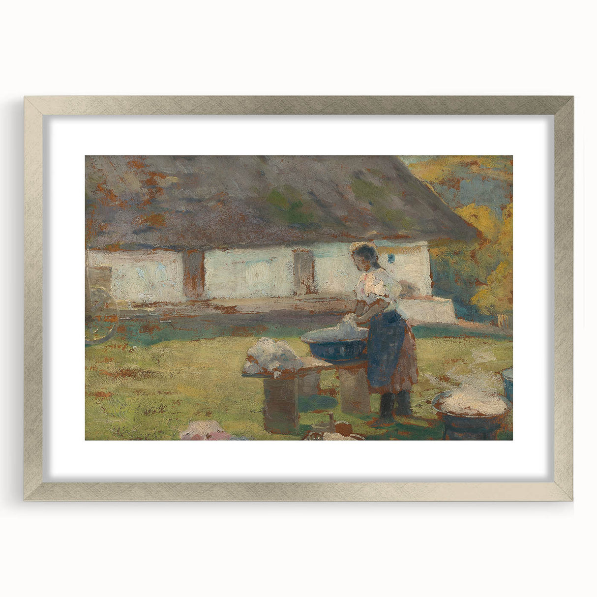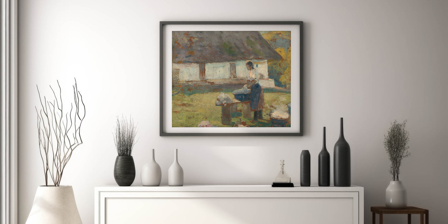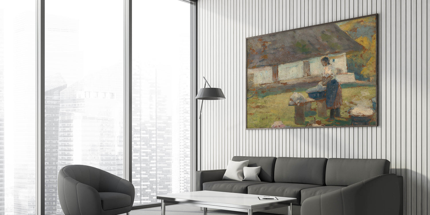 Immerse yourself in the tranquil simplicity of rural life with Lajos Csordák's Washing Scene. This Impressionist masterpiece captures a moment of quiet labor, where a woman washes clothes in a picturesque countryside setting. The earthy tones and textured brushwork beautifully convey the rustic charm of the scene, evoking nostalgia and admiration for simpler times
