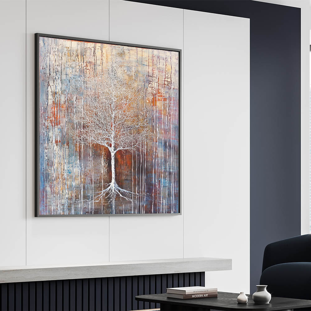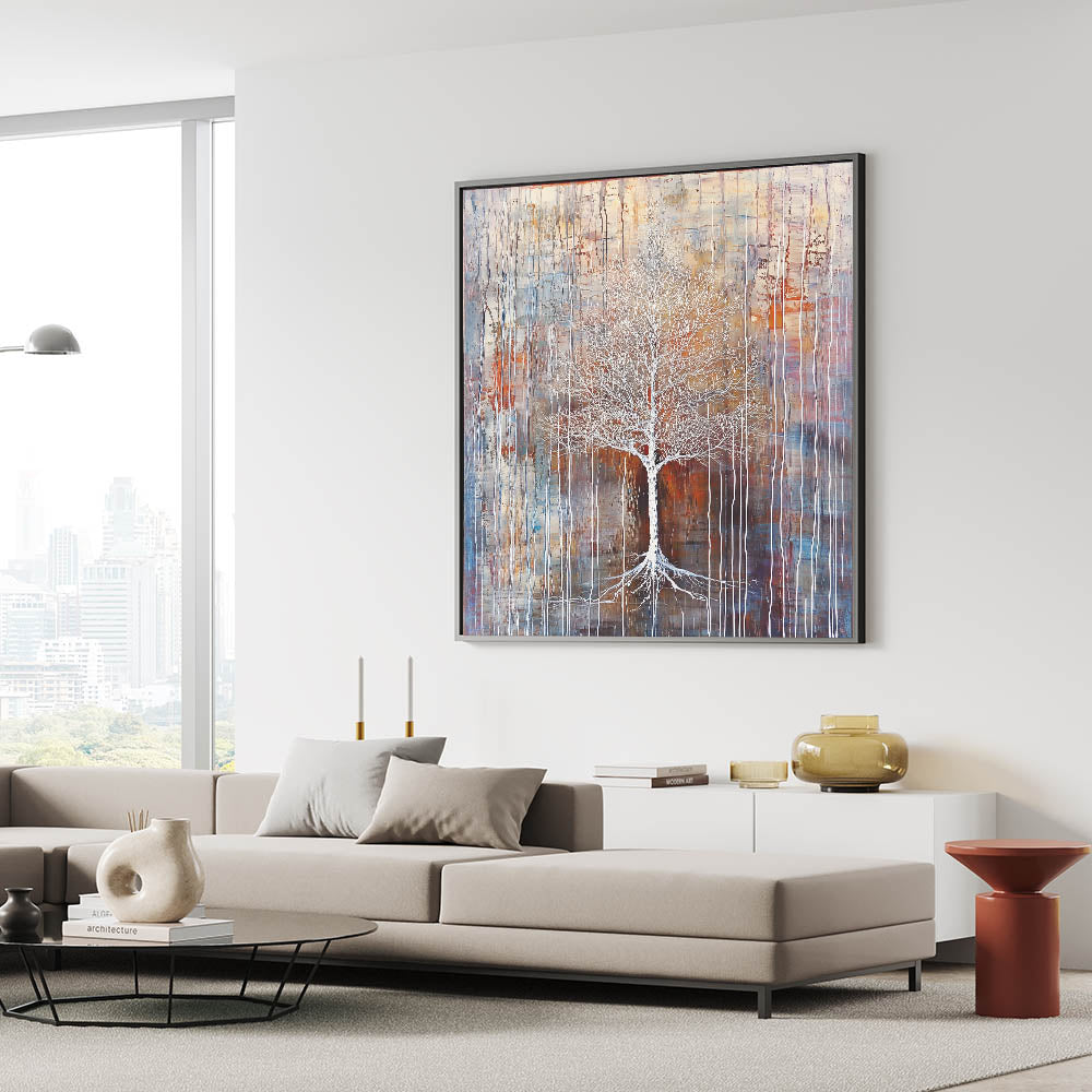Infuse your space with the beauty of nature and abstract art through this captivating depiction of a white tree of life. Set against an earthy, textured background with streaks of blue, orange, and brown, this artwork embodies harmony and creativity, making it an exceptional choice for both modern and rustic interiors.