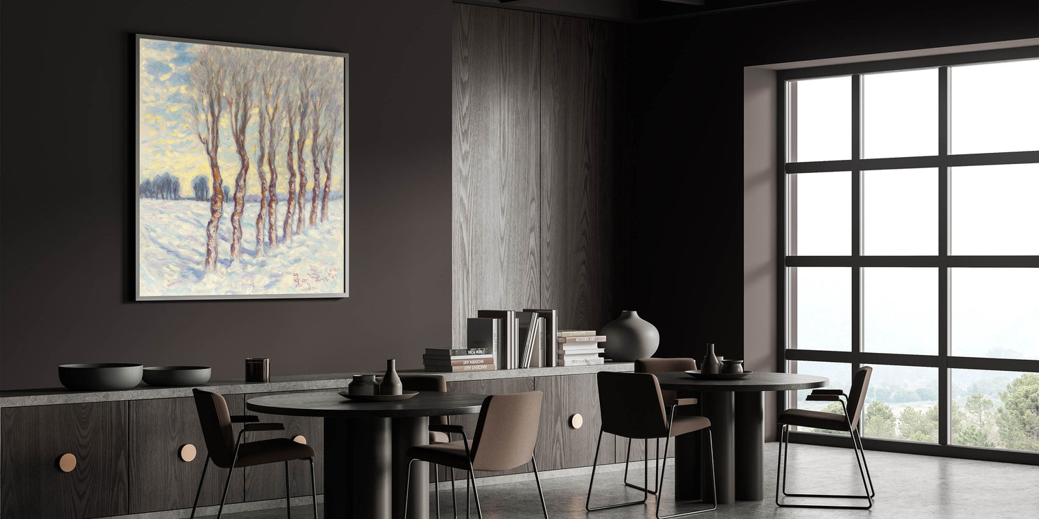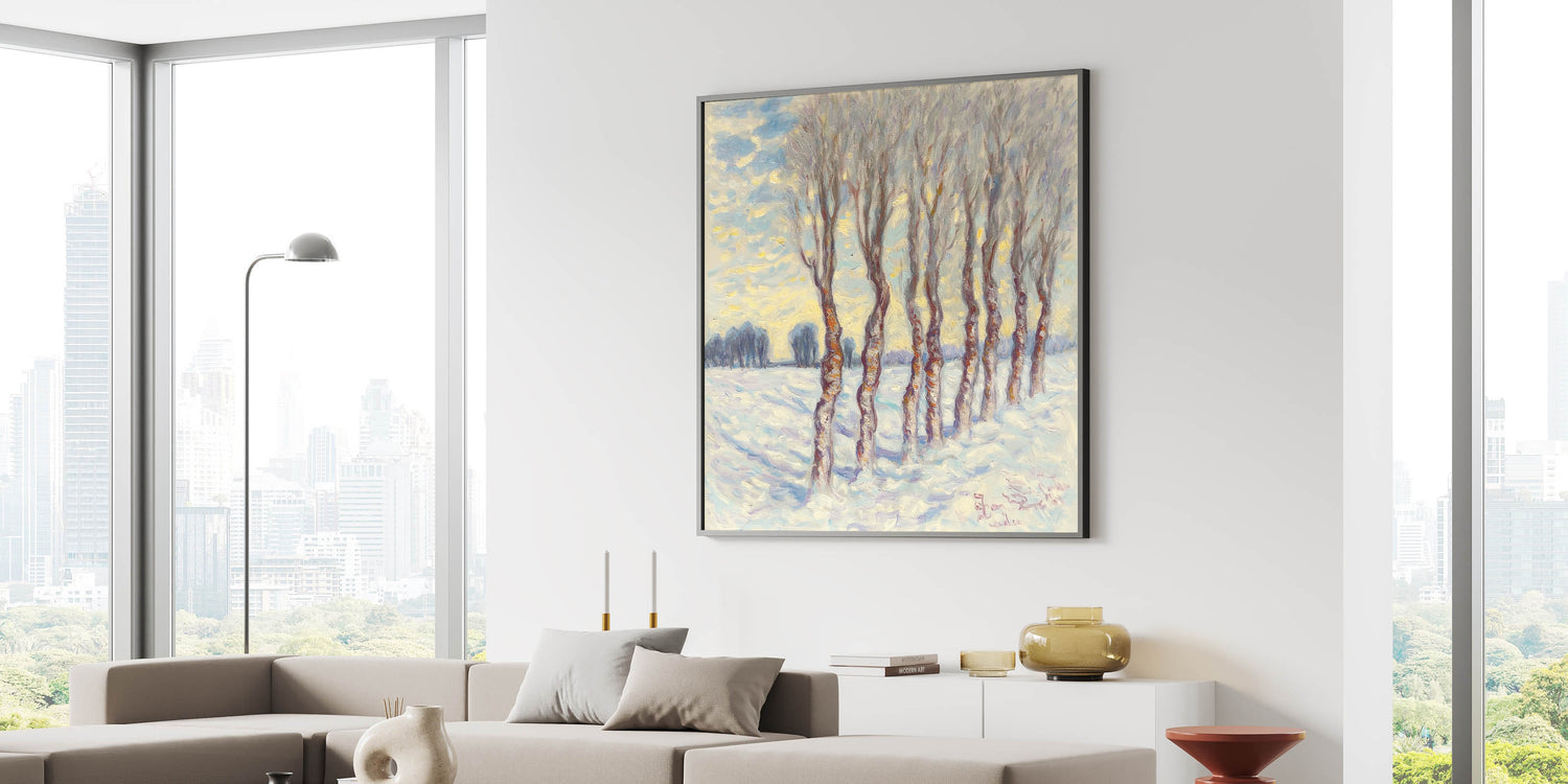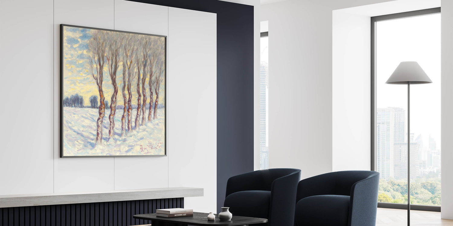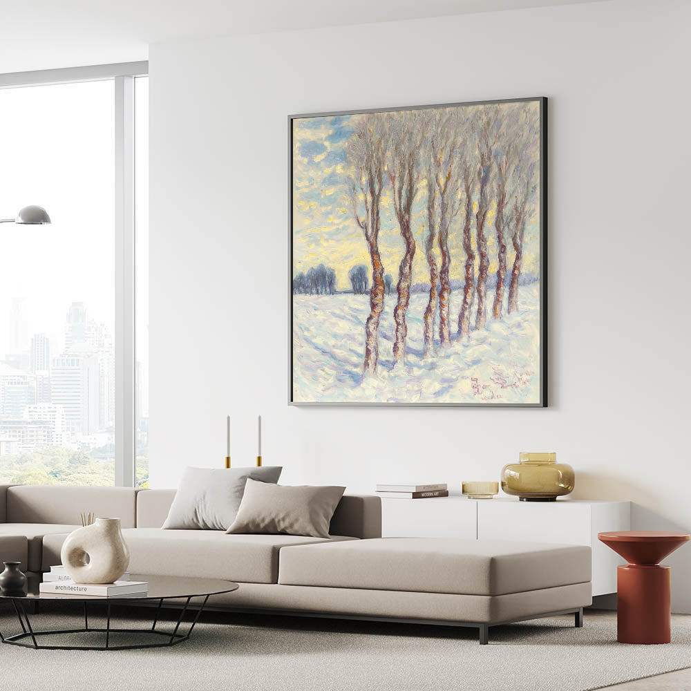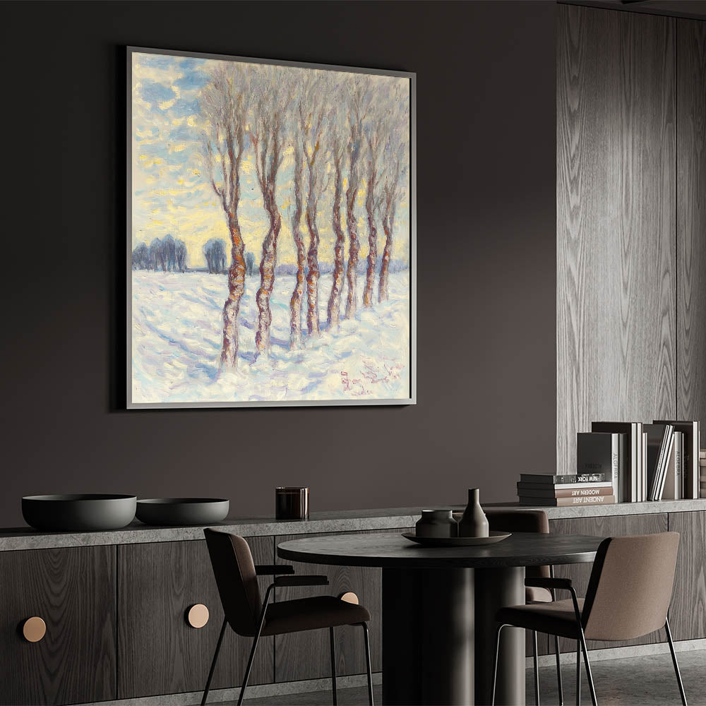 This abstract winter grove captures the quiet elegance of a snowy forest, evoking feelings of peace and reflection. Whether displayed as a centerpiece or part of a gallery wall, it brings timeless beauty and sophistication to your decor.