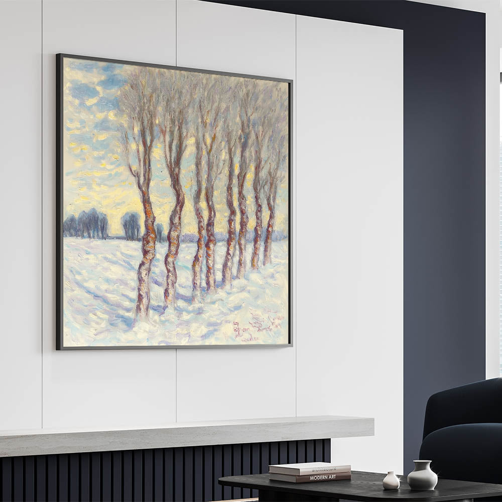 Step into the serene beauty of a snowy landscape with this enchanting abstract floral artwork, showcasing a grove of slender trees under a soft blue and white winter sky. The impressionistic brushstrokes and warm brown tree trunks add a touch of warmth to the cool, tranquil setting, making this piece perfect for modern, rustic, or classic interiors.