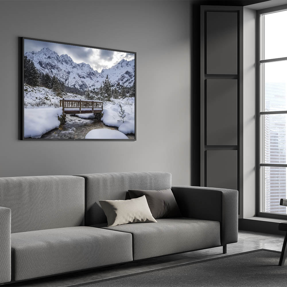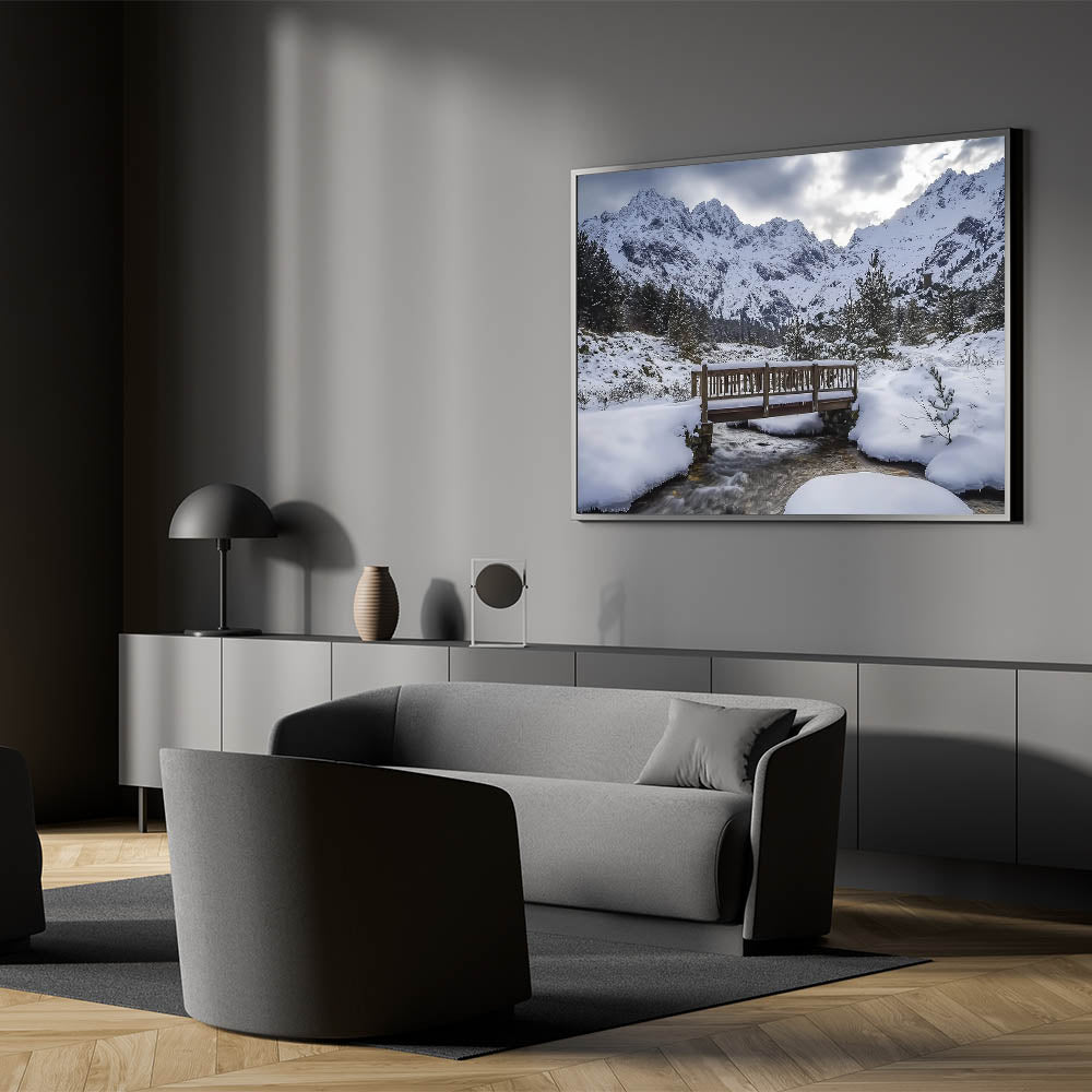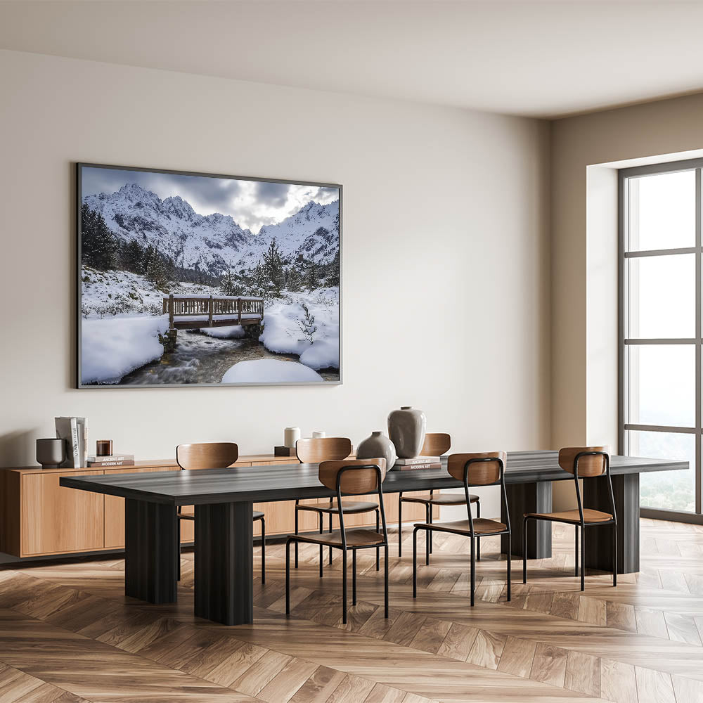 Ideal for lovers of winter landscapes and scenic bridge photography, this artwork is a timeless addition to any space. Its tranquil composition and muted tones make it versatile for modern or rustic decor. Transform your home or office with this enchanting winter mountain bridge art today.