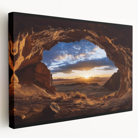• Stretched canvas art depicting a serene landscape with caves, showcasing earthy tones and intricate details, ideal for enhancing home decor and creating a tranquil atmosphere.